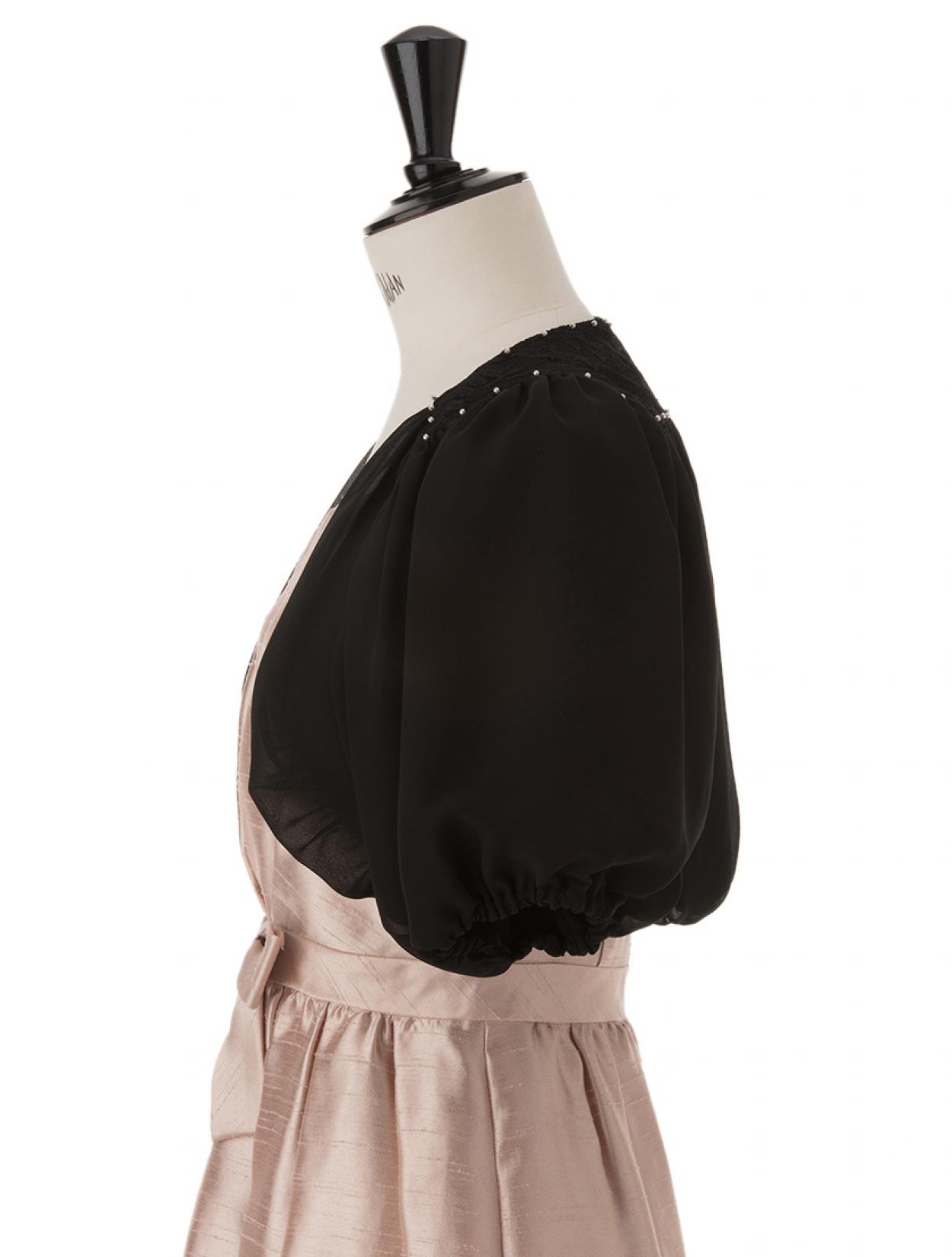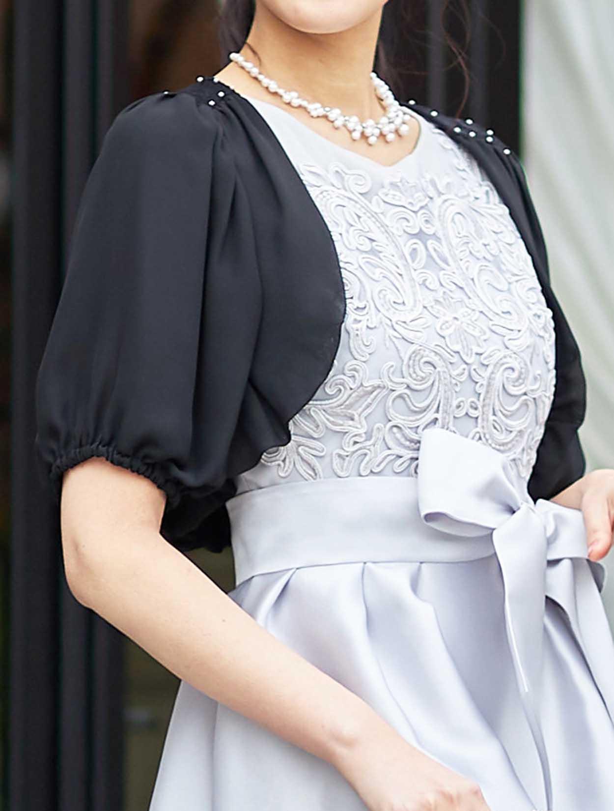■襟ぐりの部分にレースとパールをあしらったボレロ。ふんわり軽い印象になります。