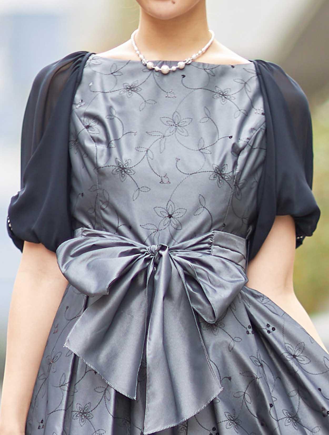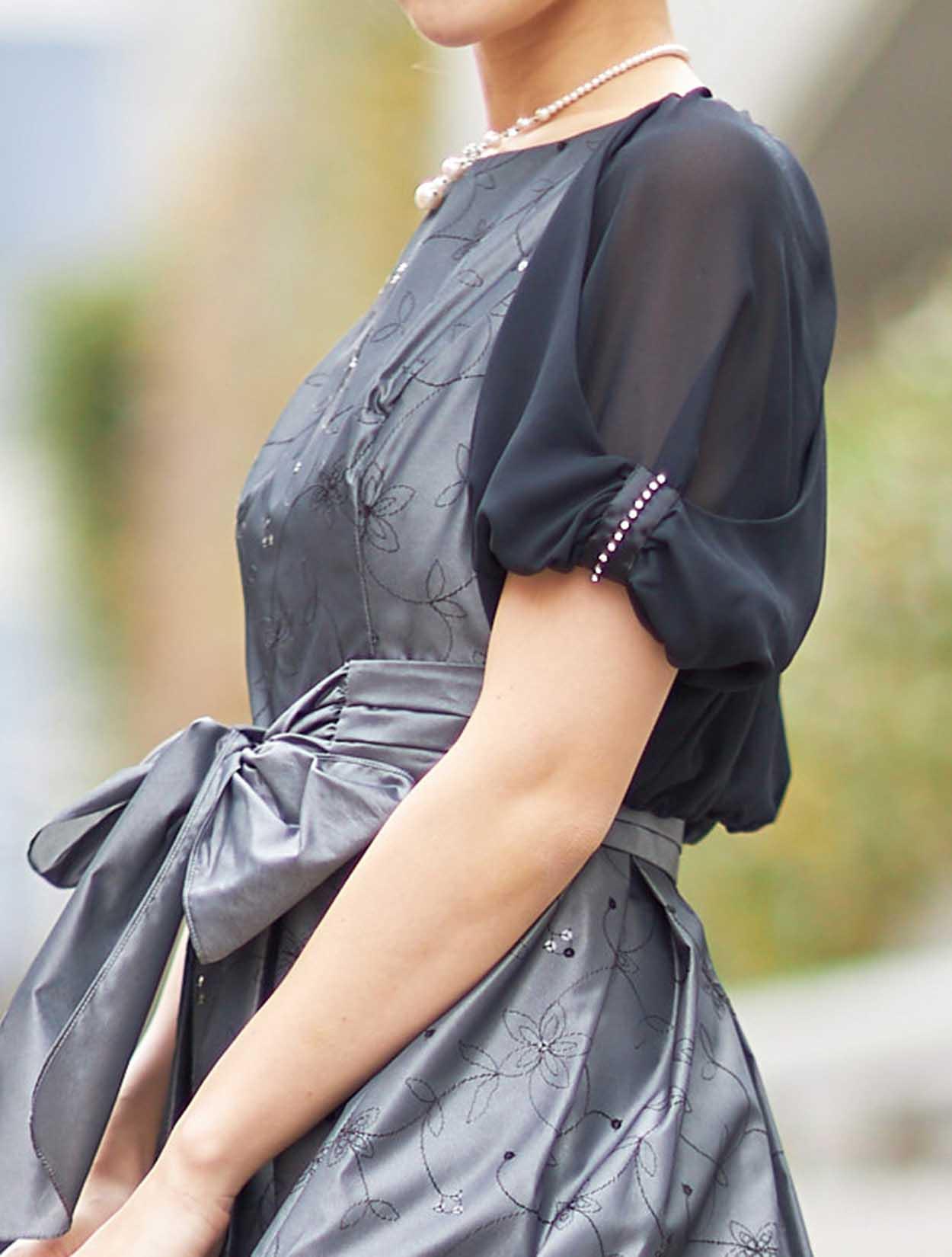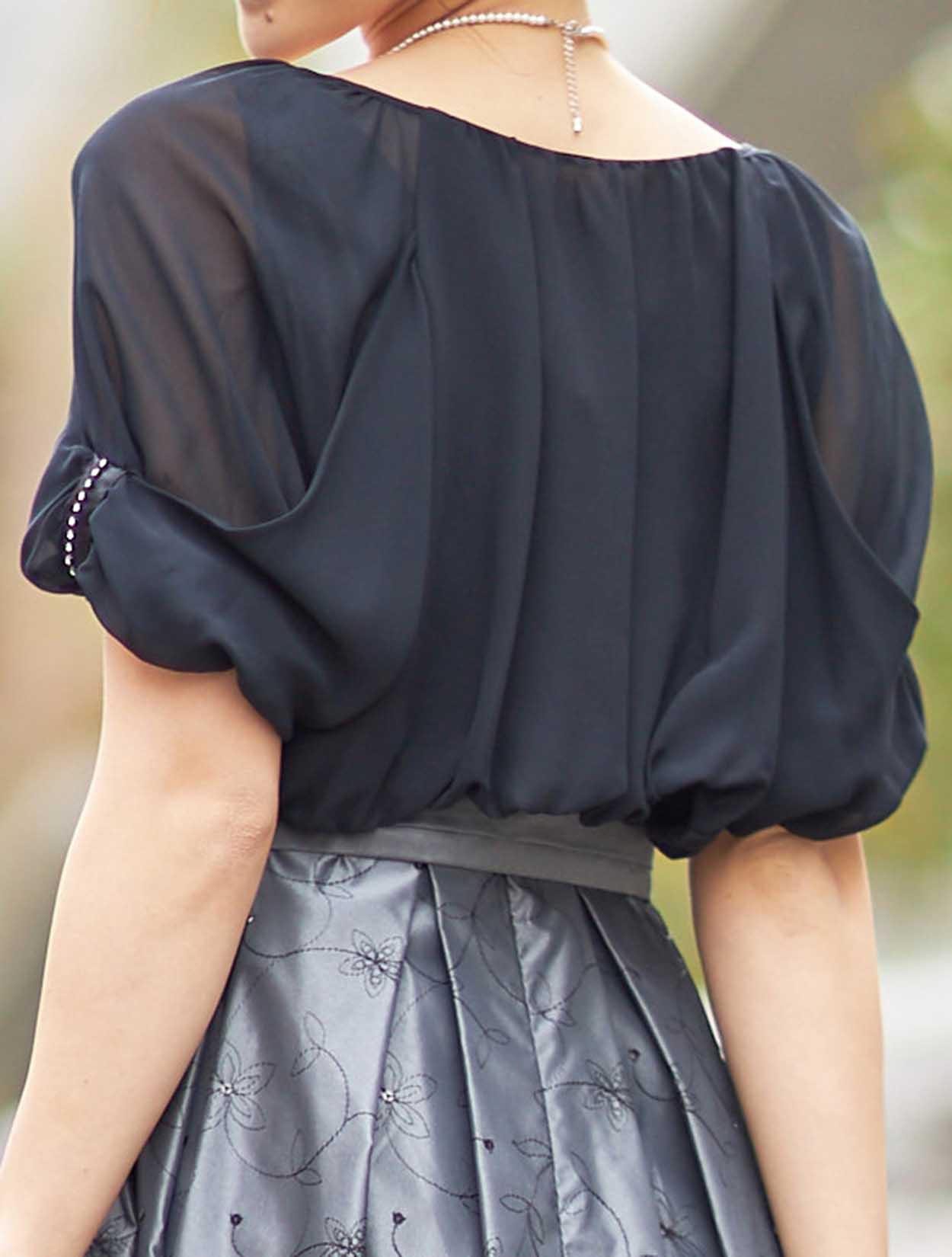 ■長めの袖丈が嬉しい、シフォン素材のボレロです。袖口のリボンとラインストーンがポイントです。