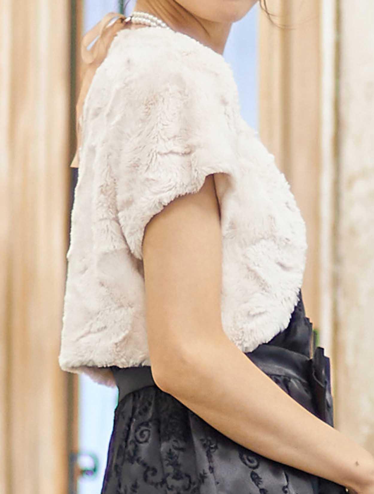 ■取り外し可能なパールチェーン付きのふわっと可愛いフェイクファーのボレロ。