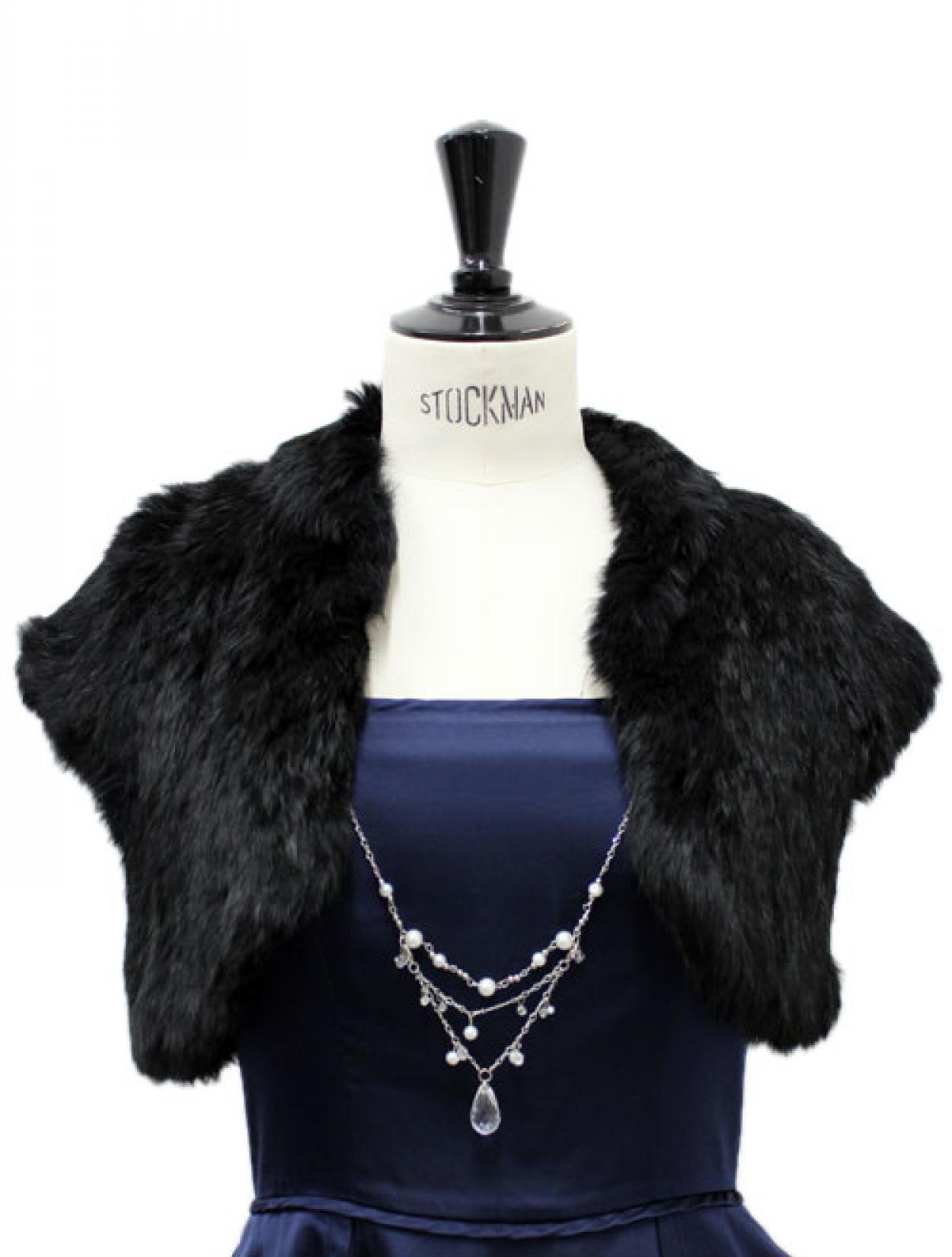 ■取り外し可能な華やかなビーズチェーン付きのラビットファーボレロ。
