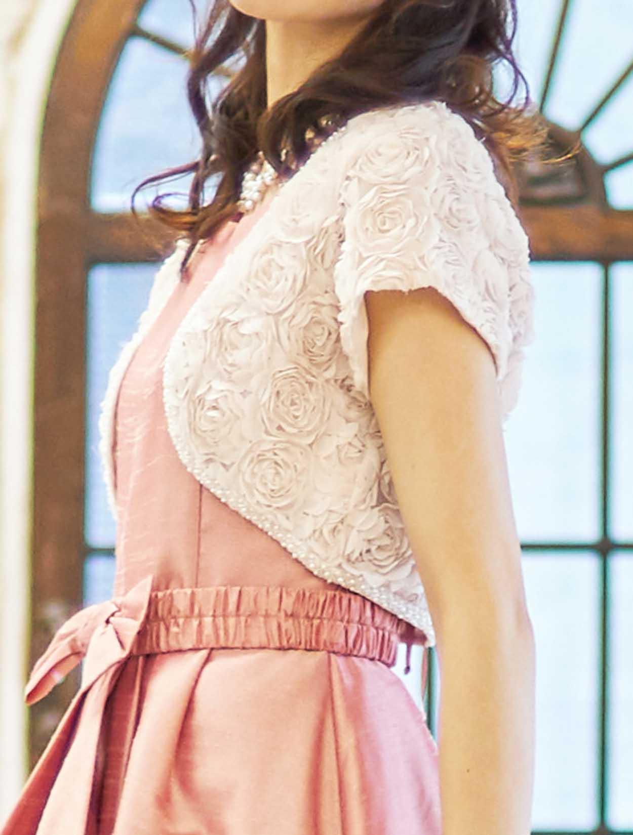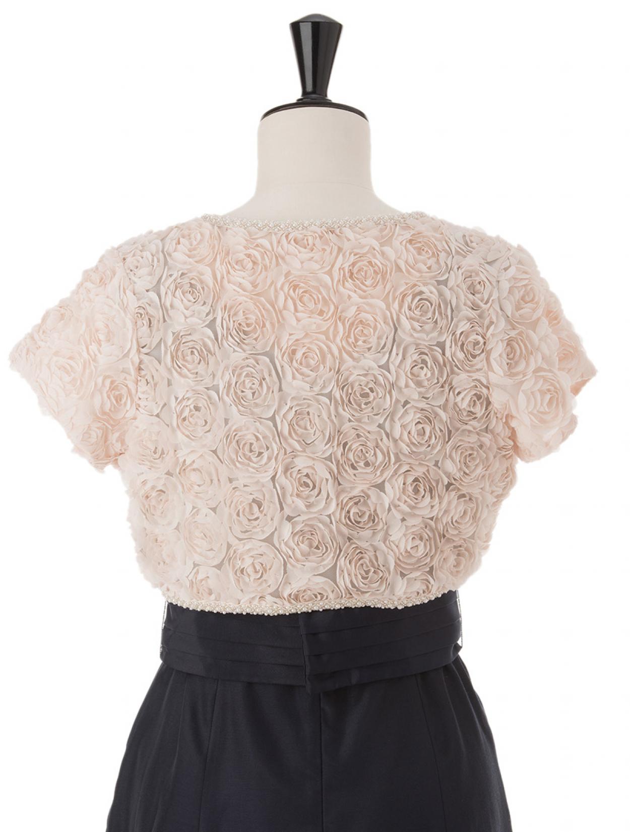 ■かわいいバラモチーフを身頃全面にあしらい、パール×ビーズで全体をパイピングした贅沢なボレロです。