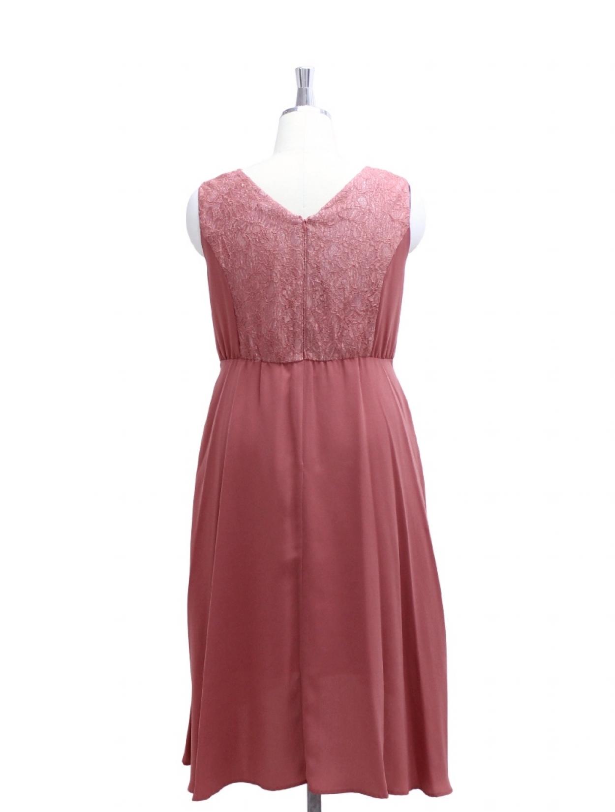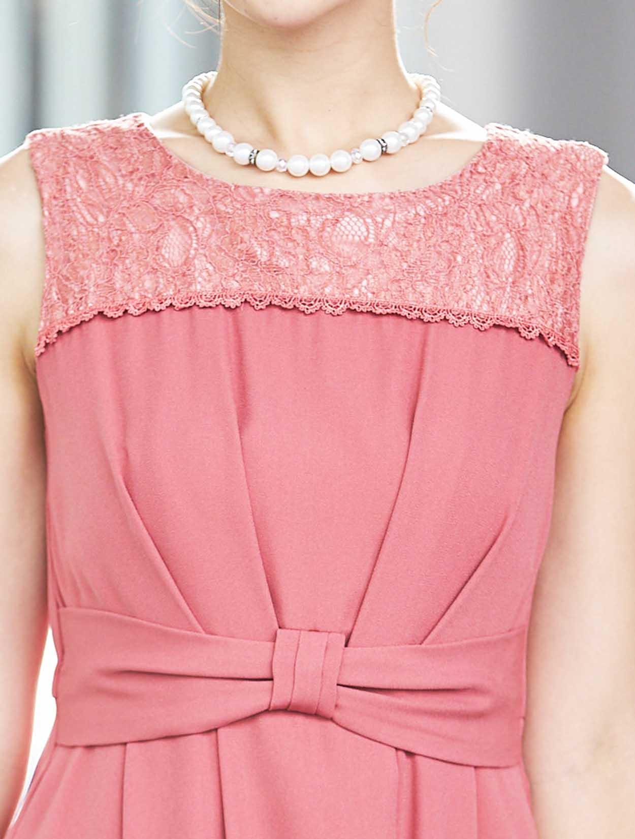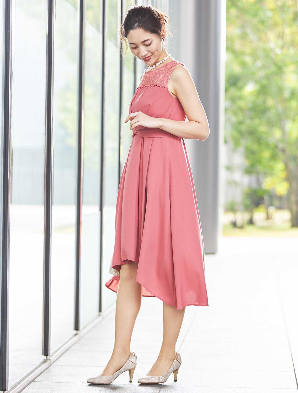 【大きいサイズ LL/3L/4L】胸元レースミディ丈ヘム裾ドレス(ピンク)