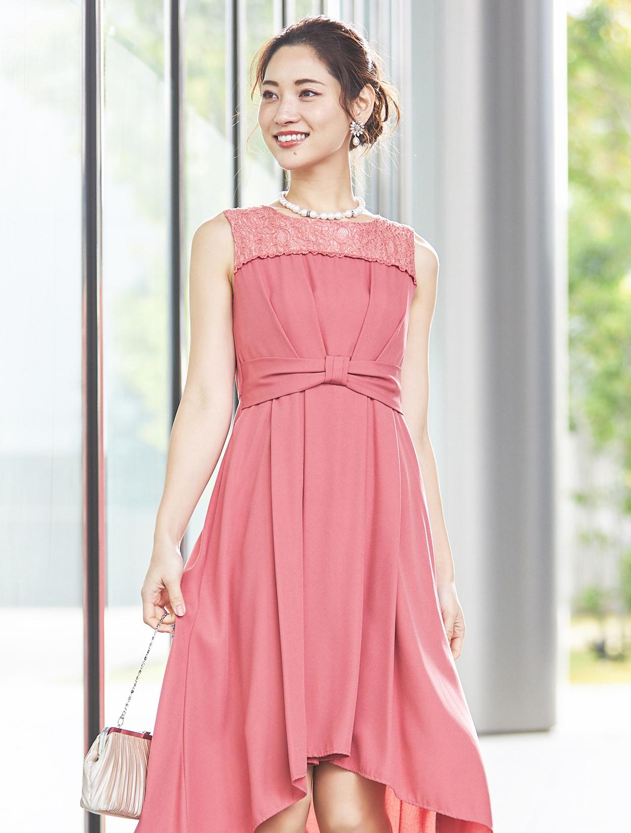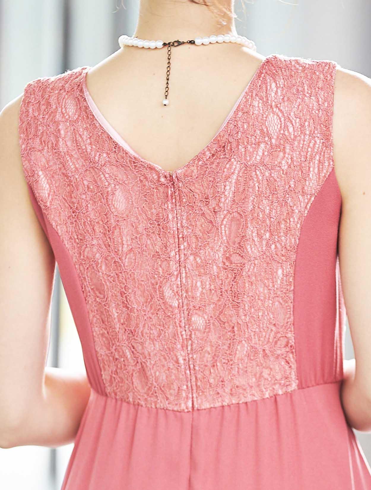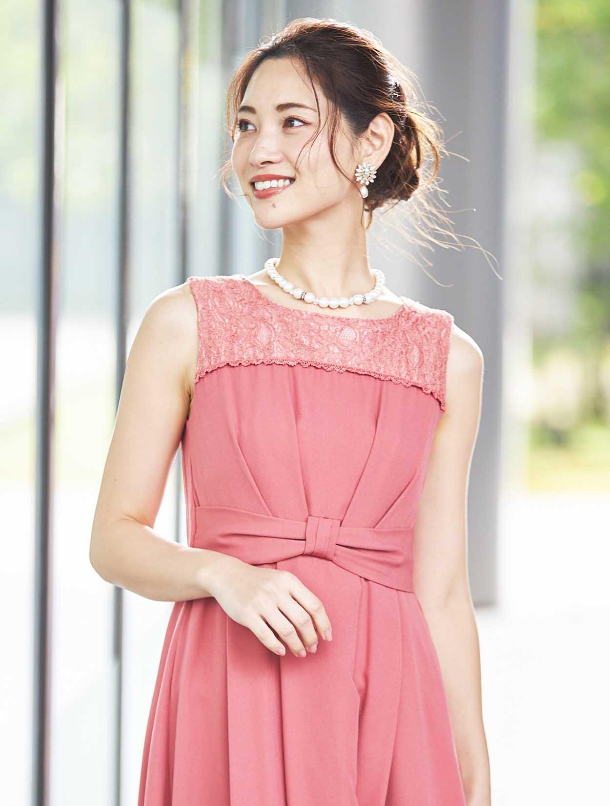 【大きいサイズ LL/3L/4L】胸元レースミディ丈ヘム裾ドレス(ピンク)