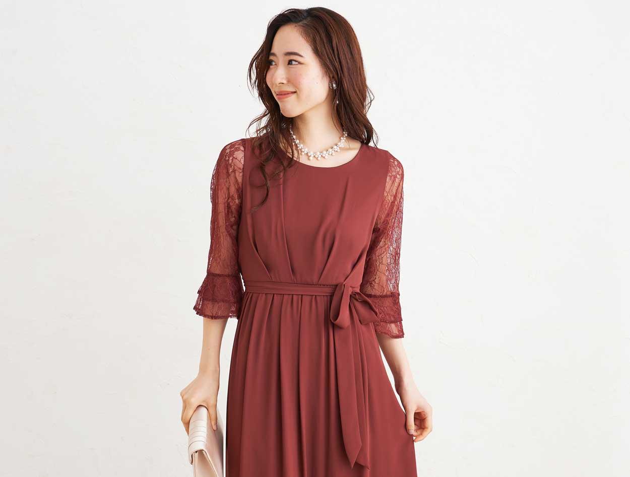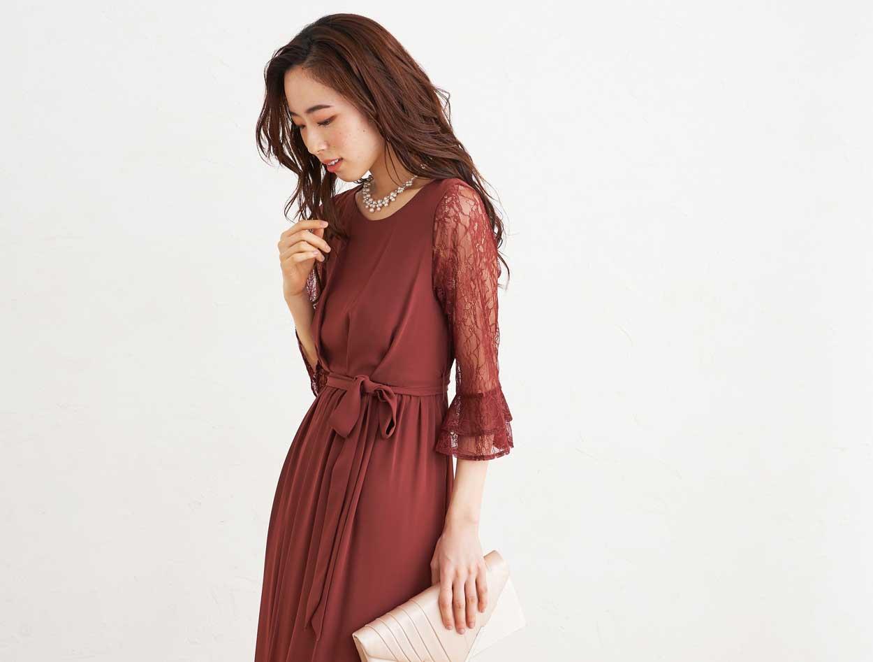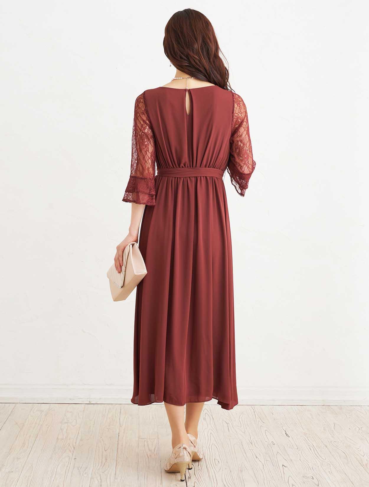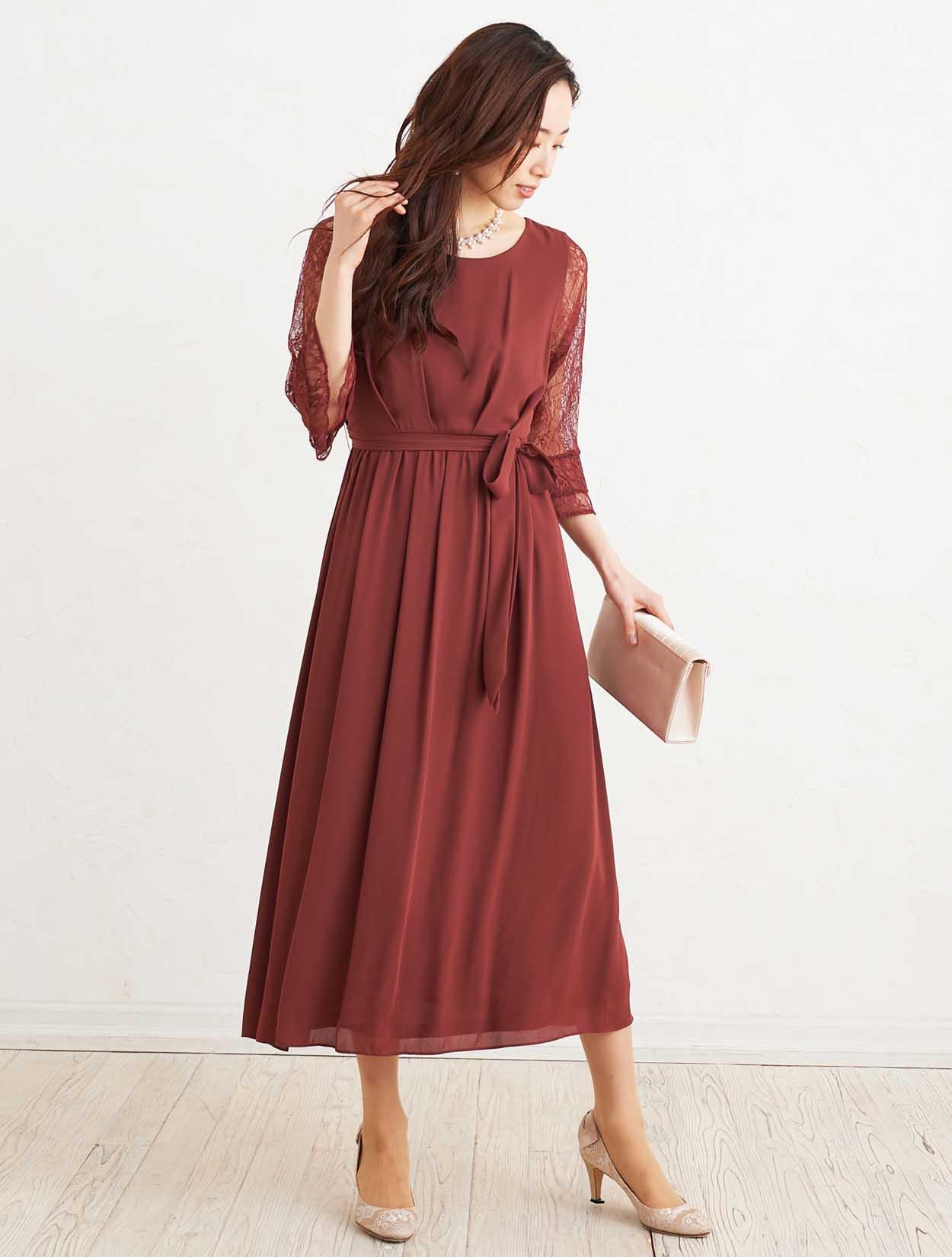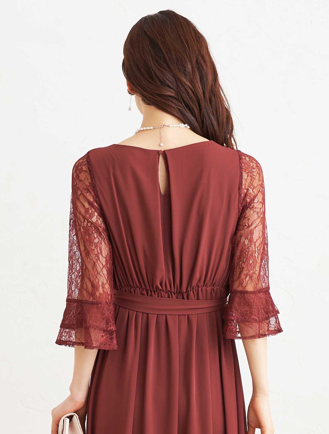 ■落ち着いた赤いカラーで上品な印象のドレスです。透け感のあるレースの袖が二の腕をカバー。