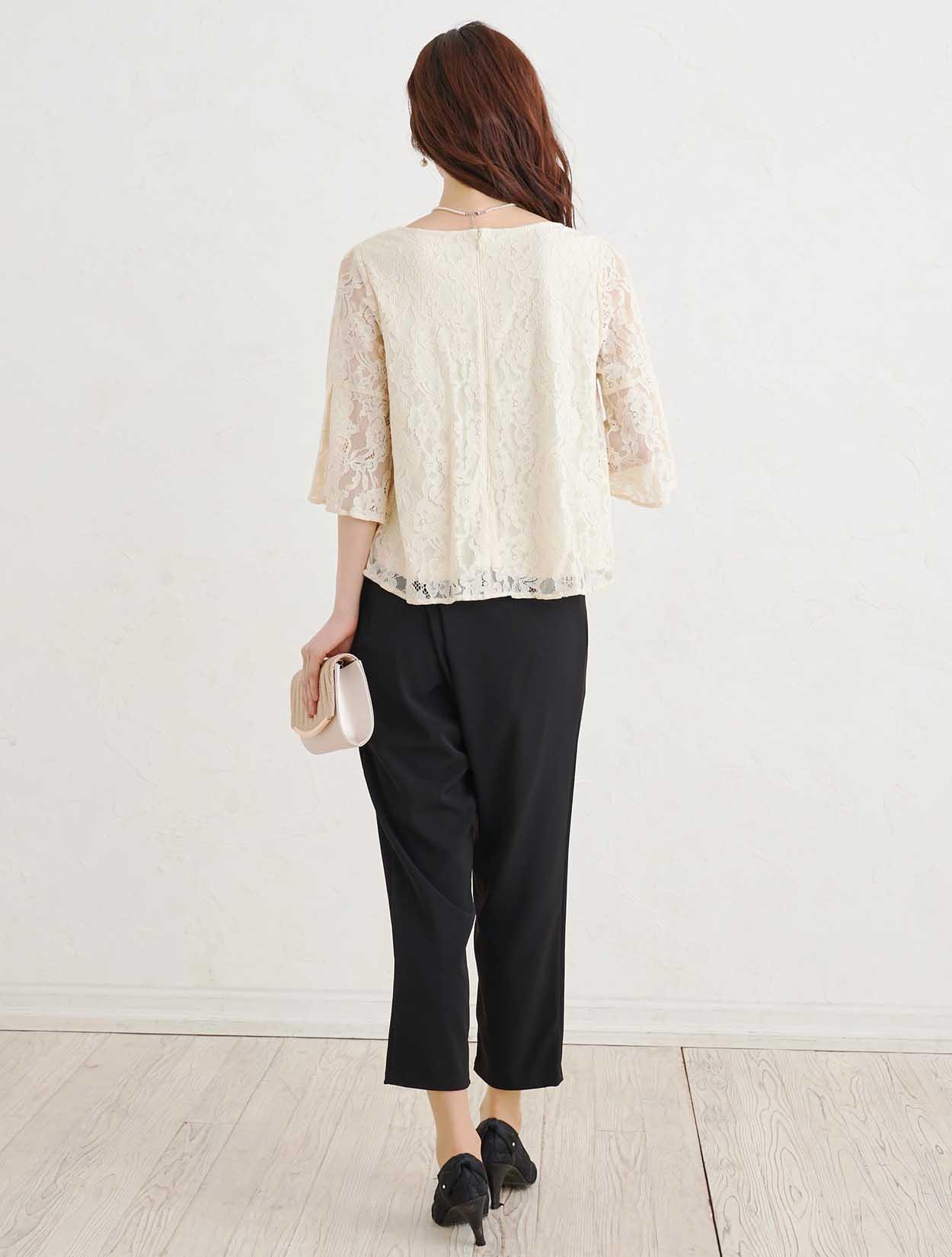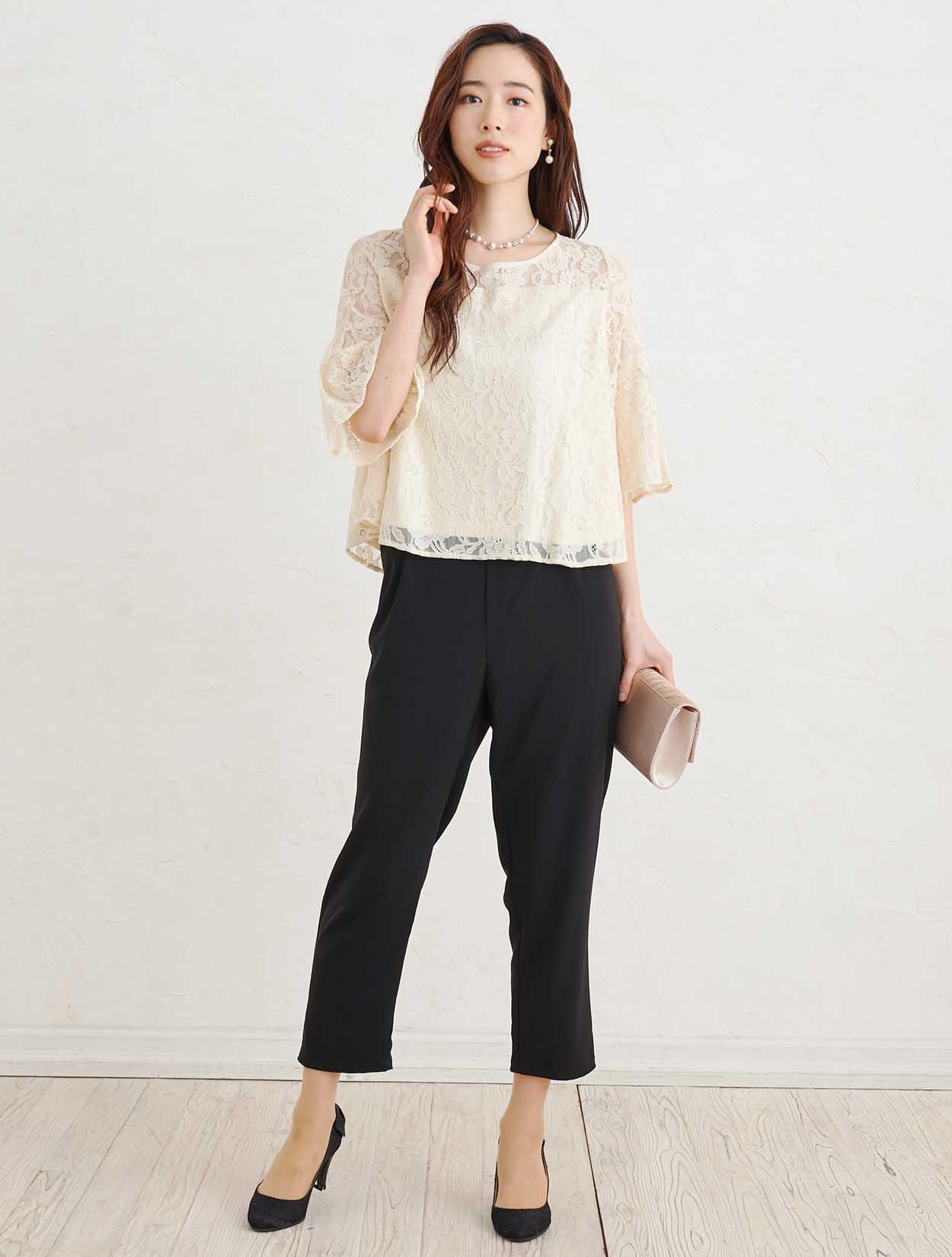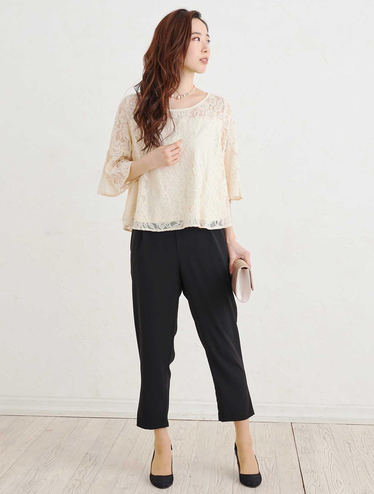 ■上品なベージュのレーストップスと黒のスラックスで作る洗練されたセットアップスタイル。