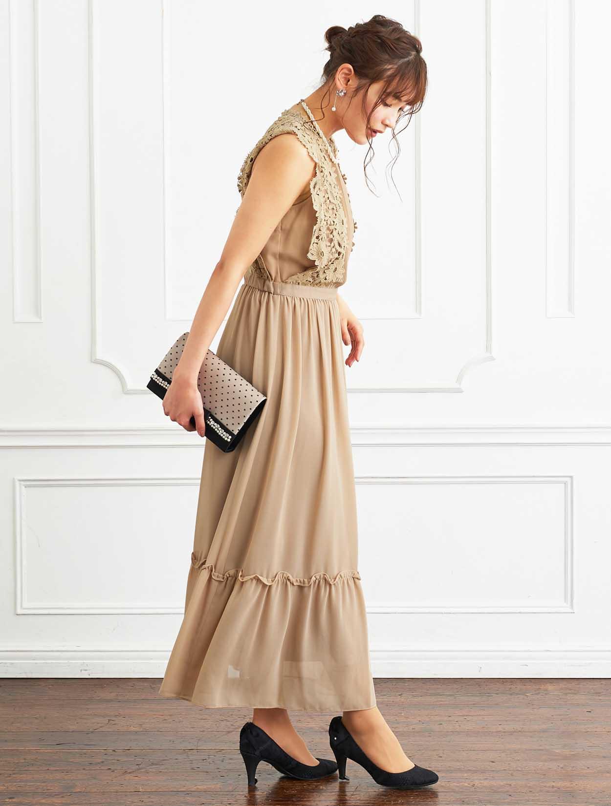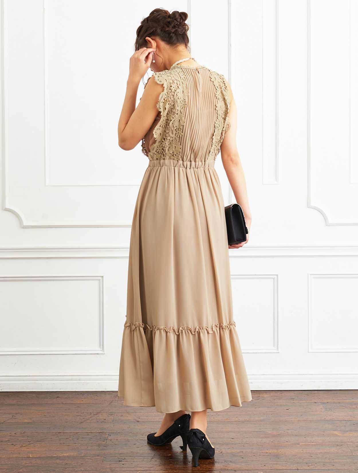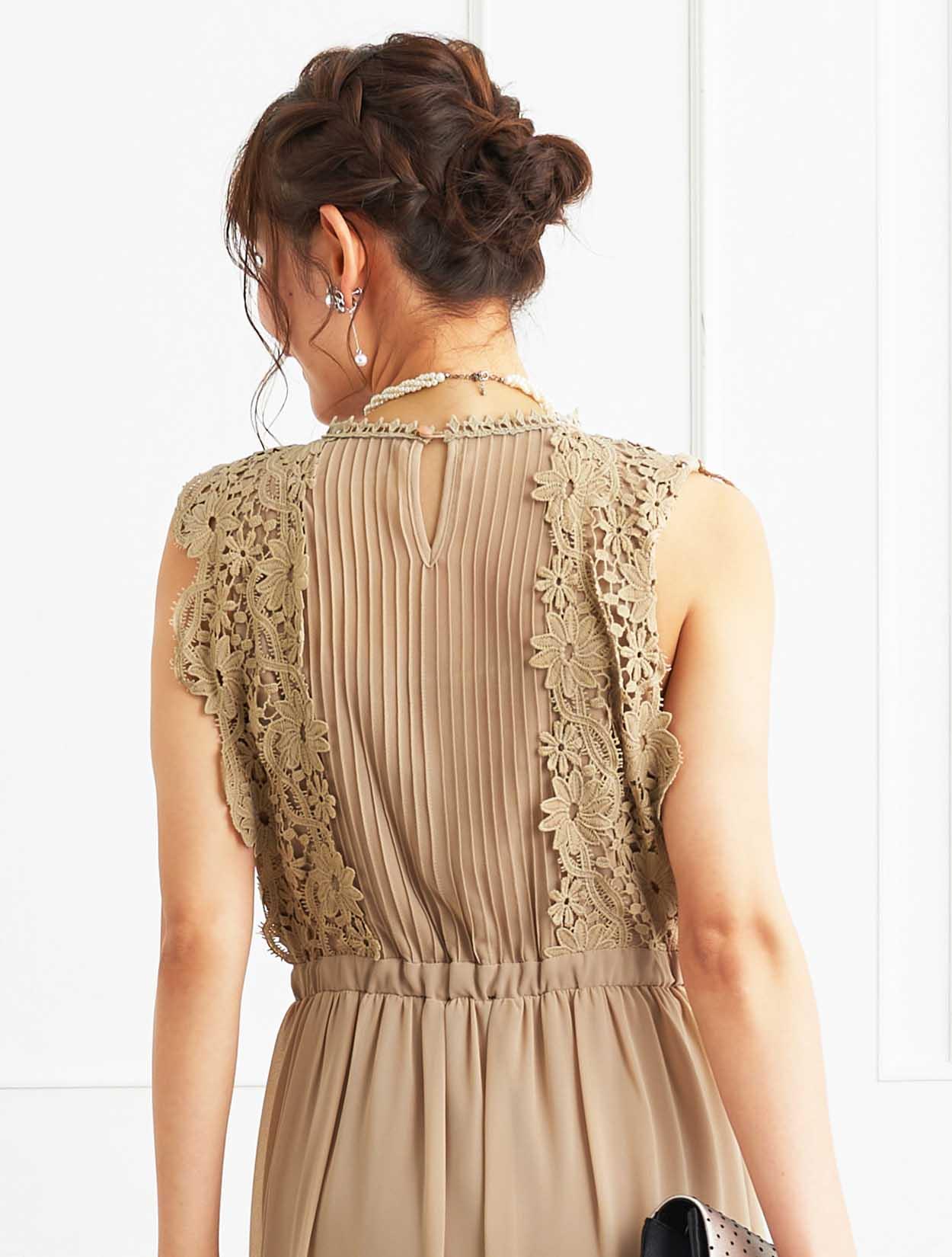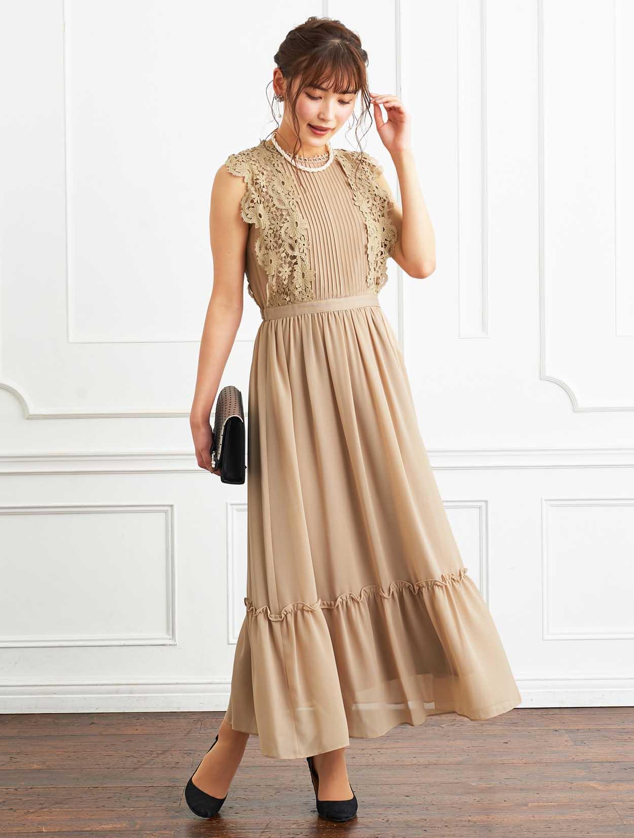 ■ネックからウエストに重なるタックデザインとレーススリーブが、今年らしく着こなせるドレスです。