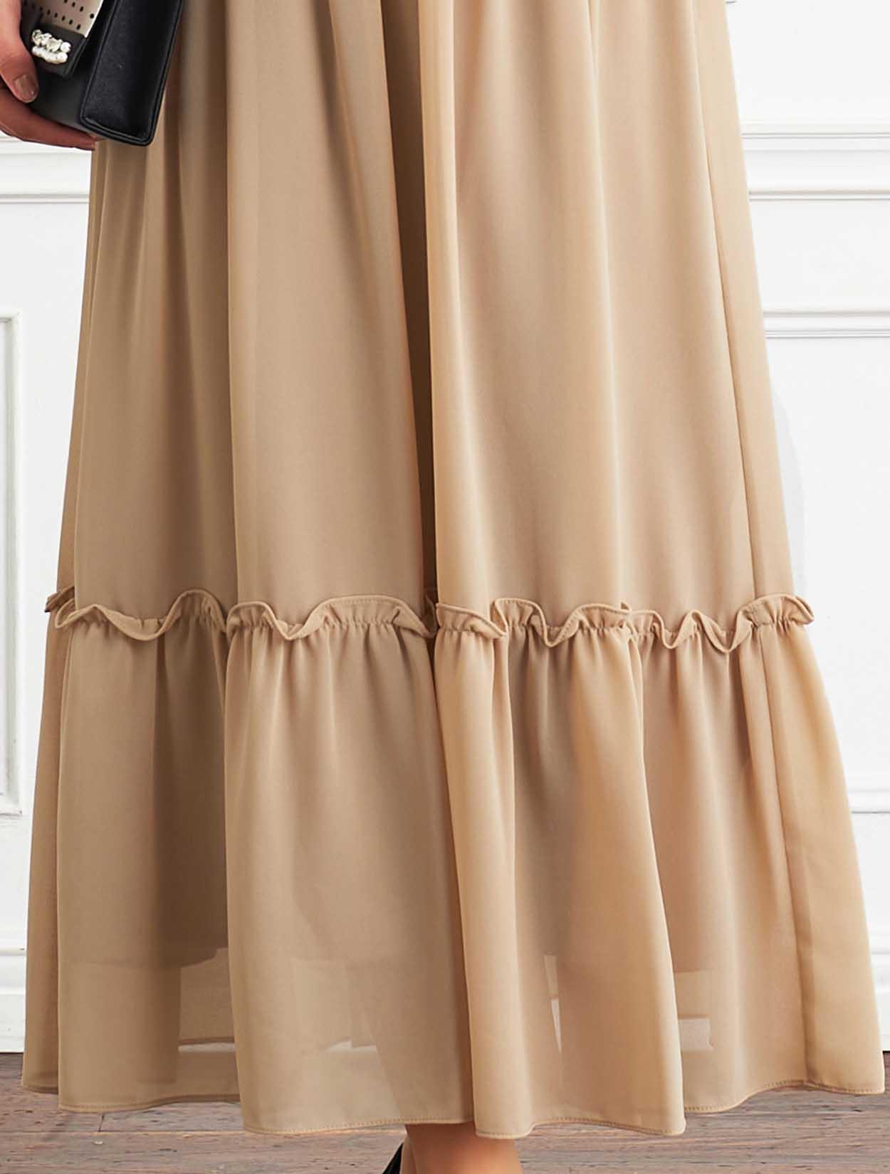 ■スカート部分には細かなギャザーをたっぷり入れ、立体感を演出。歩くたびにゆらゆらと広がりを見せ、ムードのある1枚です。