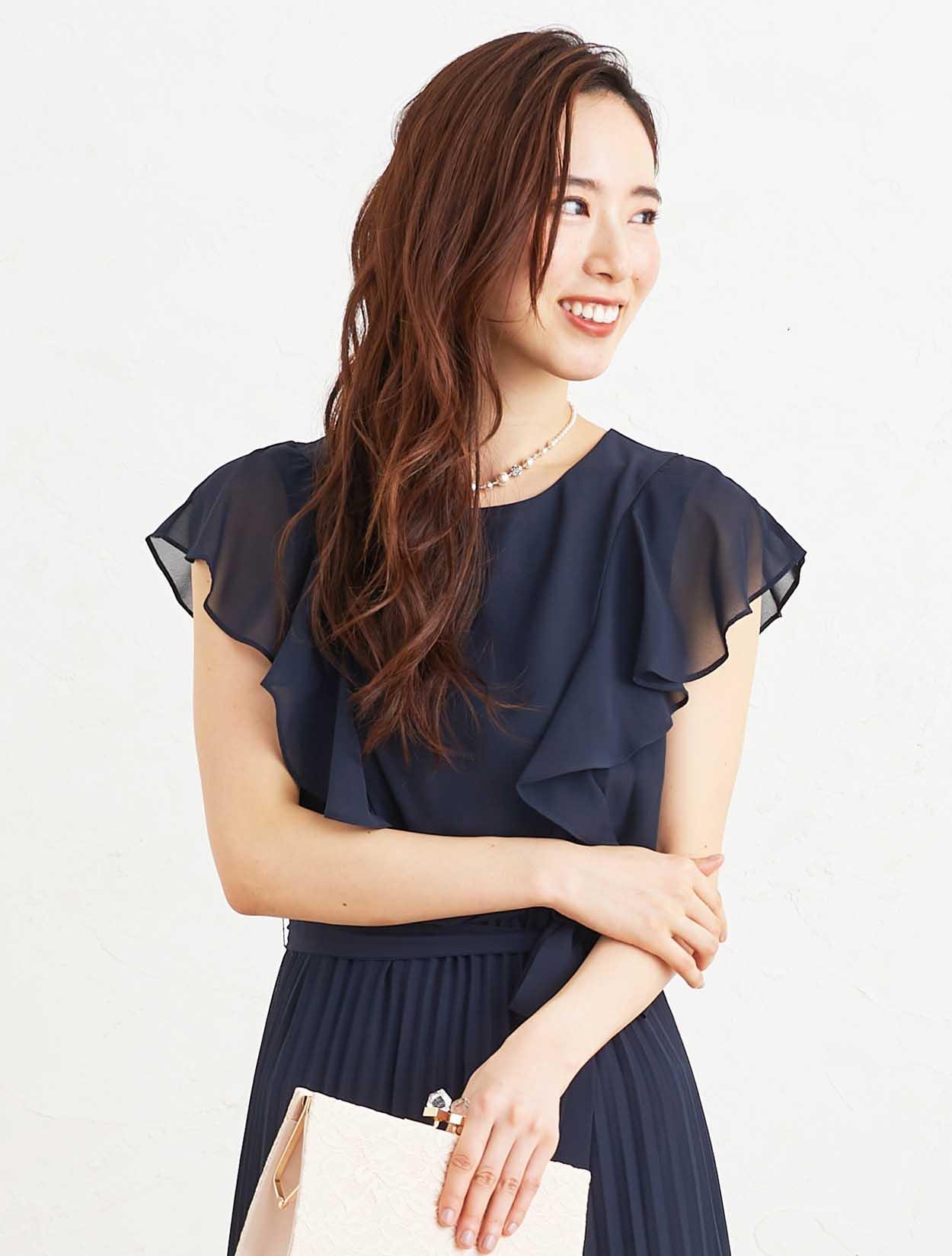 ■落ち着いた定番カラーのネイビーのドレスは、たっぷりのラッフルとプリーツで華やかな印象に。