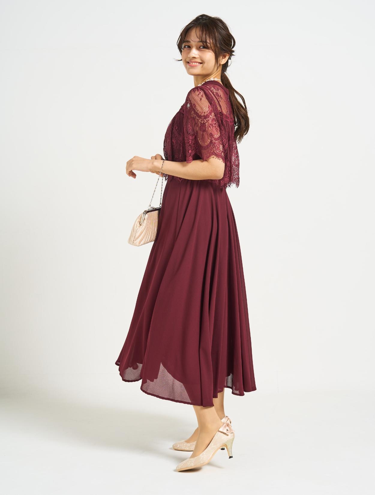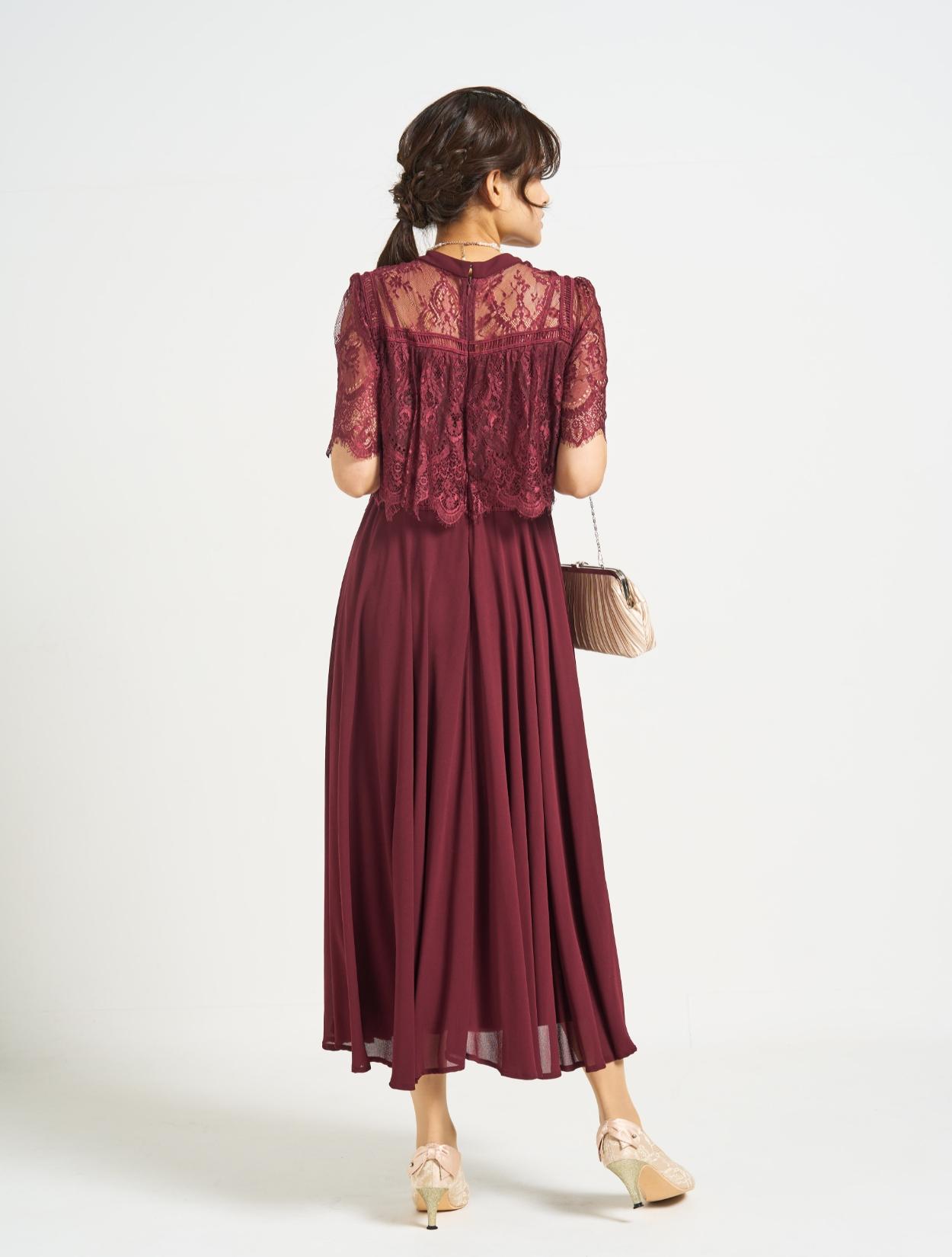 ■スタンドカラーのレースブラウスに分量のあるフレアドレスを合わせた上品な1着。