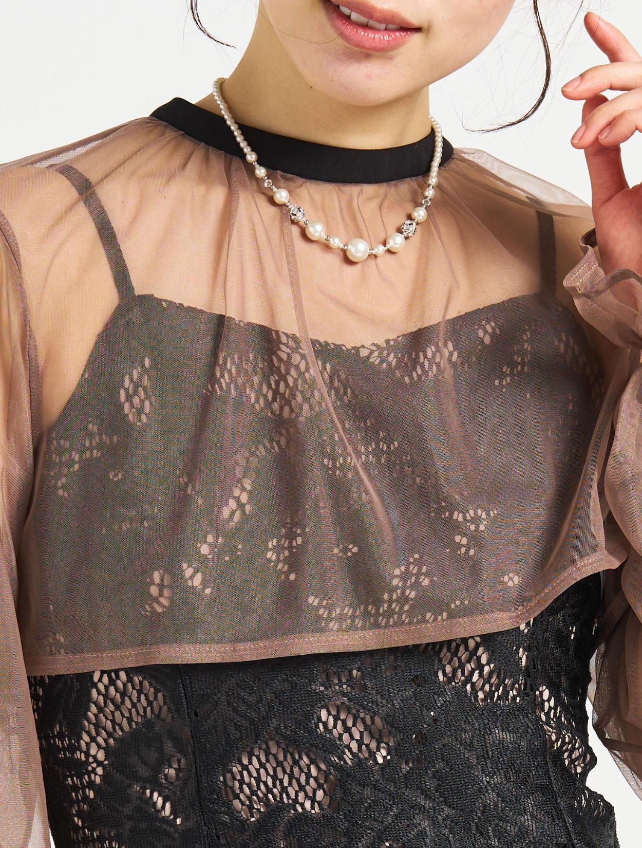 ■明るいベージュの裏地に落ち着いたダークなブラックのジャガードレースのドレスとグレージュのブラウスです。
