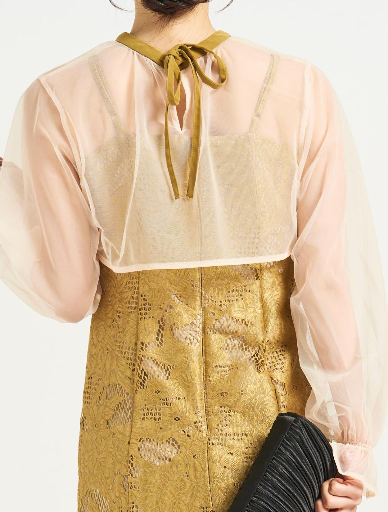 ■明るいベージュの裏地に上品なイエローのジャガードレースのドレス、白っぽいベージュのシフォンブラウスです。