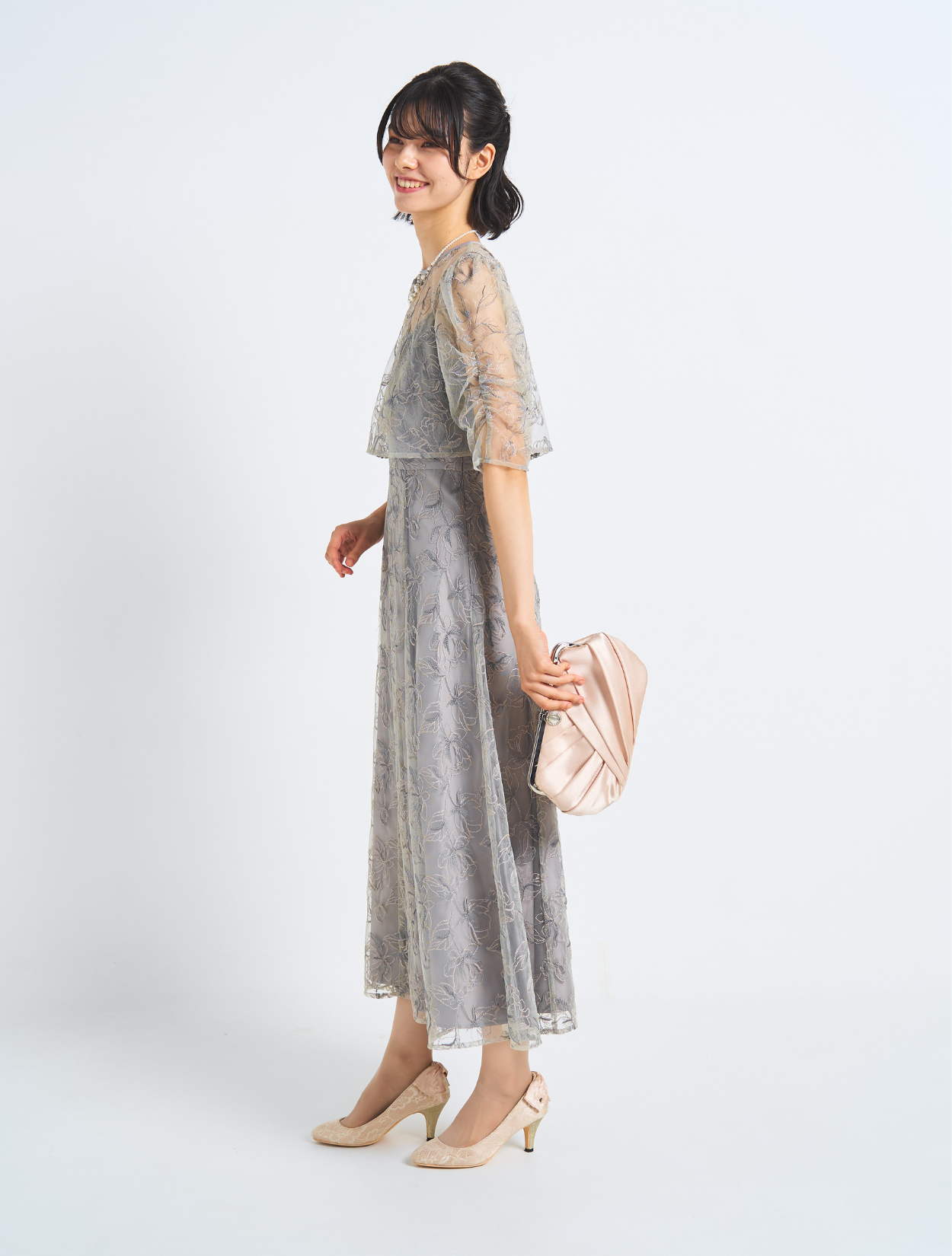 ■優しい淡めのグリーン。カラードレスですが控え目で上品な印象に