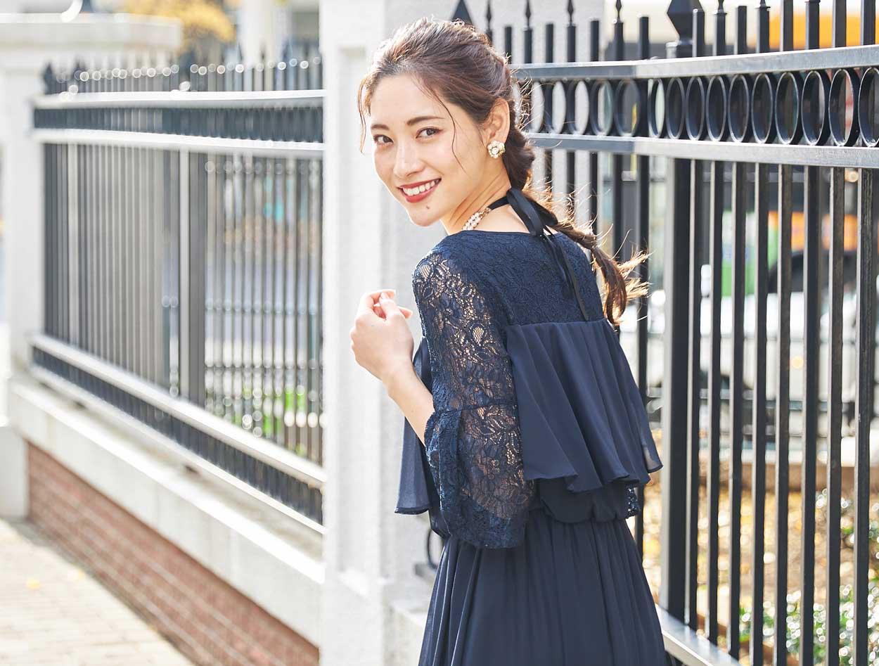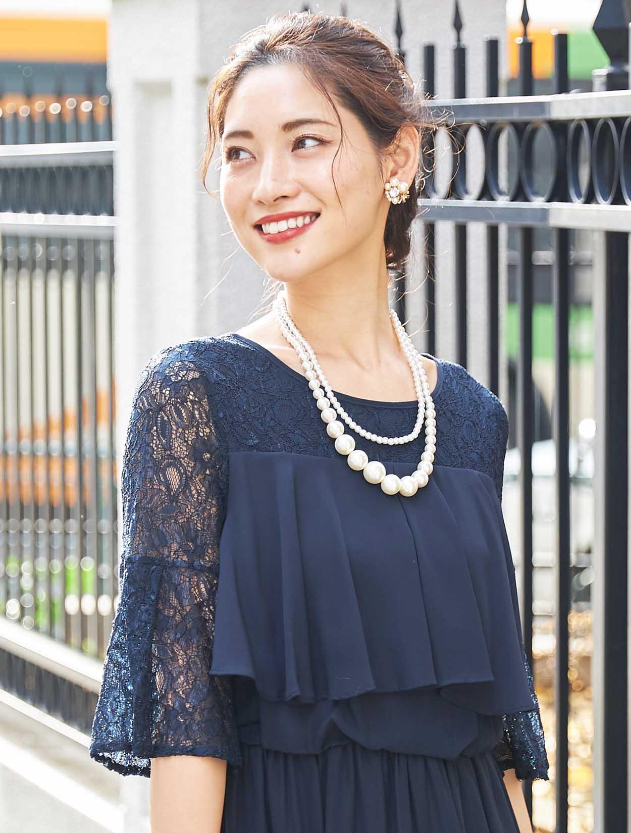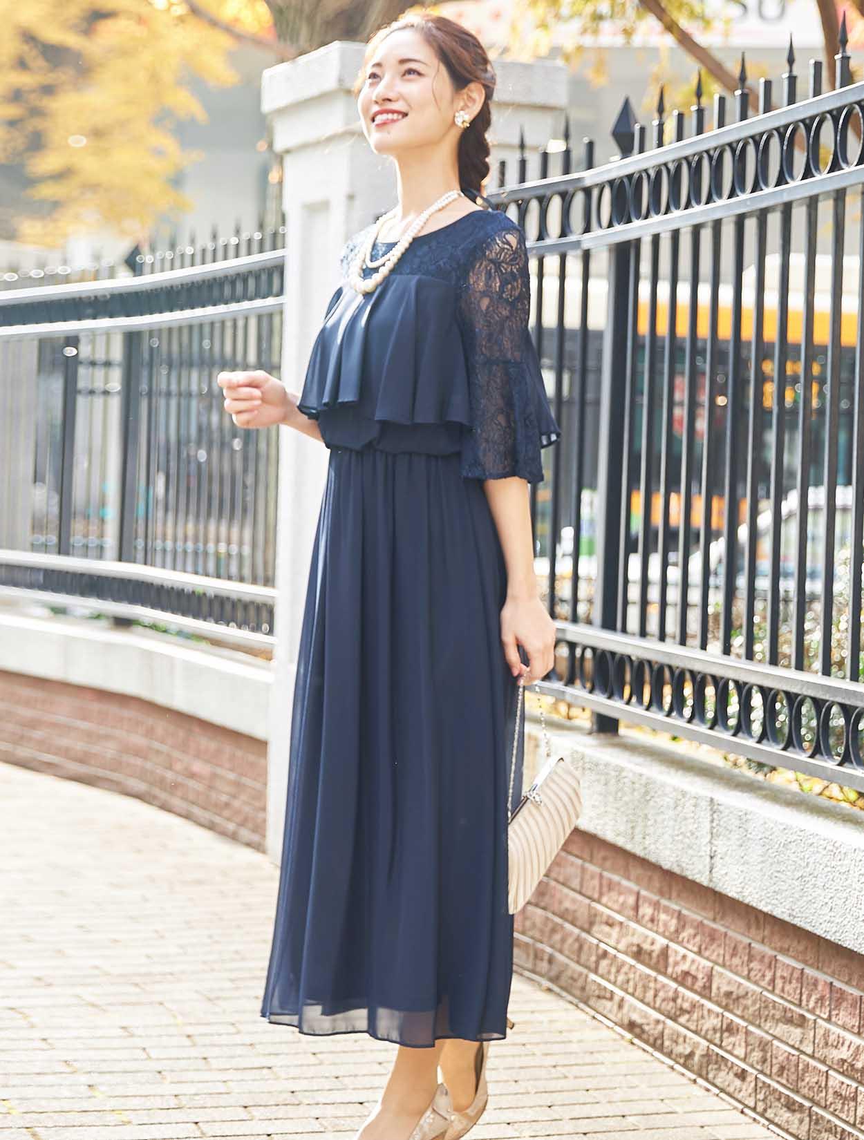 ■20代の方から40代の方まで、幅広く人気のあるネイビーのロングドレスです。