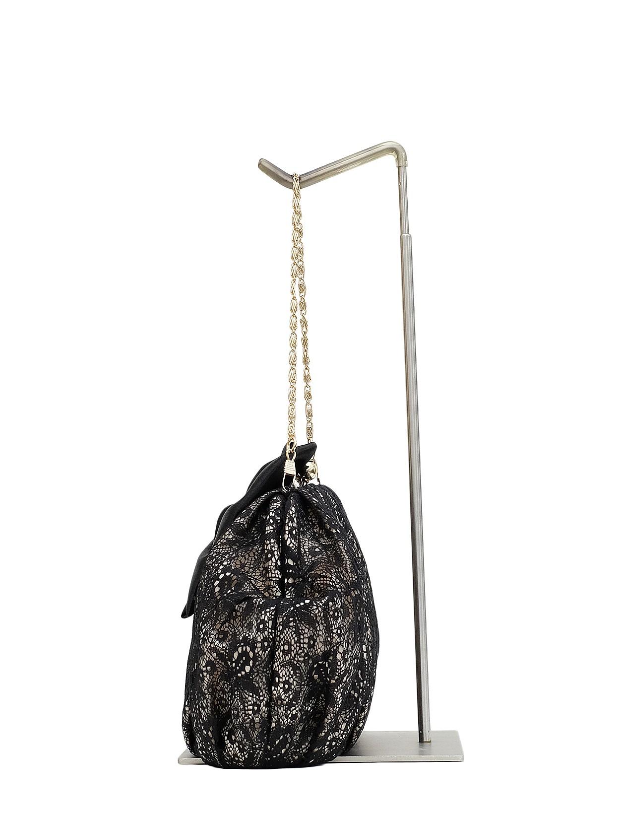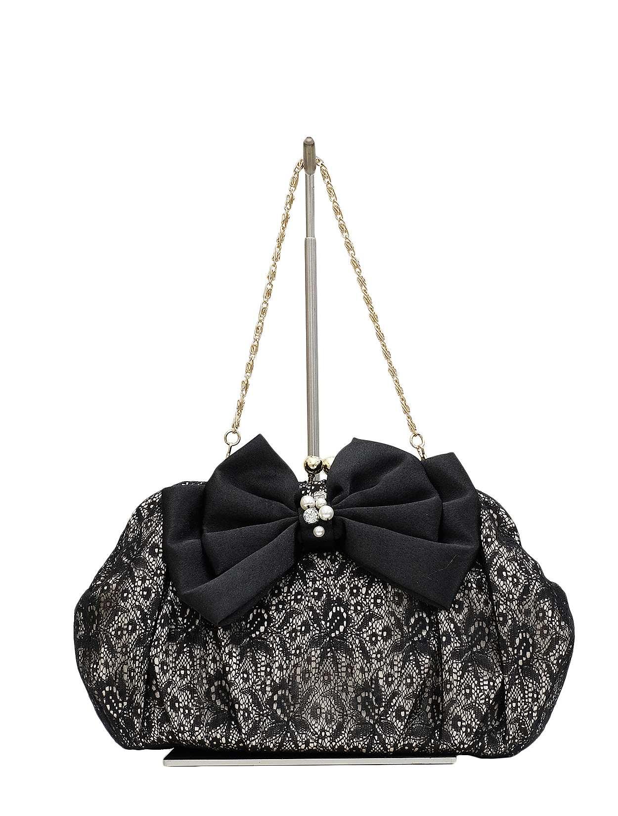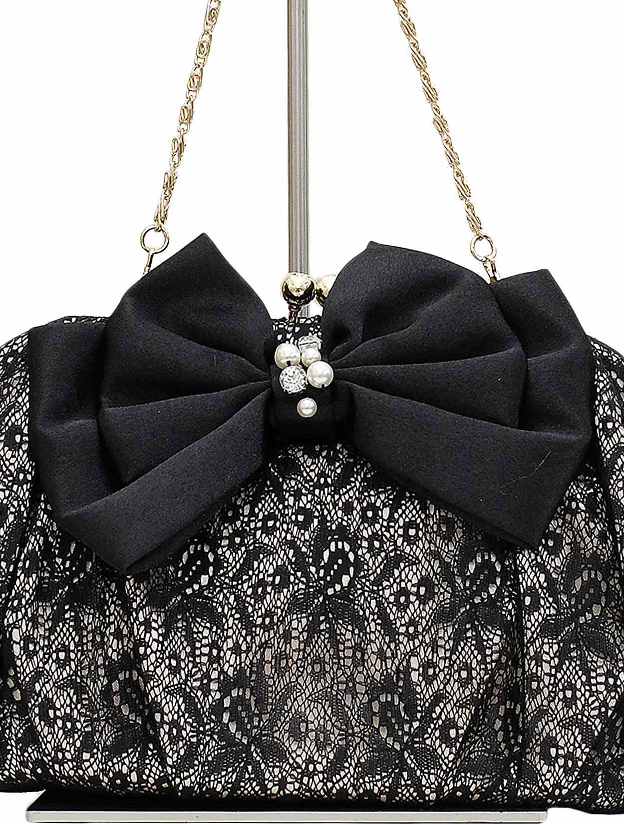 ■レースとリボン使いでフェミニンな印象に。ゴールド系のサテン生地と黒レースの配色でコーディネートのポイントになります。