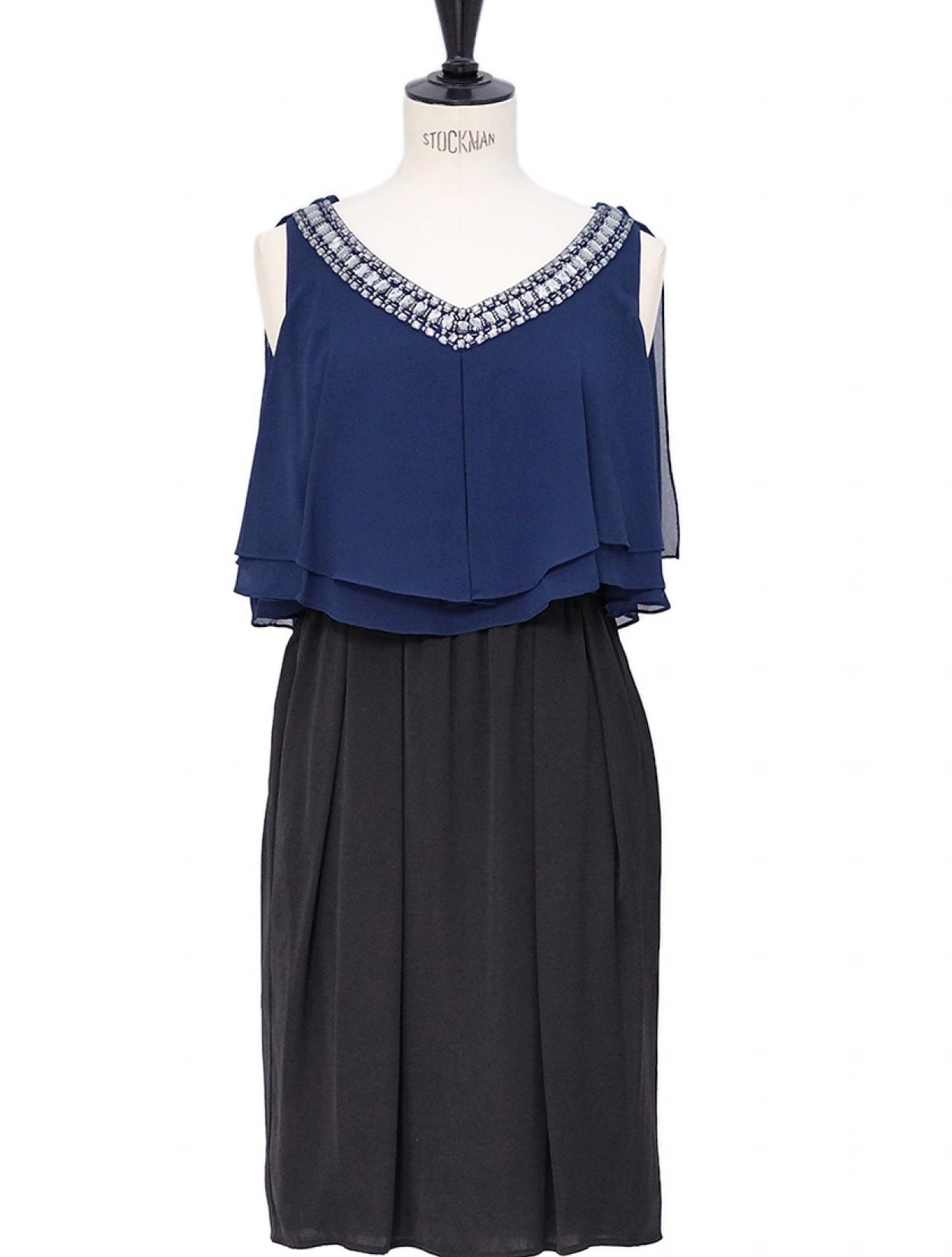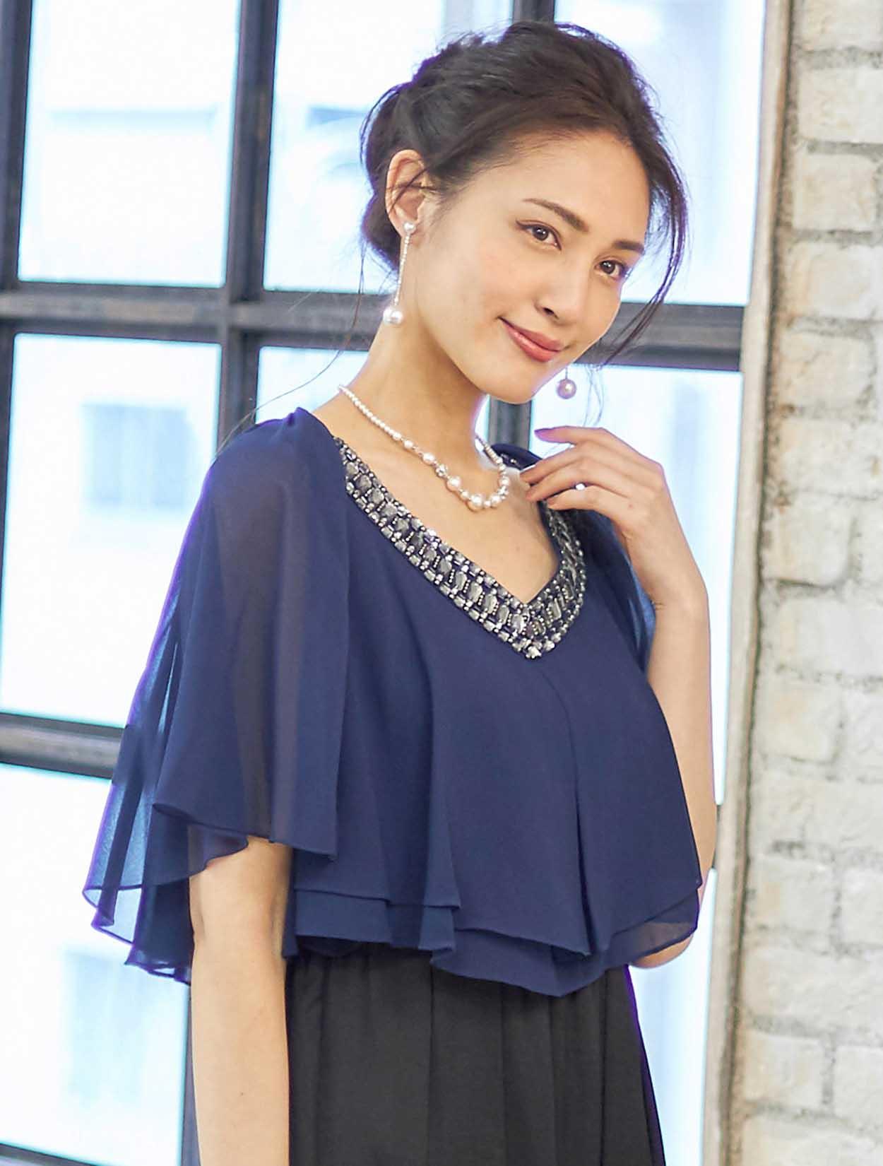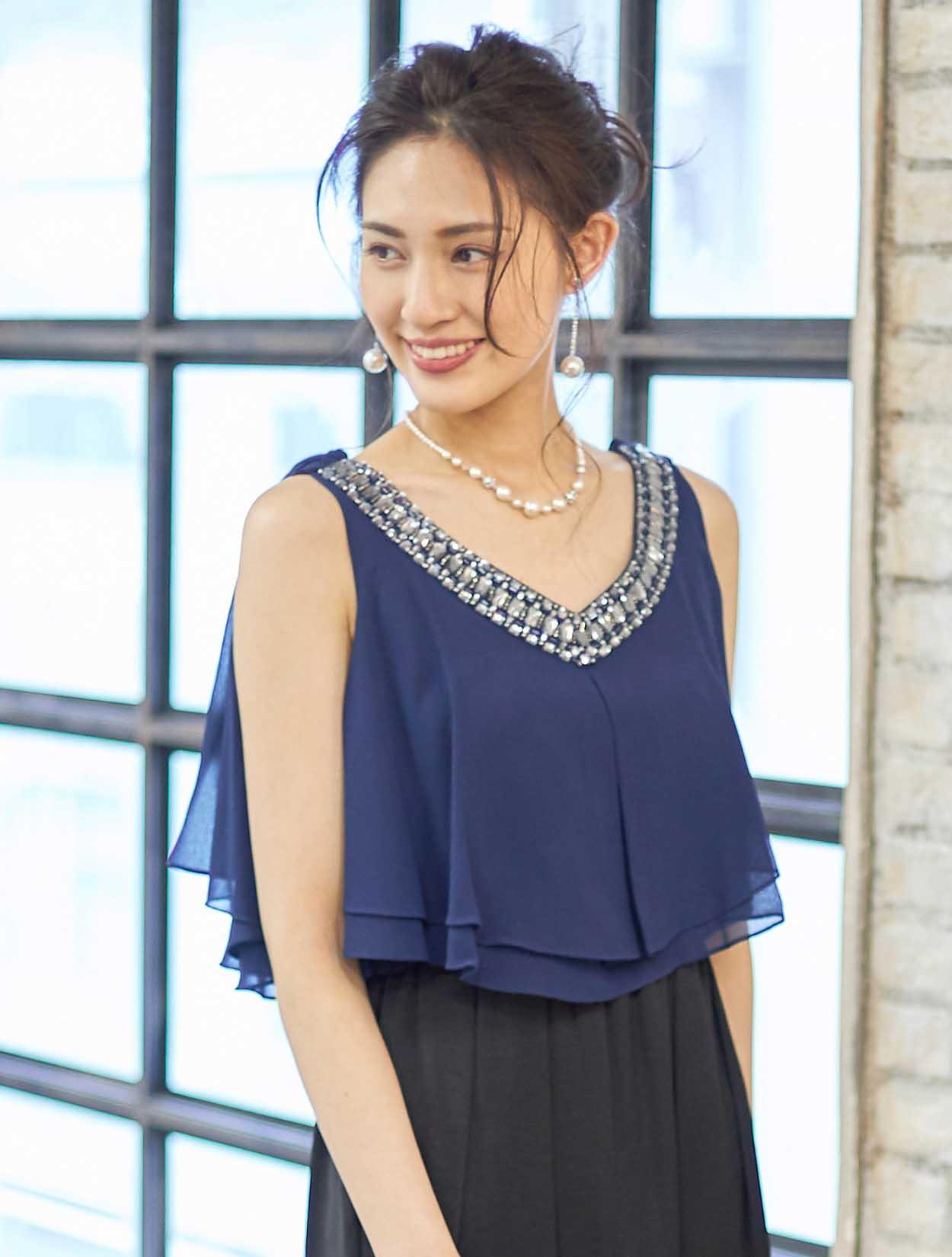 | A4. | クリスタルビジューが大小合わせて3列になり、Vネックに沿って施されている、豪華な装飾です。 |