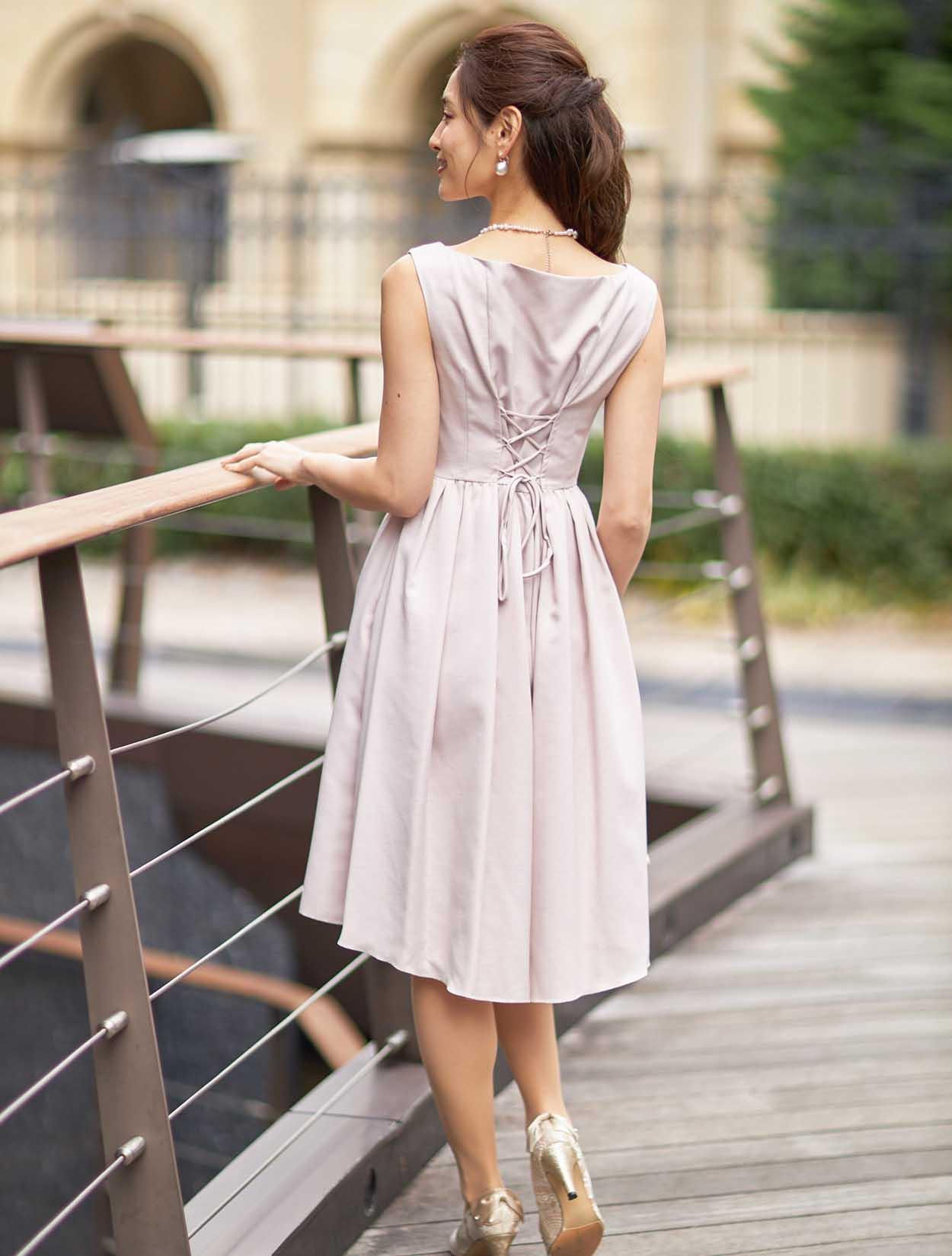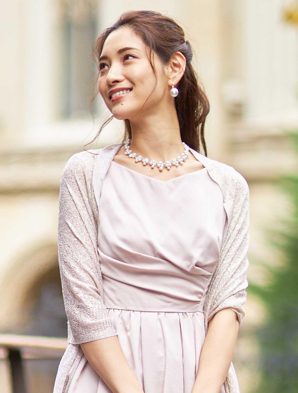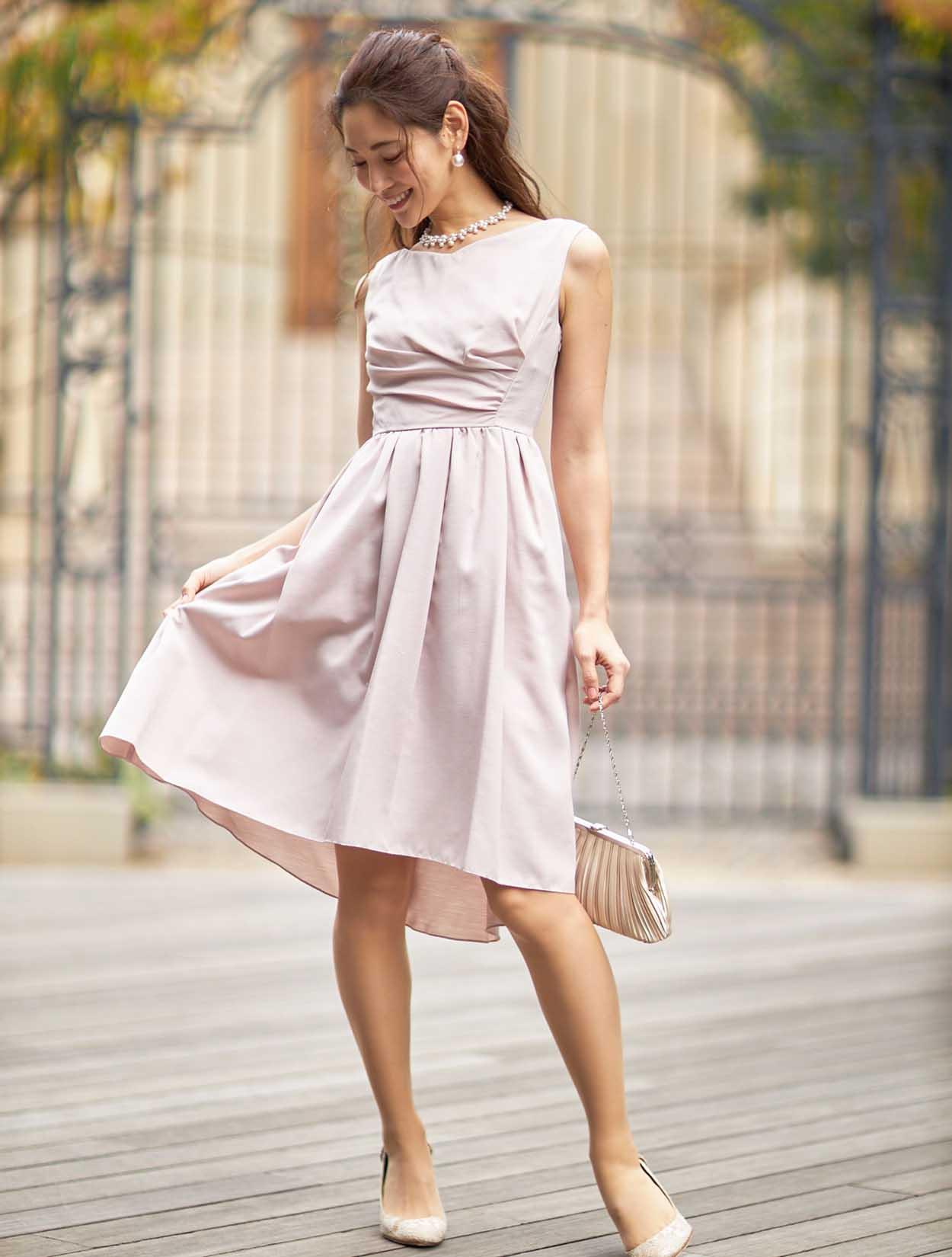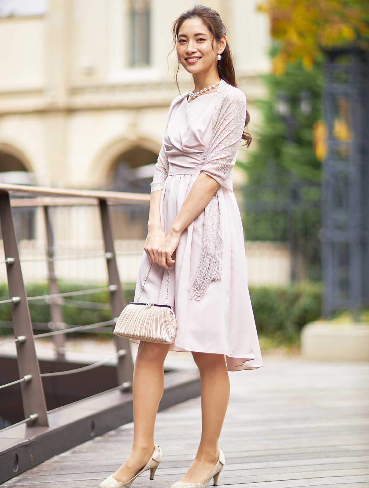 ■優しい印象のペールピンクのドレス。少し横に開いた浅いVネックはデコルテがきれいに見えるデザインとなっております。バストからウエストにかけて流れるドレープは女性らしいラインを演出してくれます。