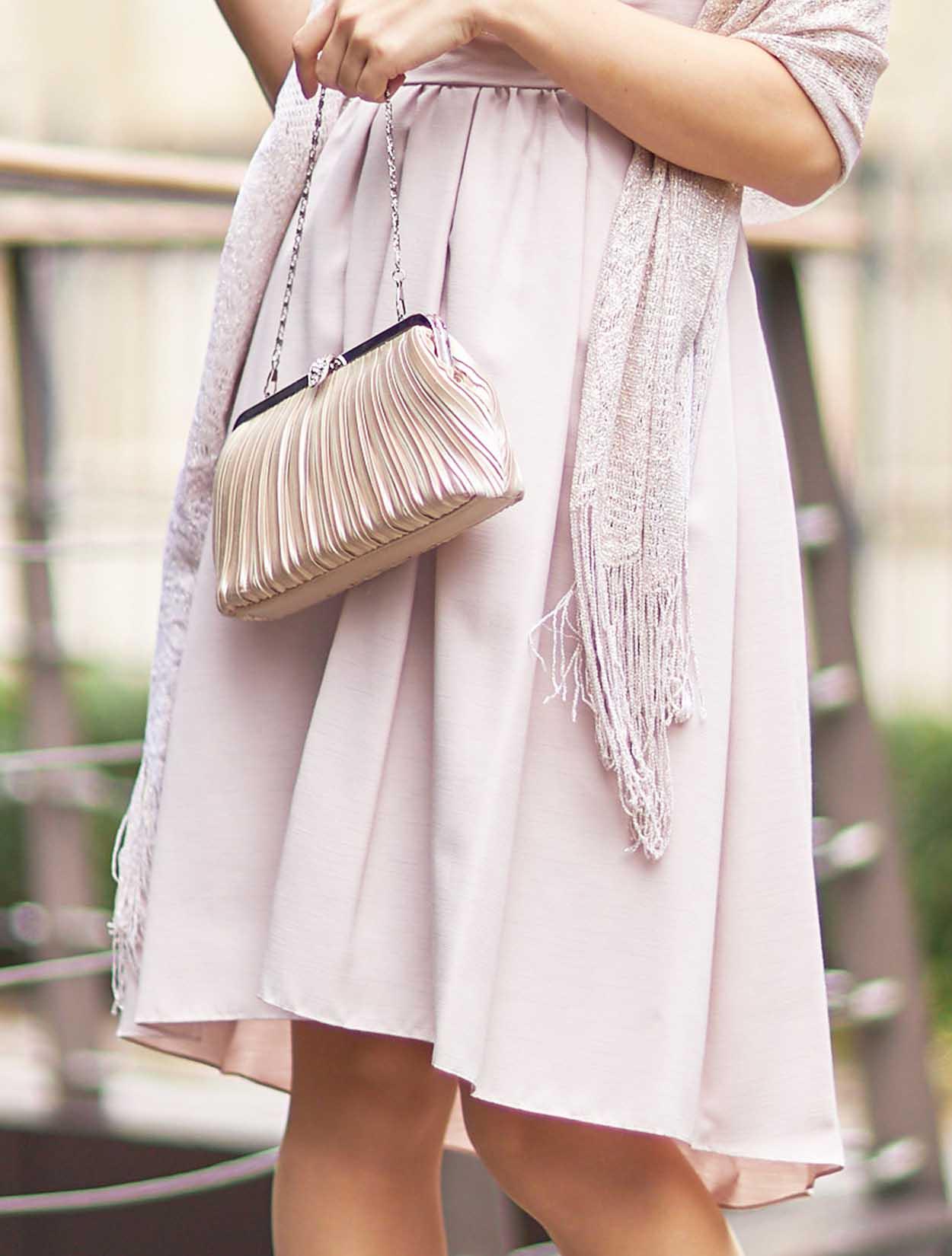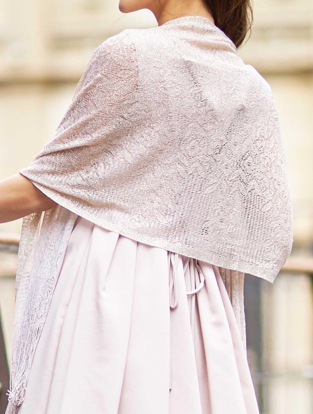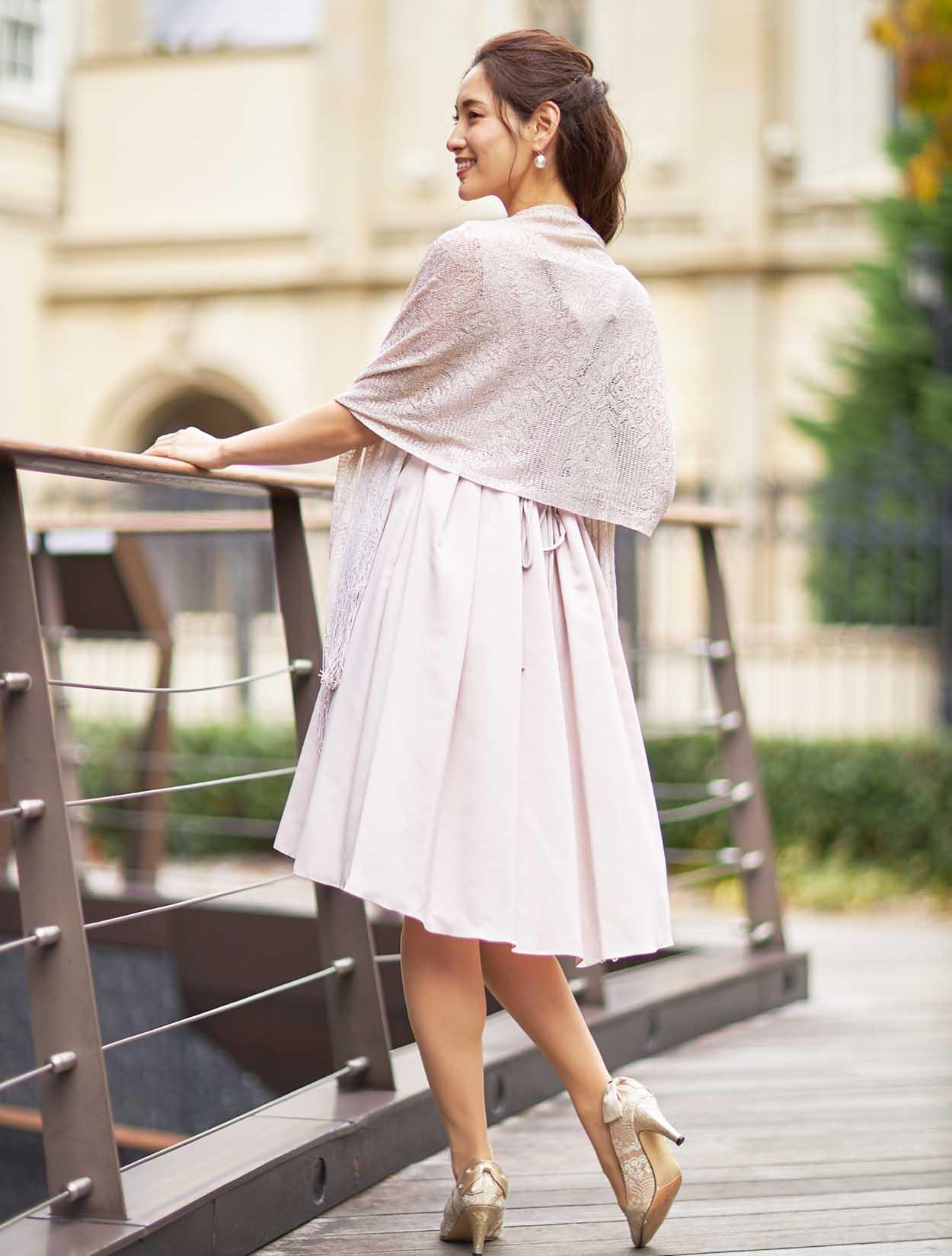 ■ピンクのドレスをゴールドのラメショールで合わせた大人かわいいコーディネートです。
