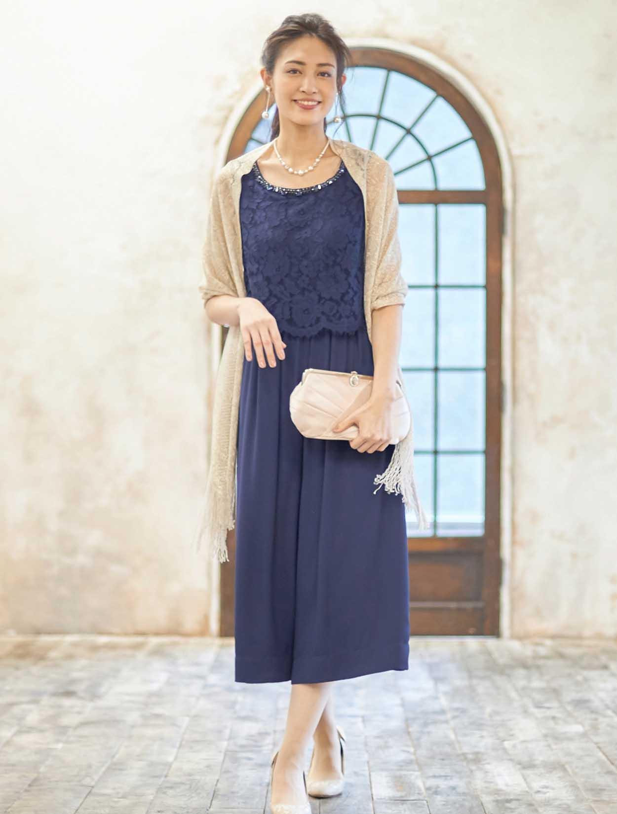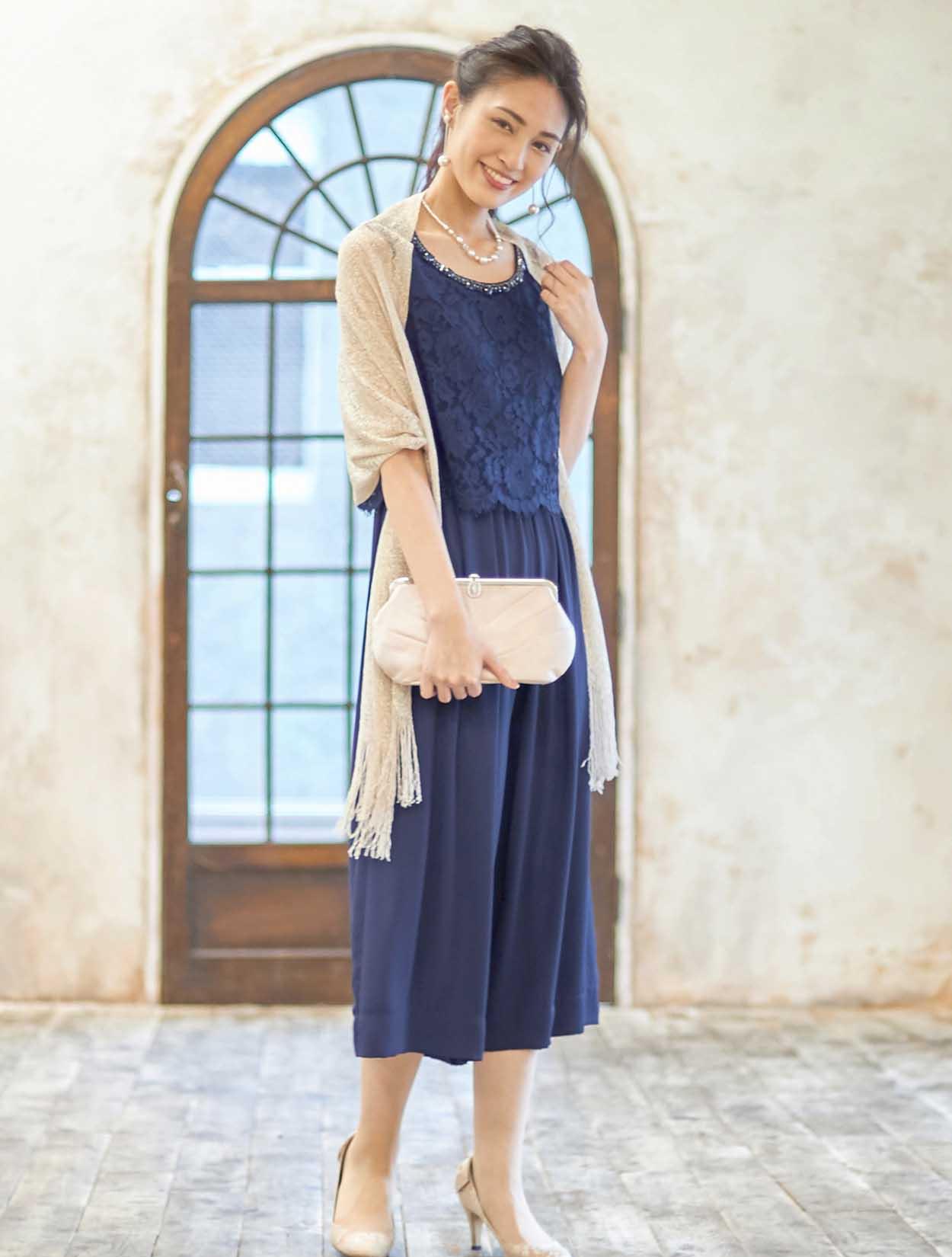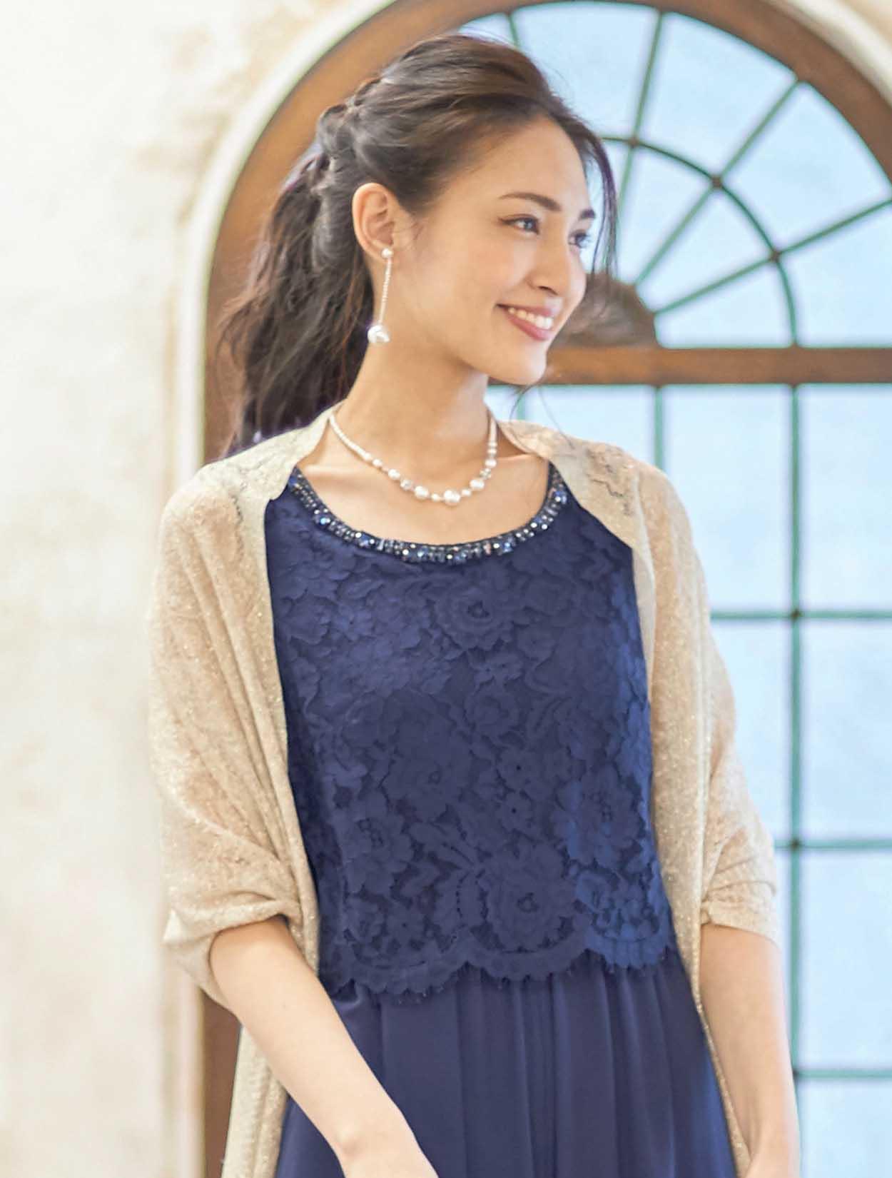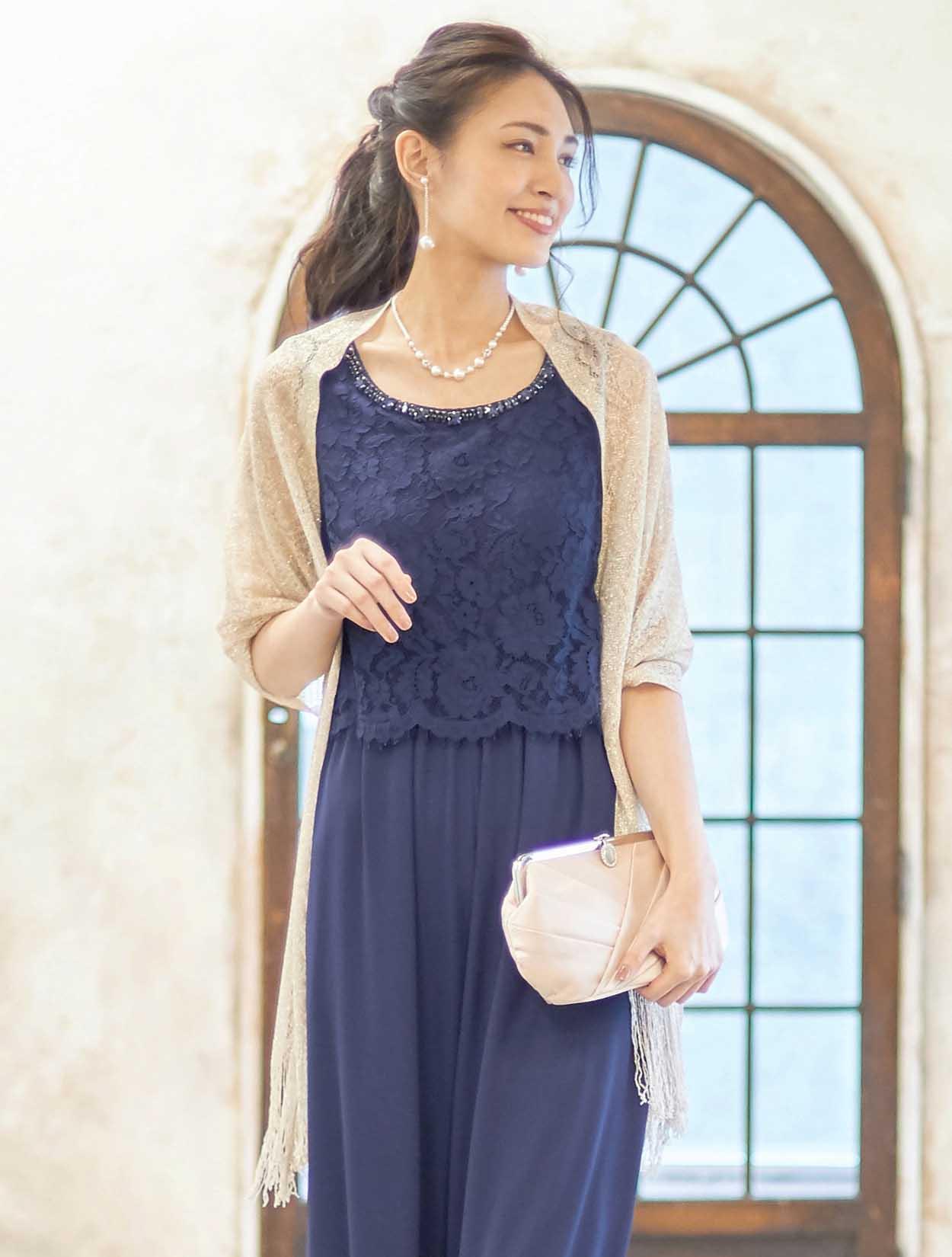 ■綺麗なネイビーのドレスにゴールドのラメストールを合わせた華やかなコーディネートです。ネックレスはシンプルなのでレースが引き立ちます。