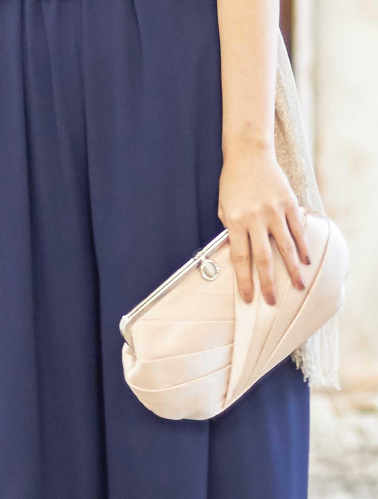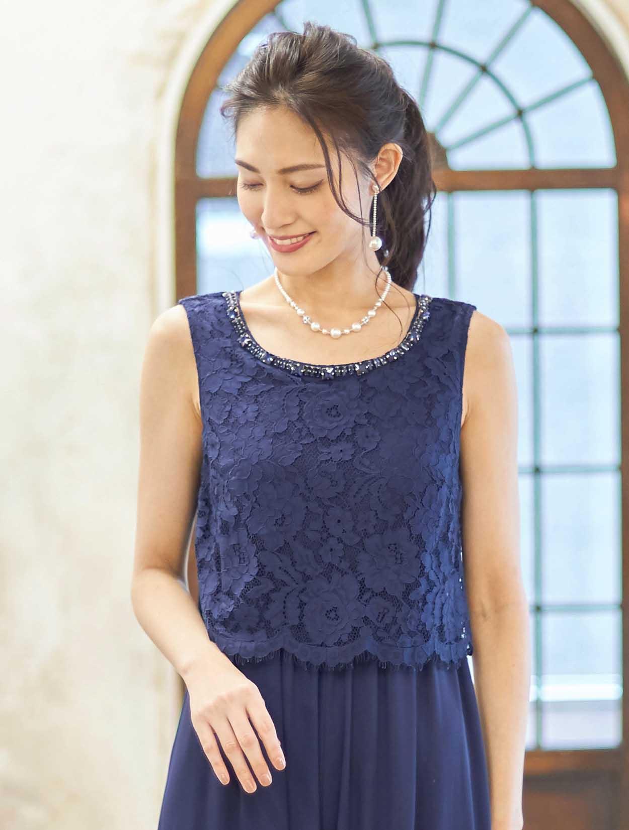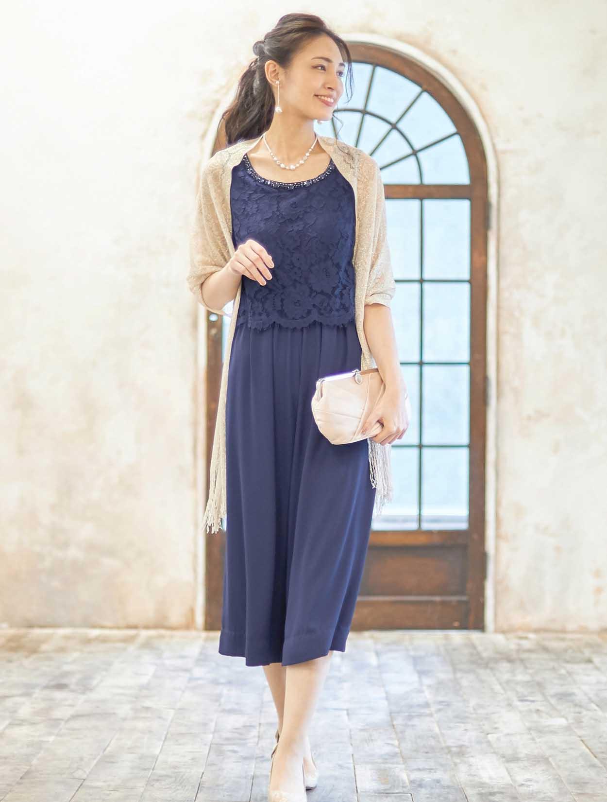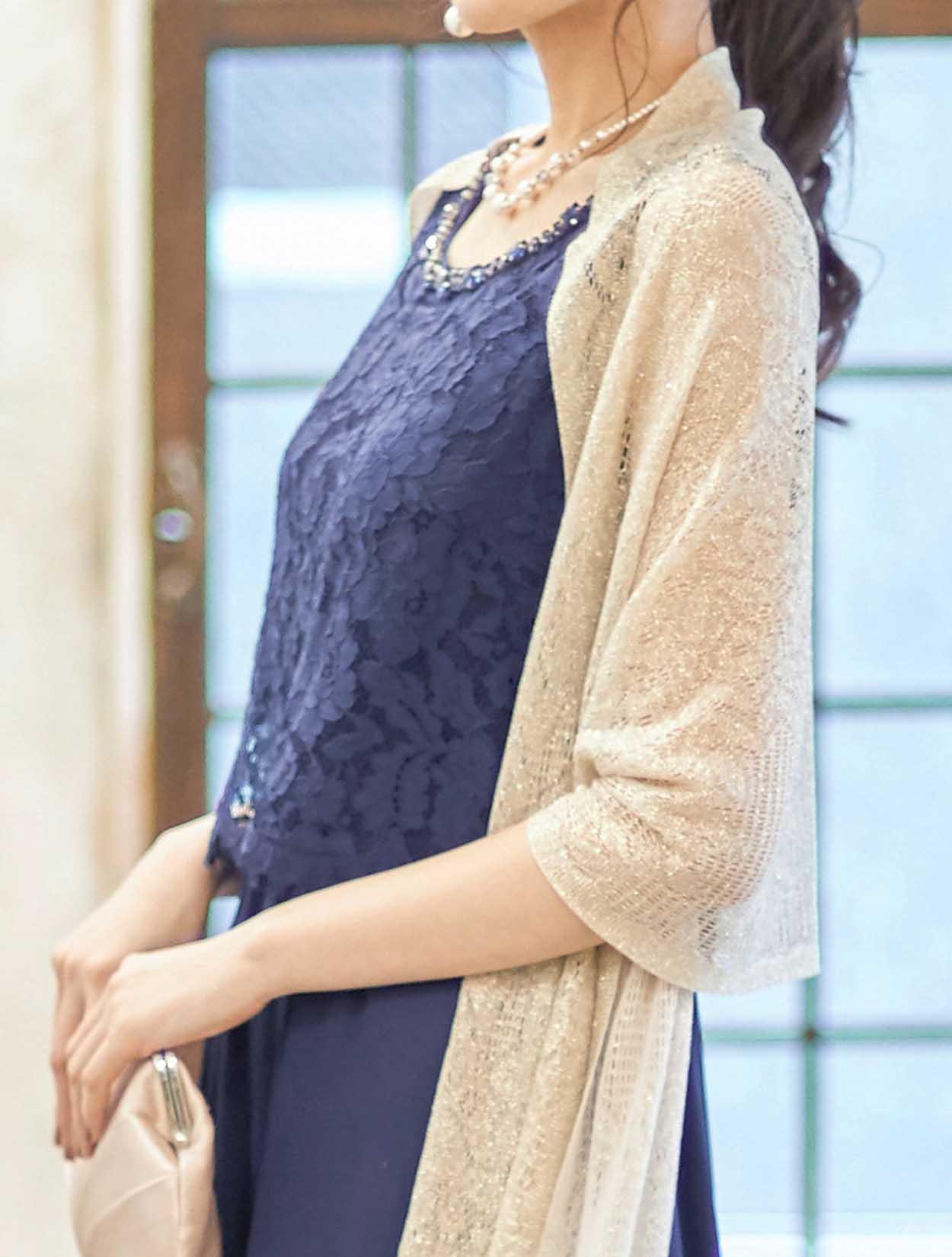 ■綺麗なネイビーのドレスにゴールドのラメストールを合わせた華やかなコーディネートです。ネックレスはシンプルなのでレースが引き立ちます。
