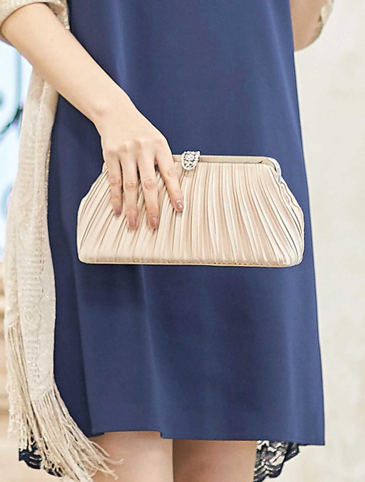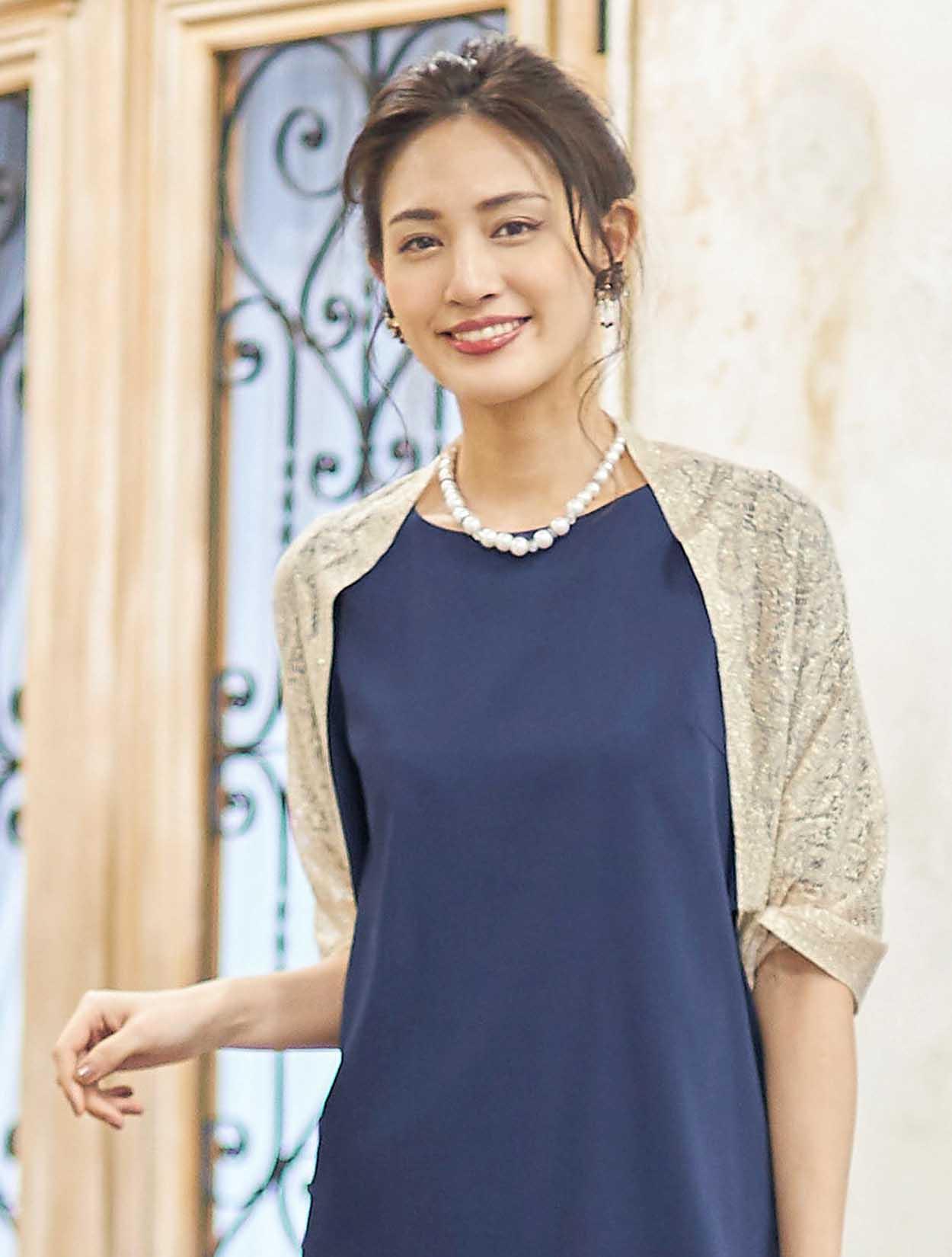 ■ゴールドのストールで女性らしく華やかにコーディネート。お袖付きのドレスなので、ストールは必要に応じてお使頂けます。ストールを外しても、背中のレースが華やかです。