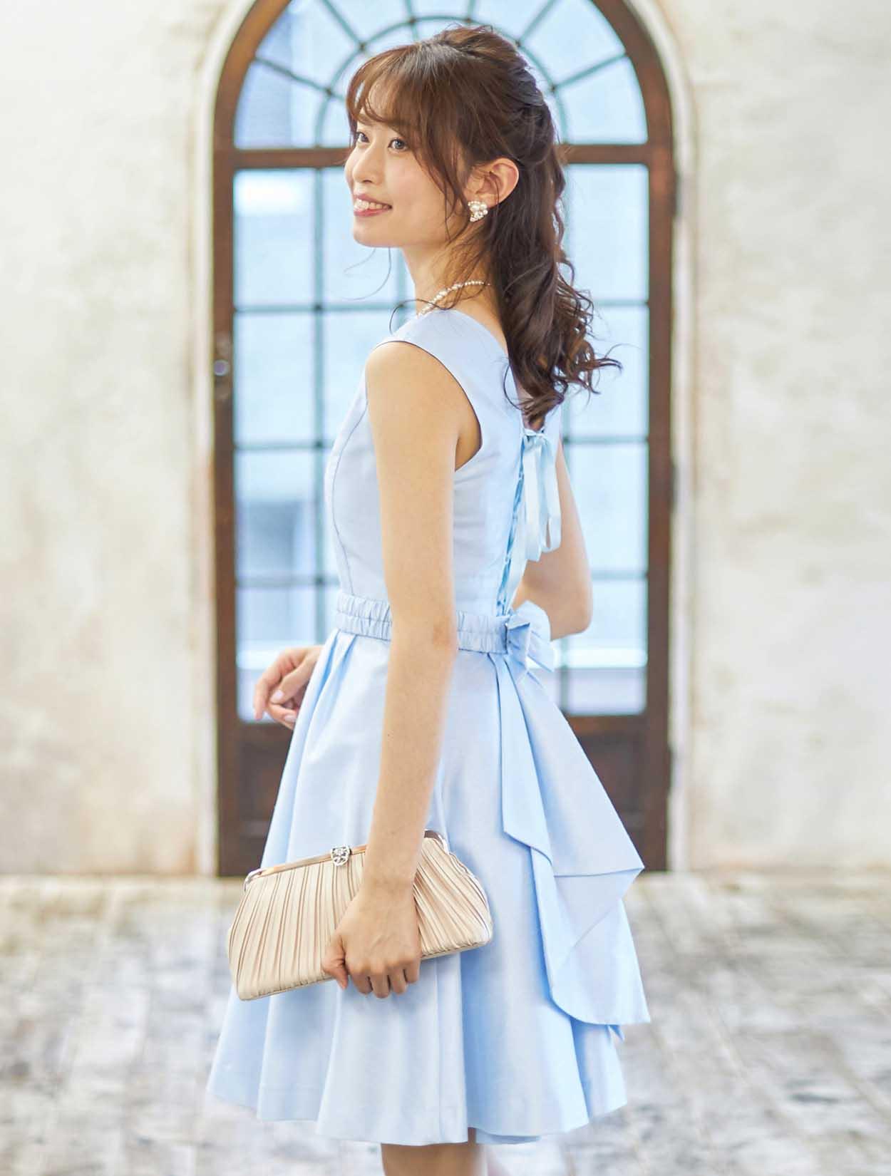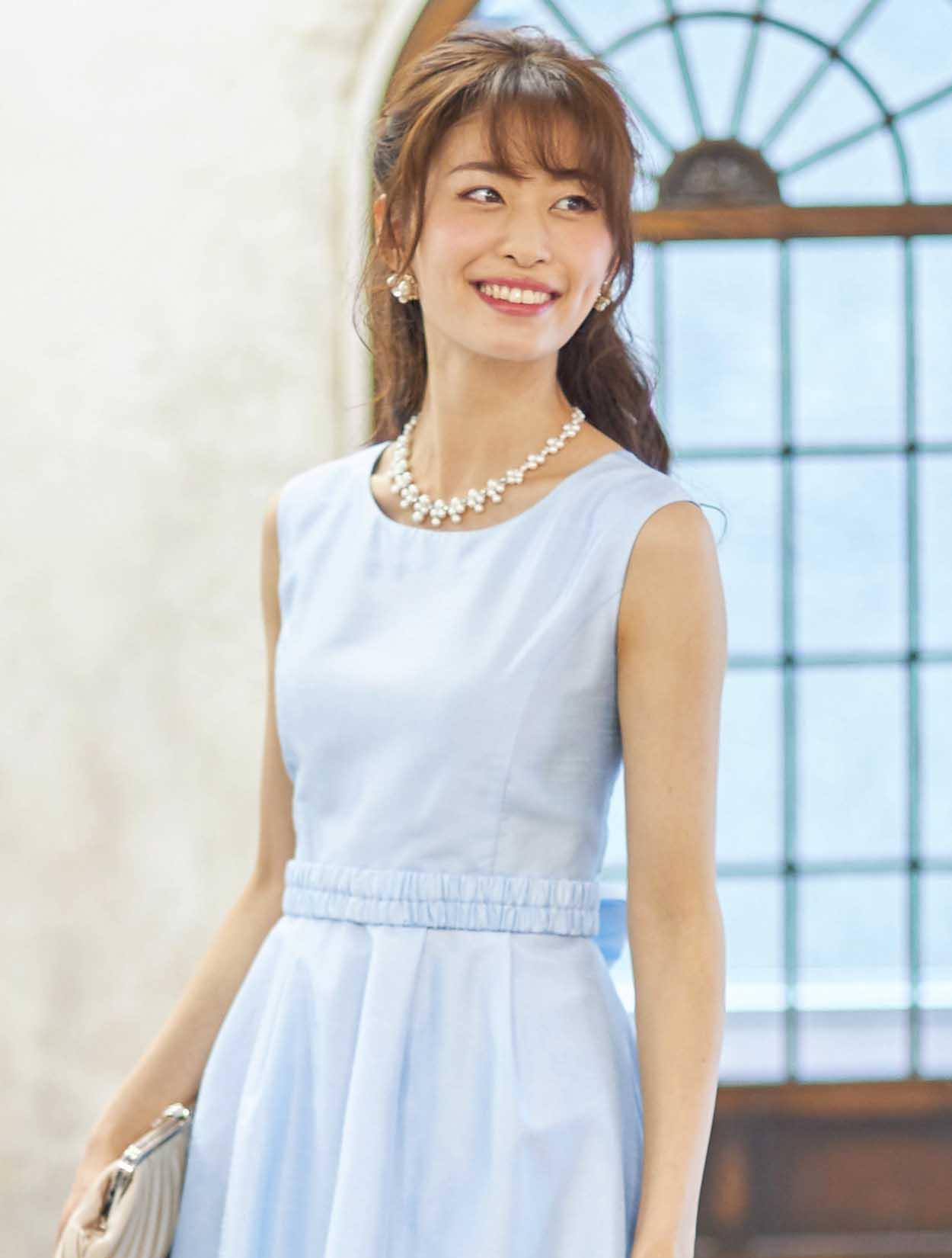 ■大きなリボンのベルトが付いた華やかなシャンタンドレス。