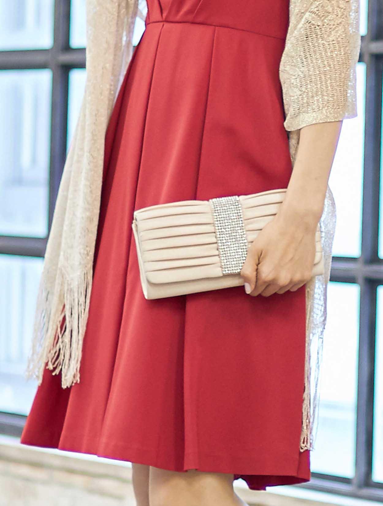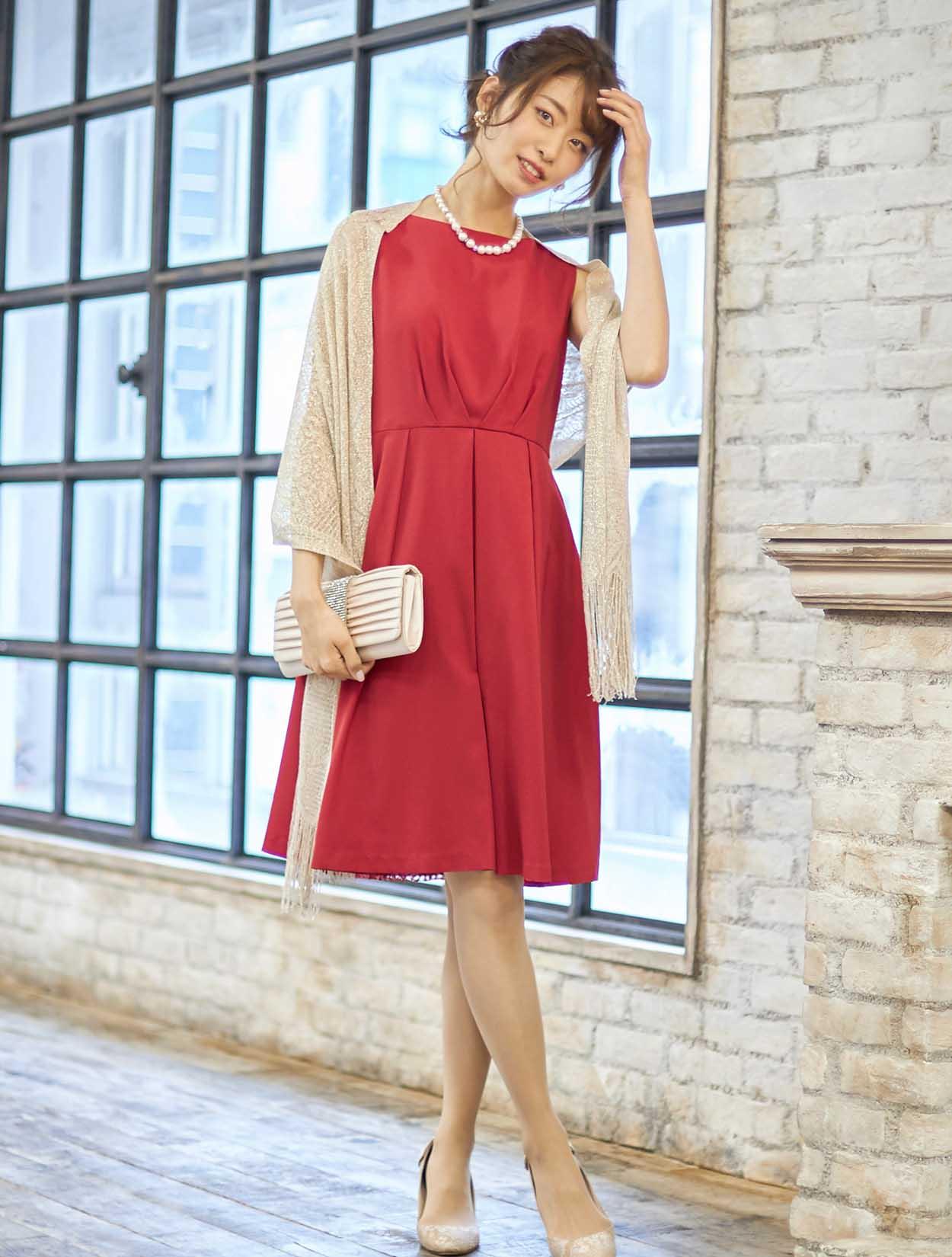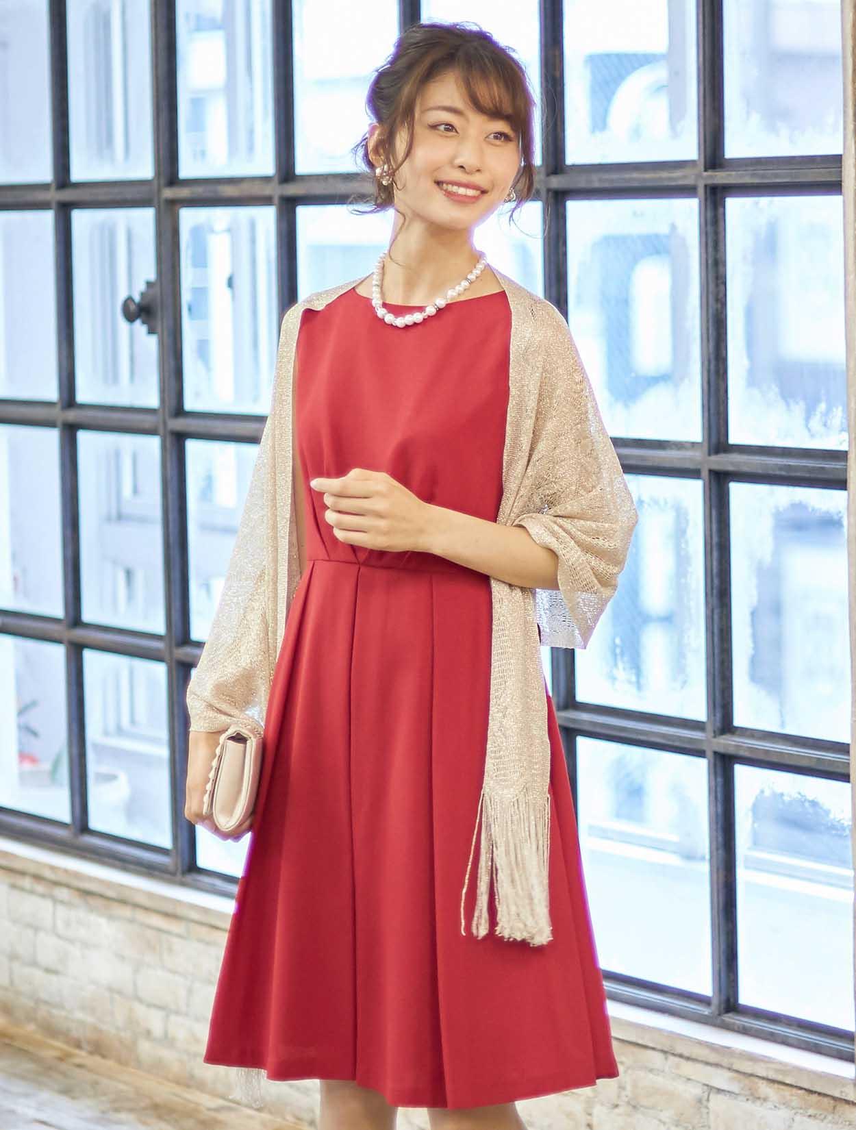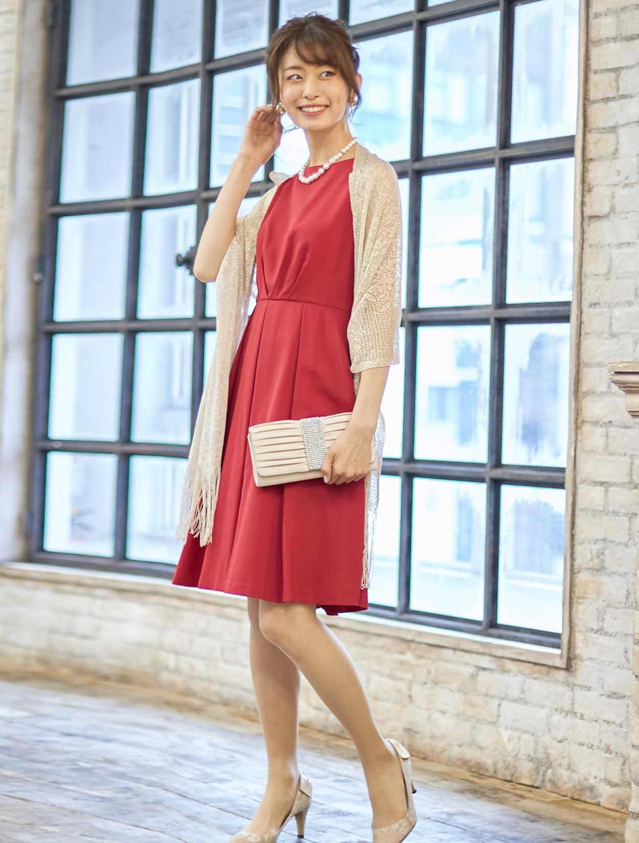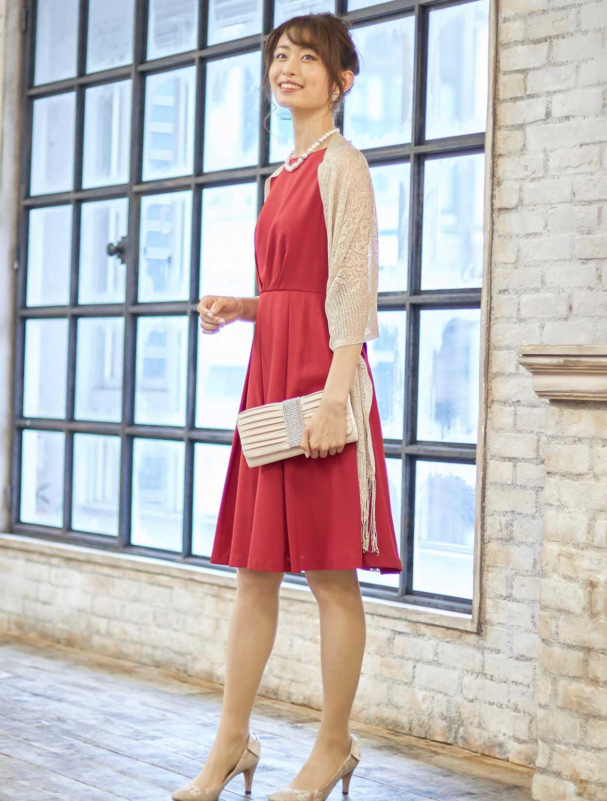 ■華やかなレッドカラーのドレスにベージュ系の小物で落ち着かせた大人コーディネートです。