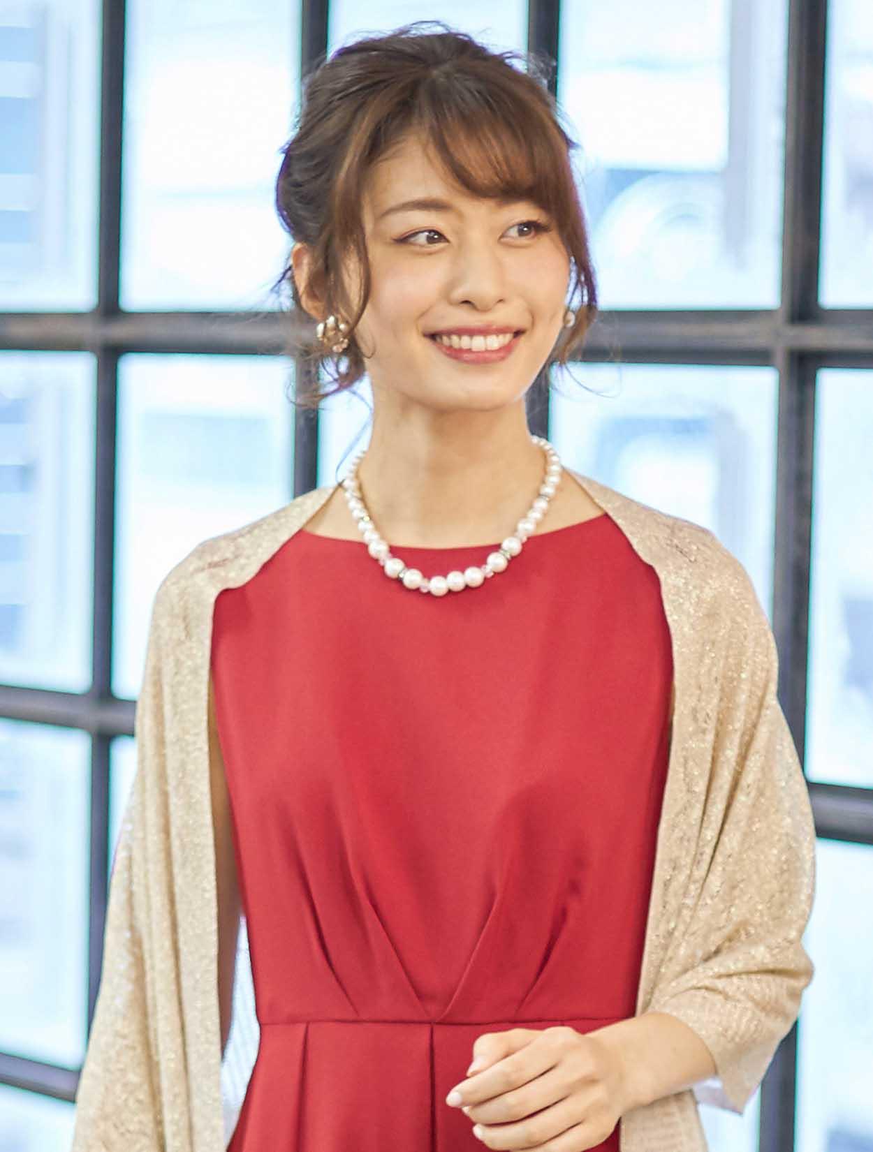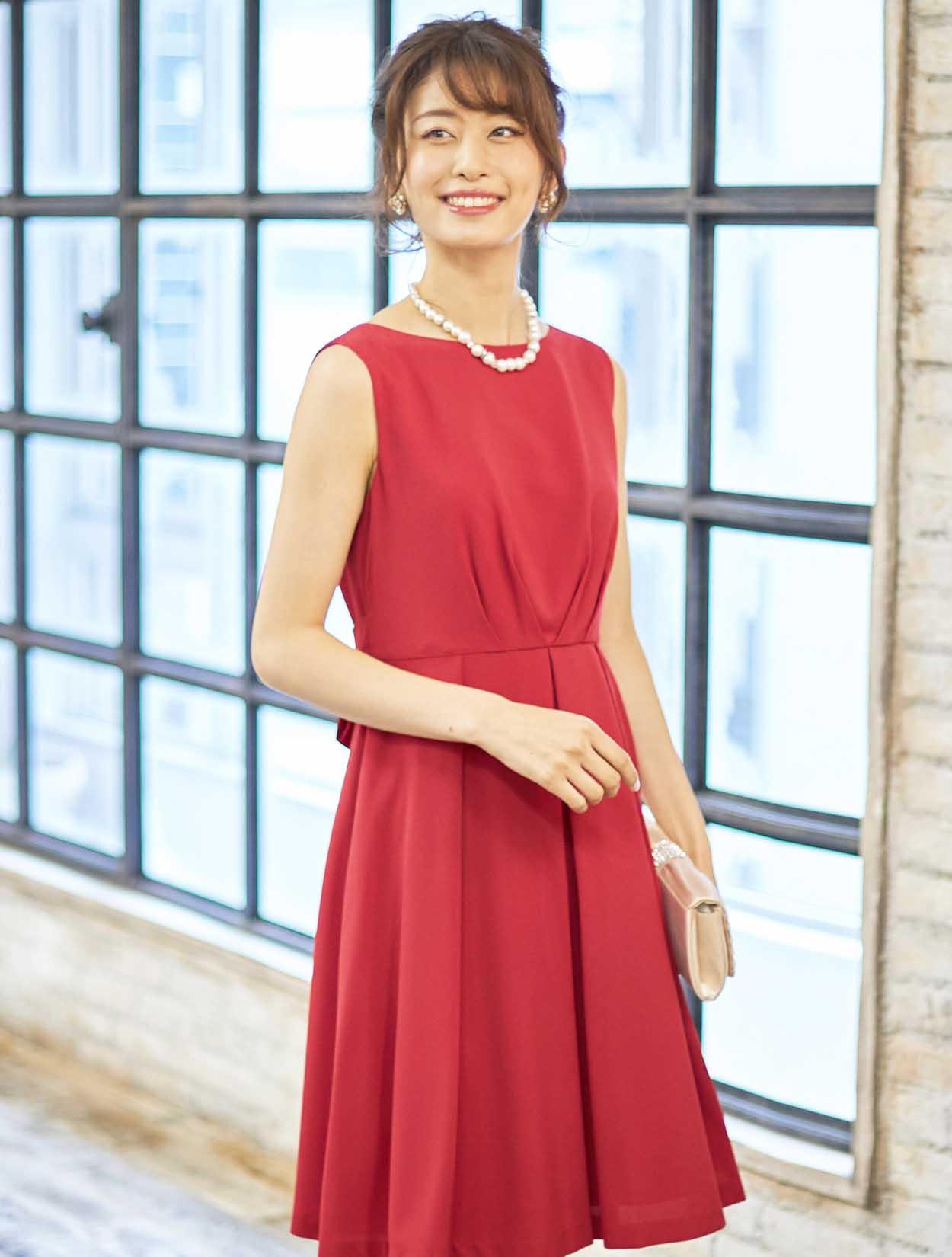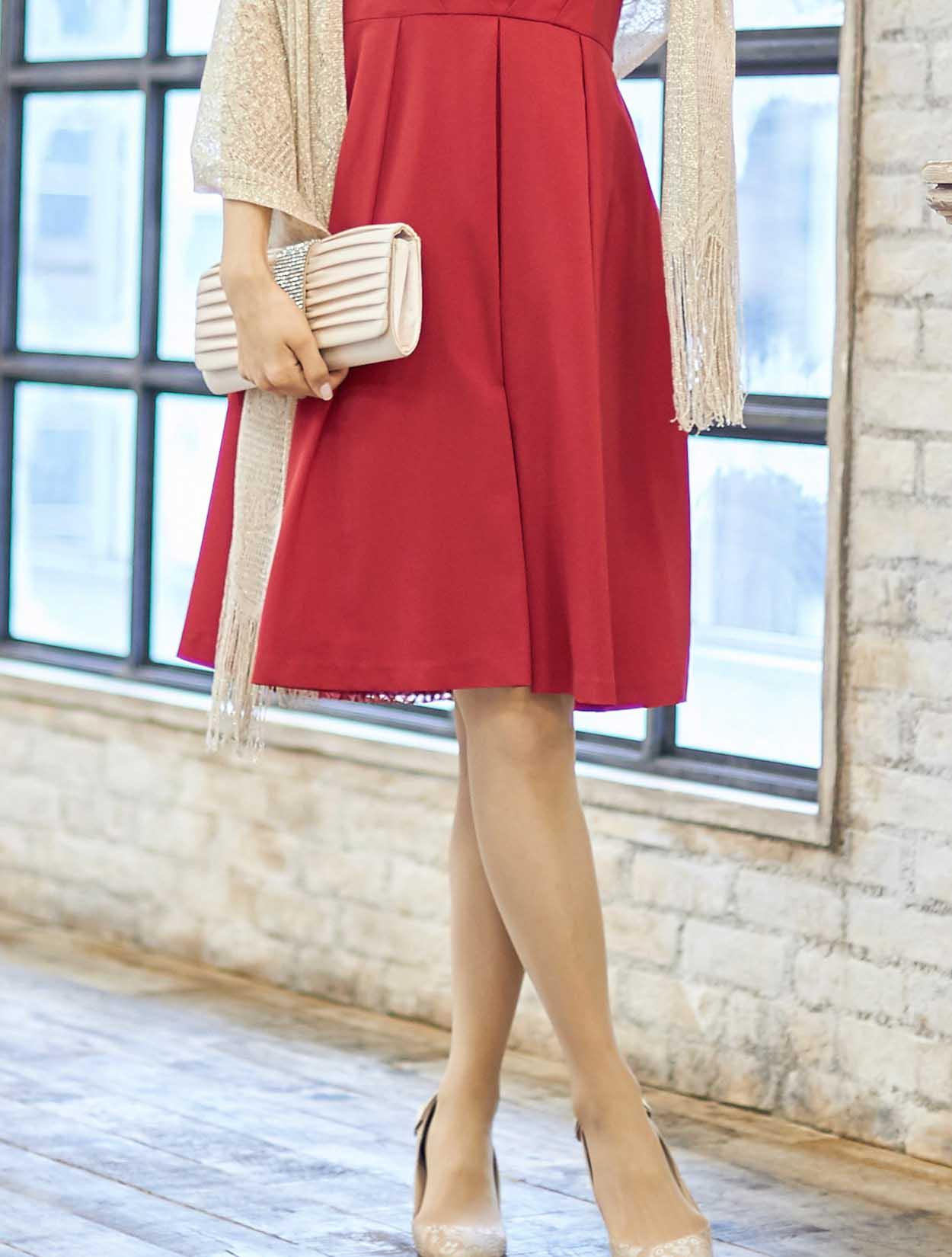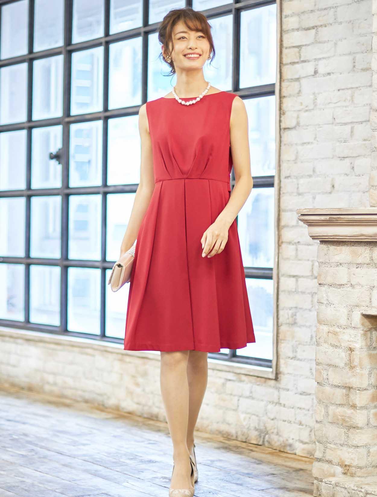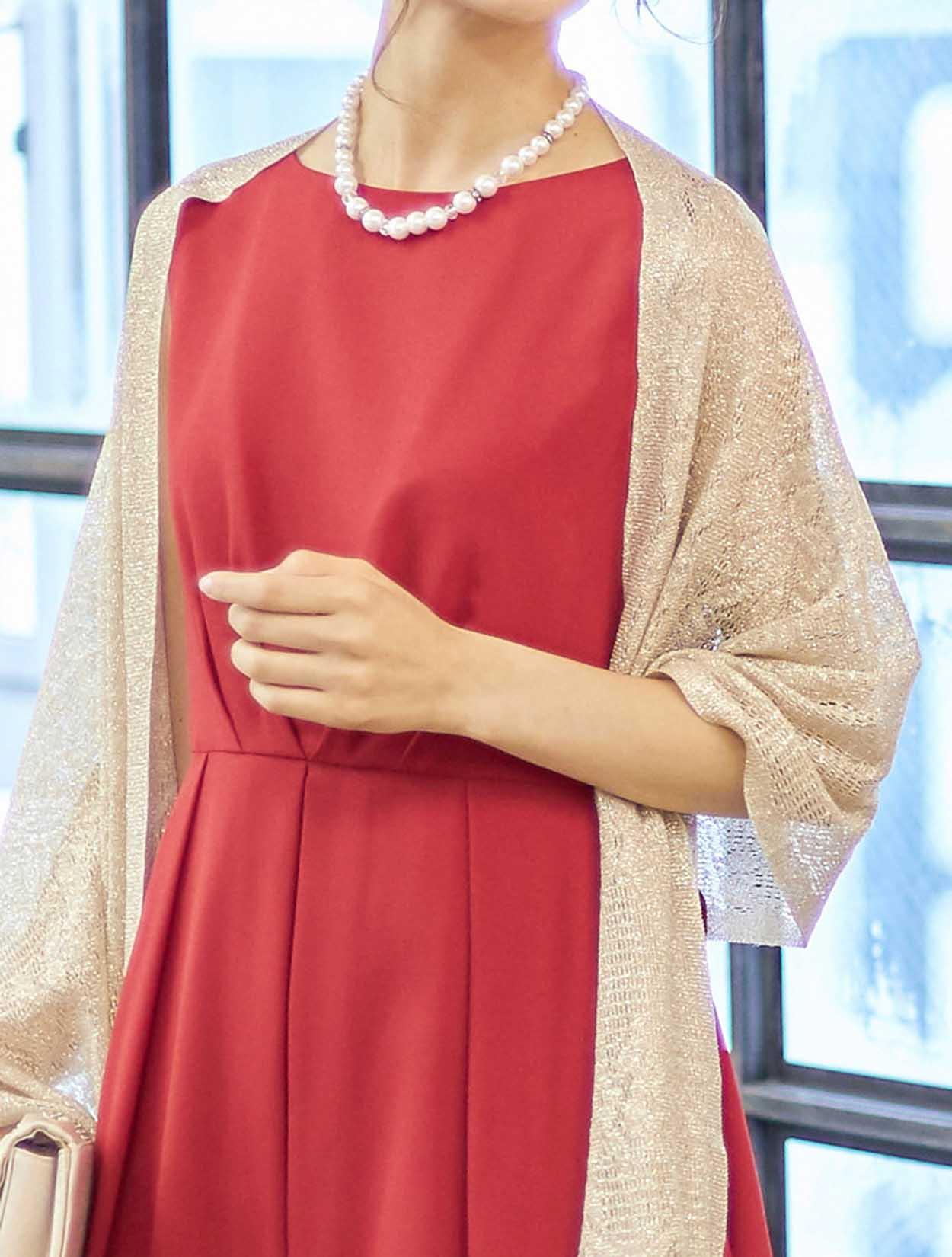 ■華やかなレッドカラーのドレスにベージュ系の小物で落ち着かせた大人コーディネートです。