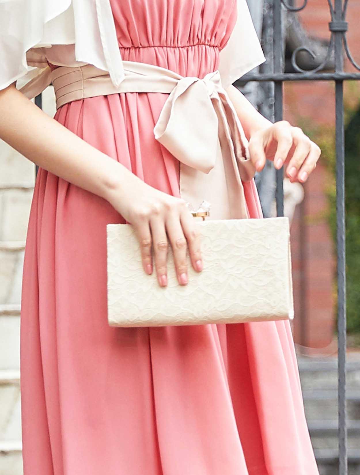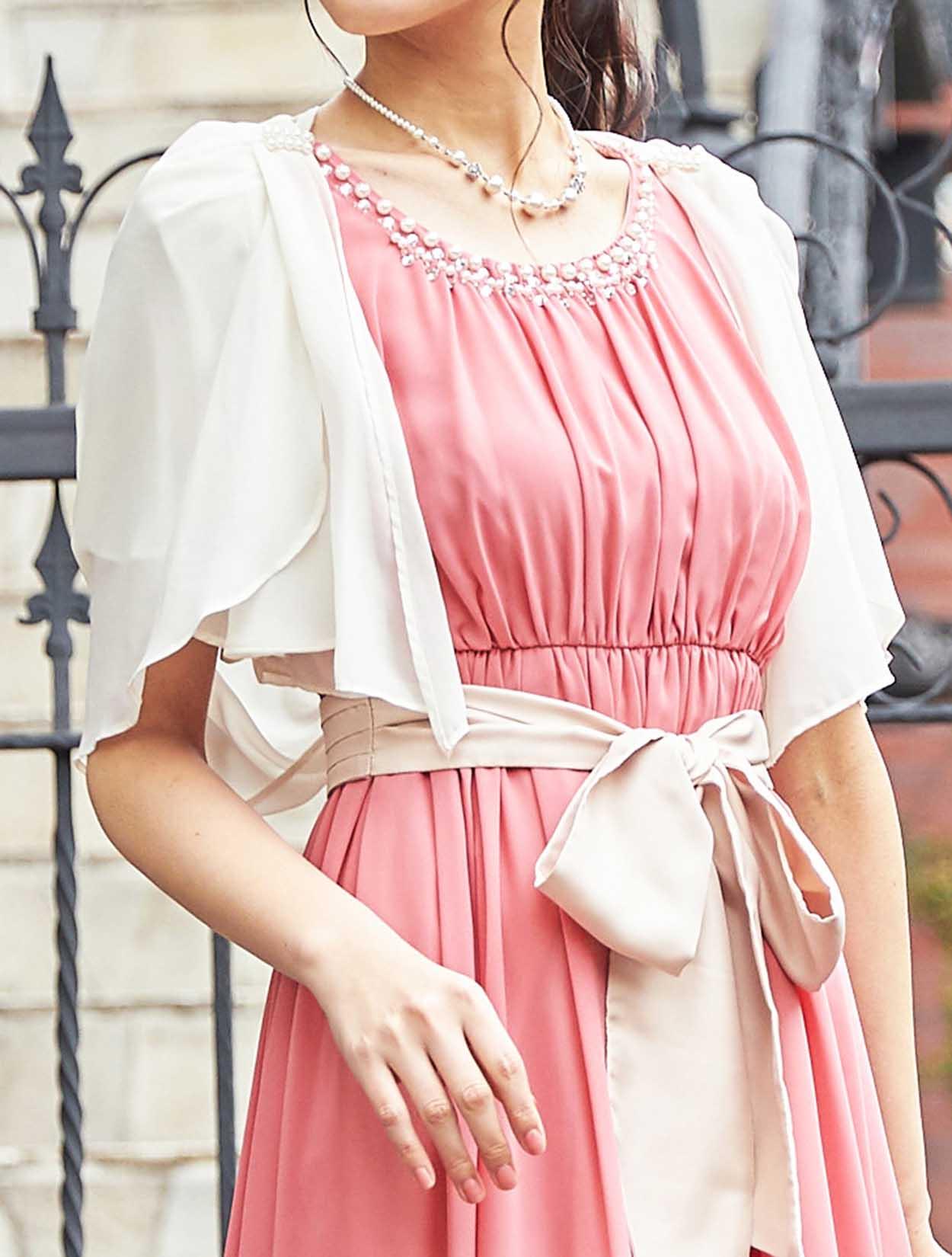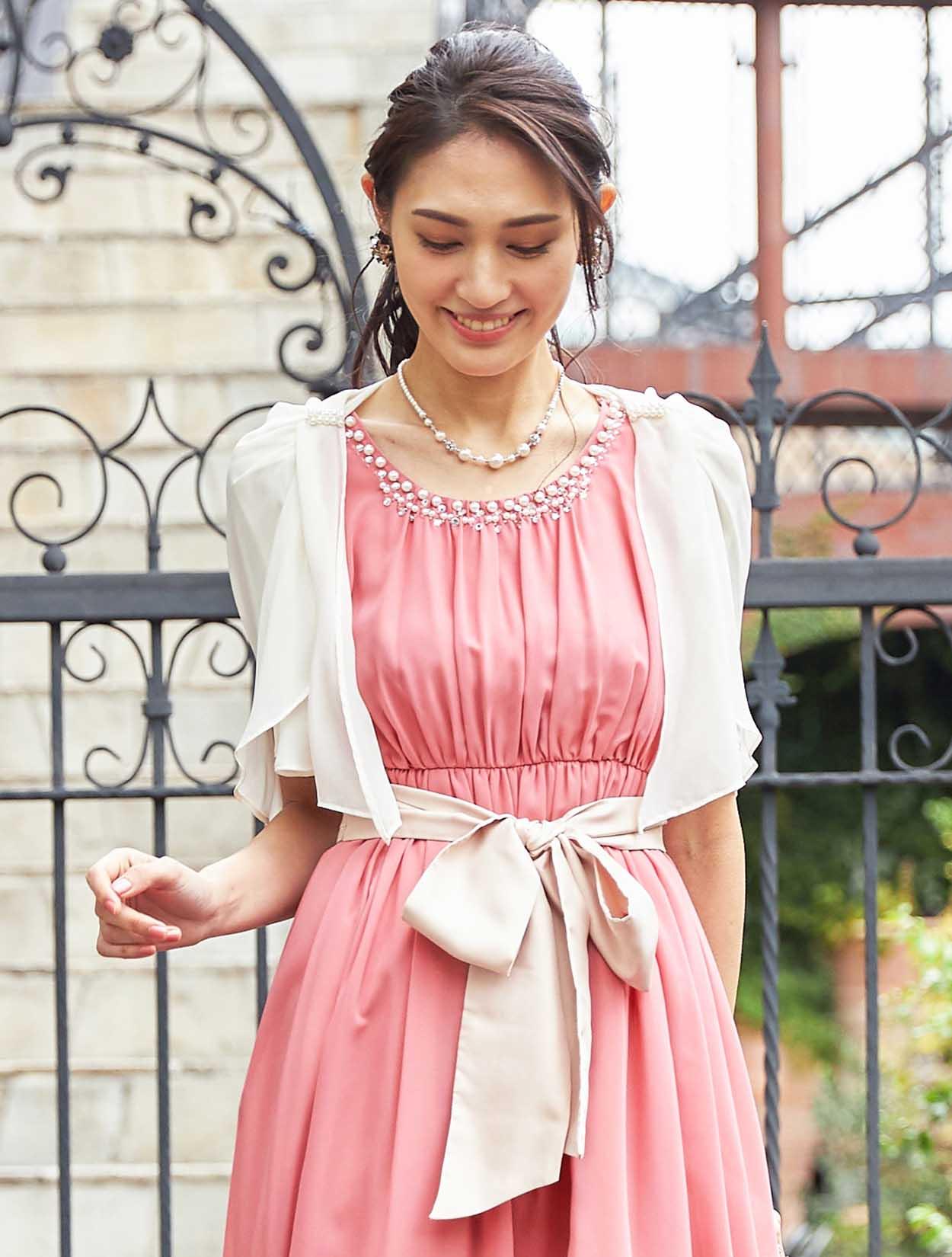 ■明るいピンクのミモレ丈ドレスにシフォンのボレロを合わせた落ち着いた可愛らしさのあるコーディネートです。