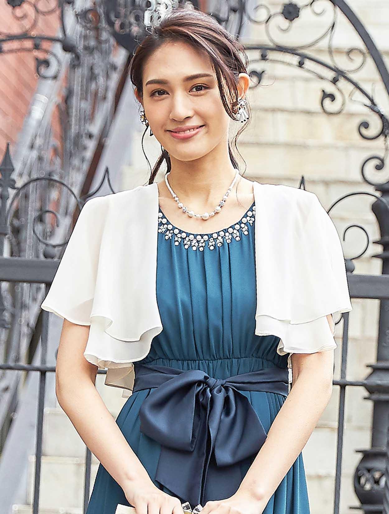 ■明るいベージュの羽織とブルーのドレスが爽やかなコーディネートです。