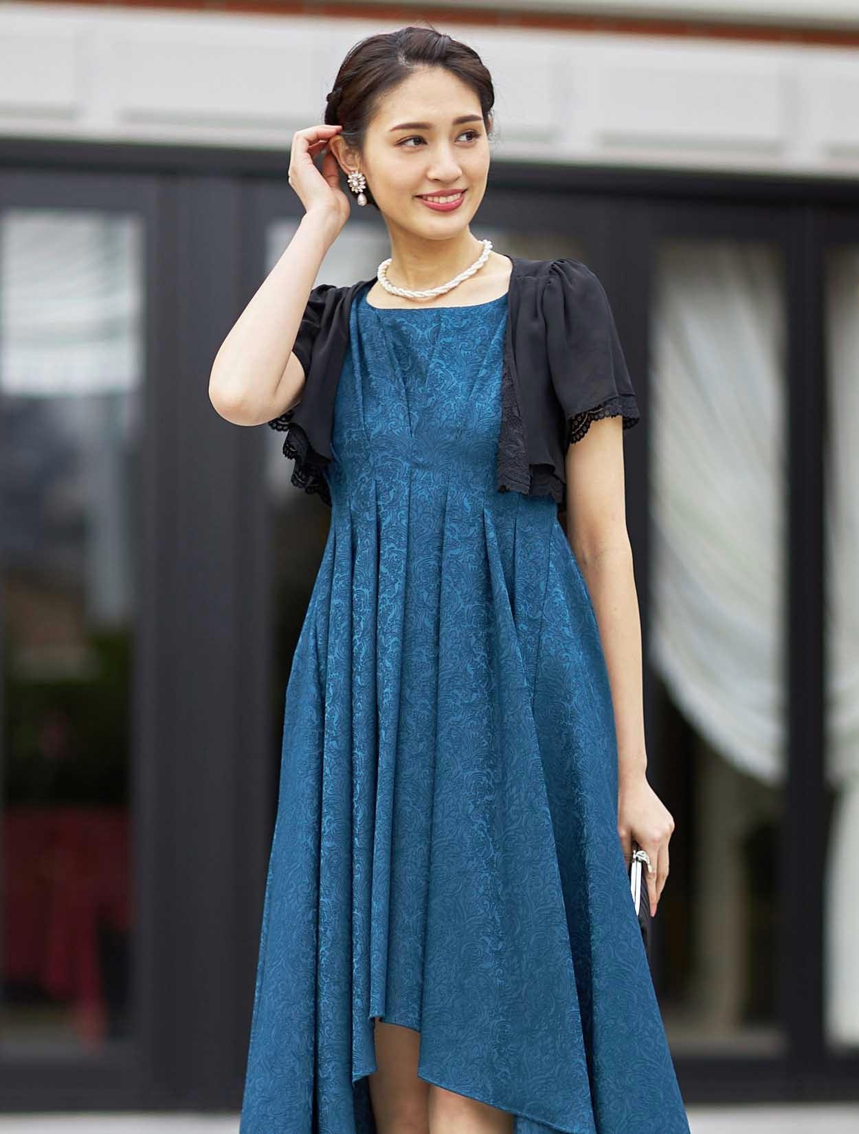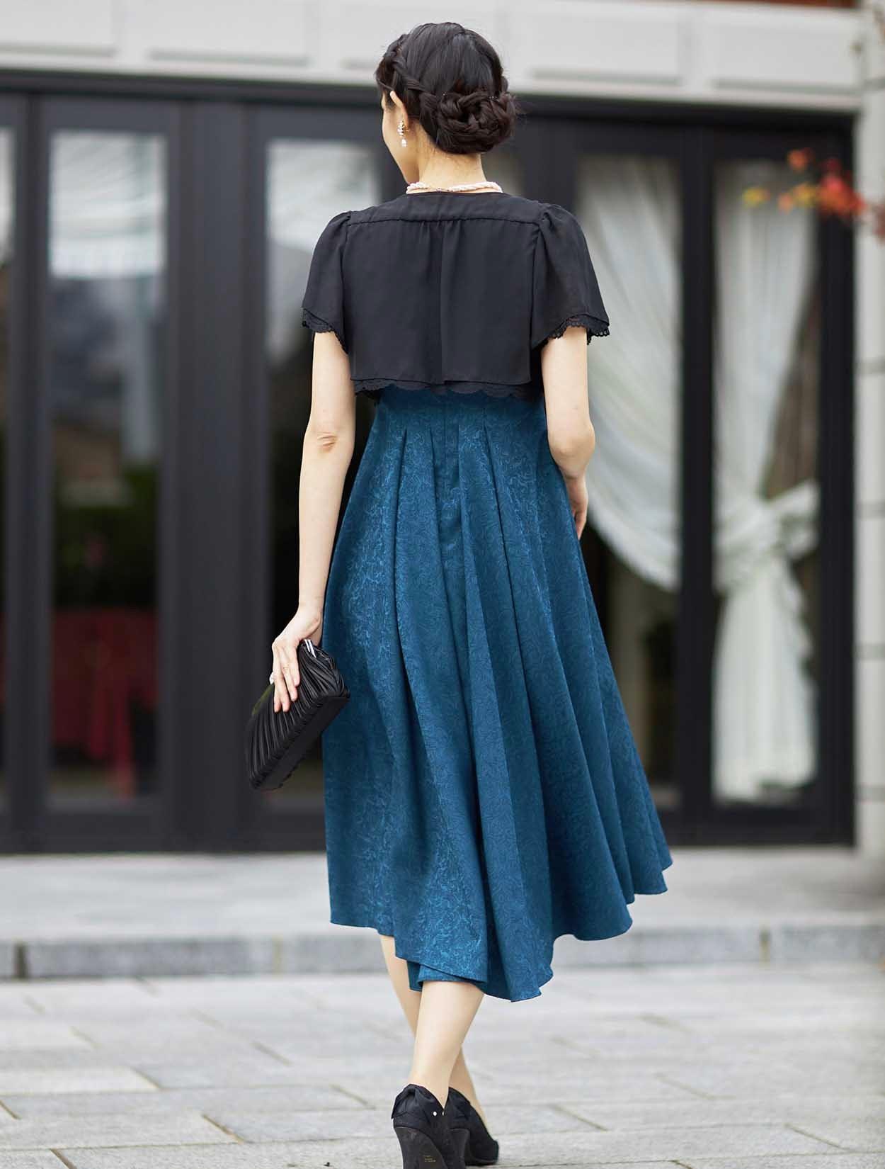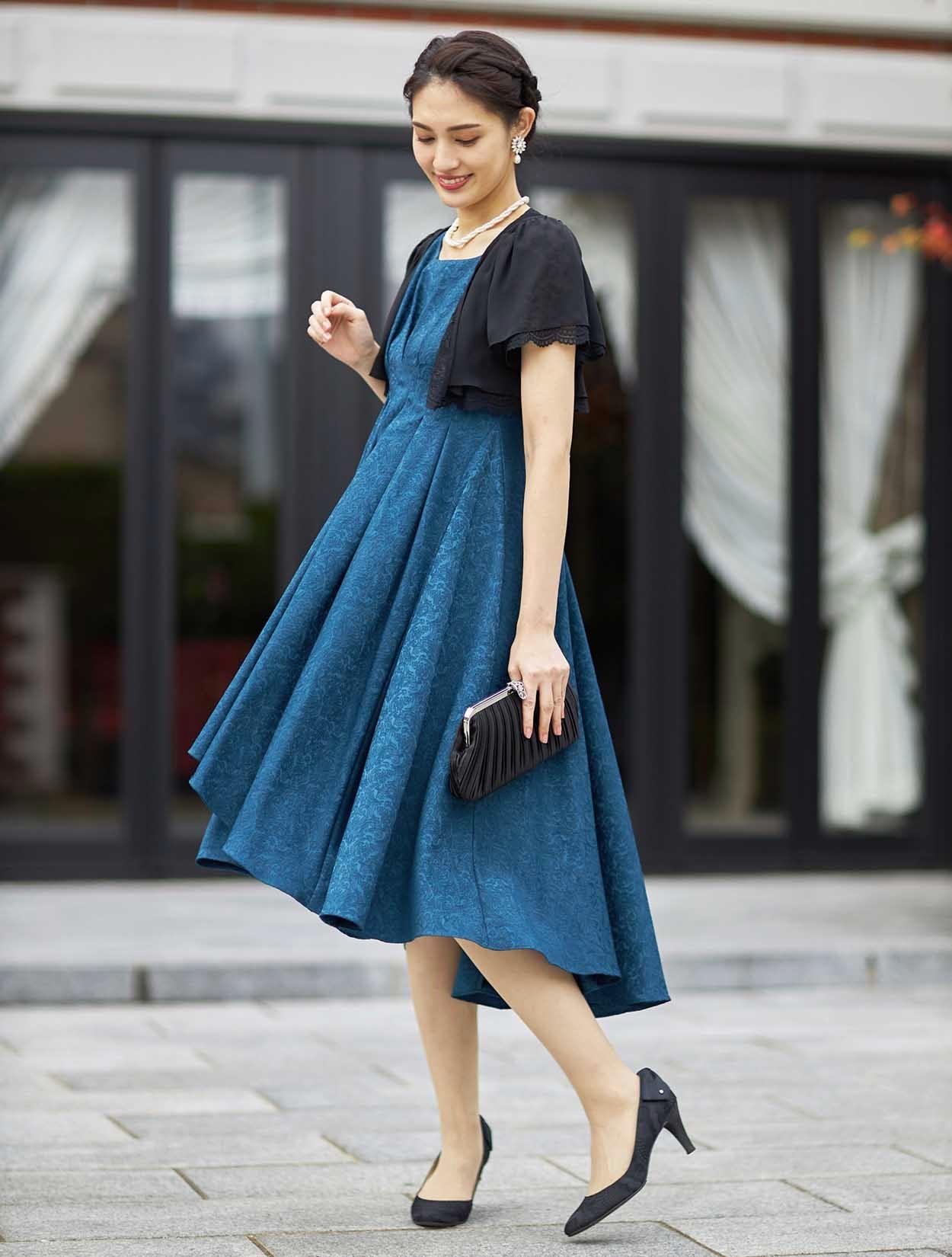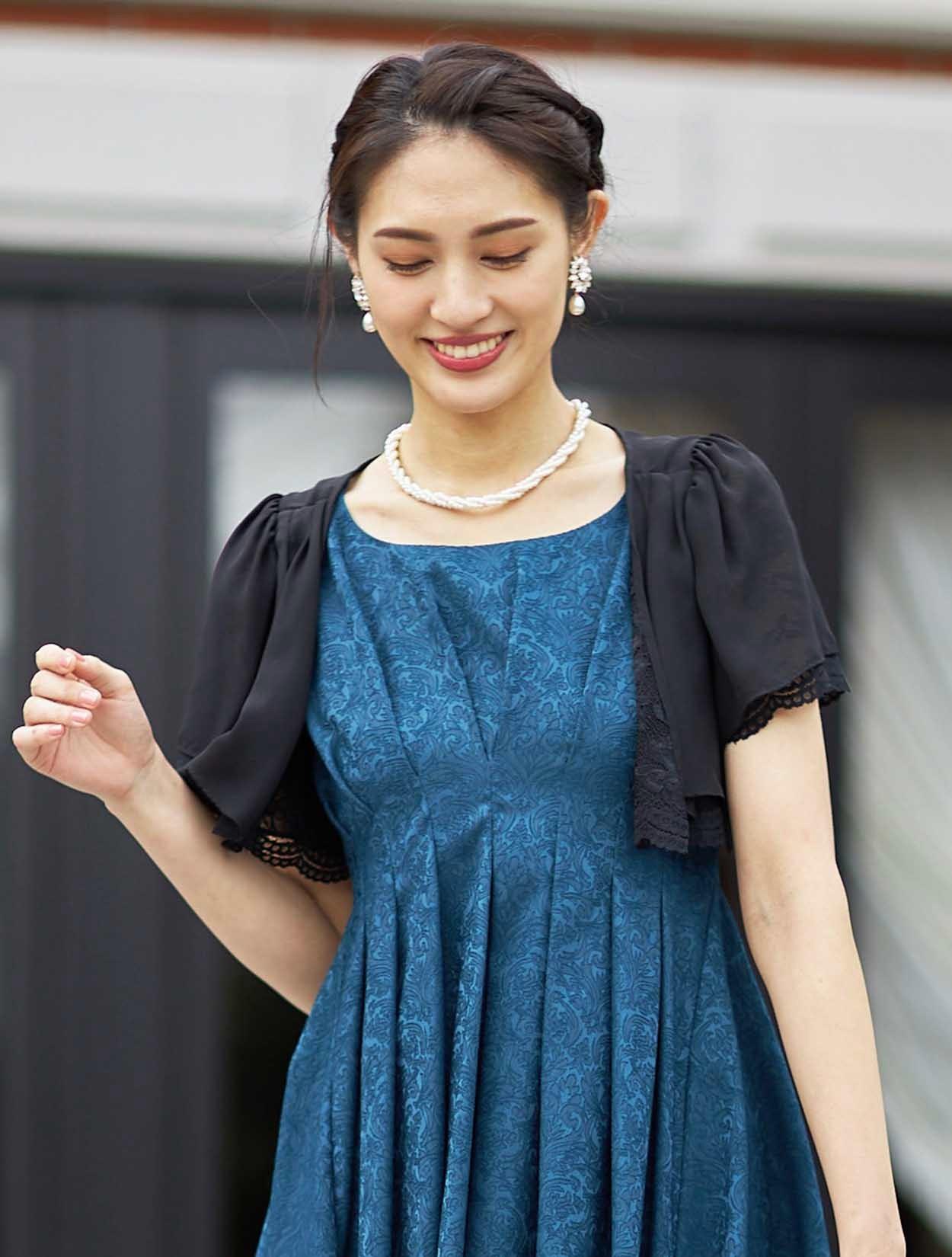 ■ショート丈のボレロが入ウエストのドレスと合ってスタイルアップ効果があります。ブラックの羽織でメリハリのあるコーディネートです。