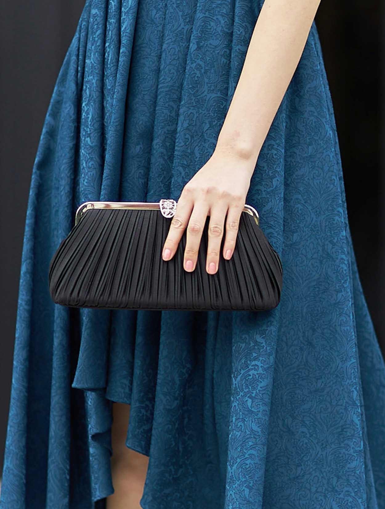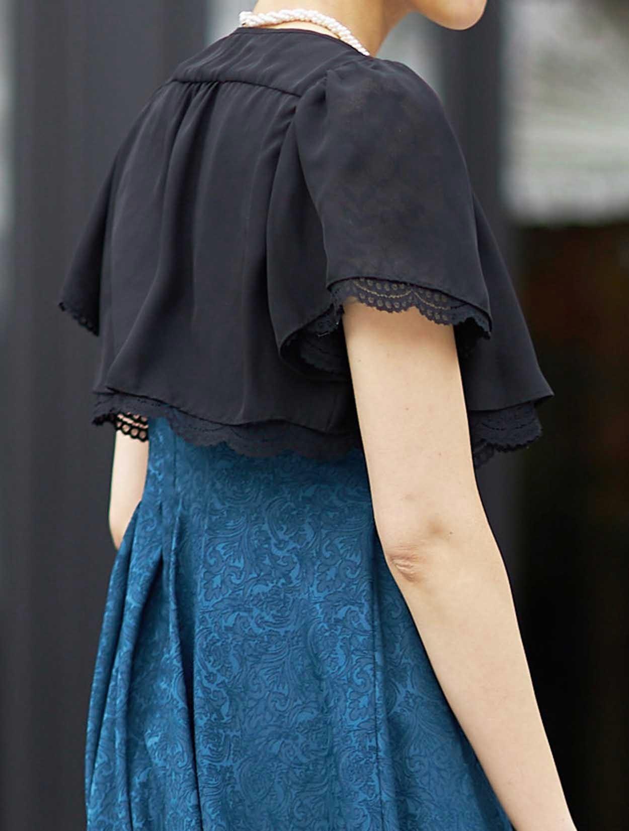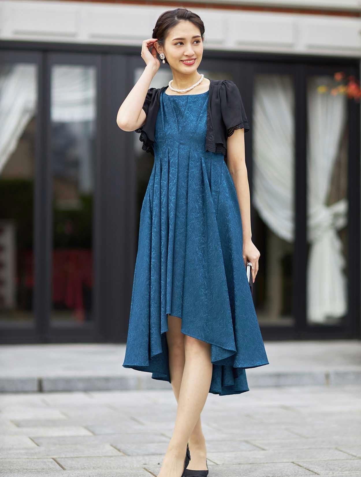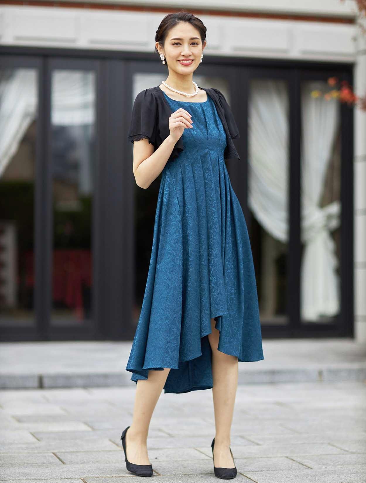 ■ショート丈のボレロが入ウエストのドレスと合ってスタイルアップ効果があります。ブラックの羽織でメリハリのあるコーディネートです。