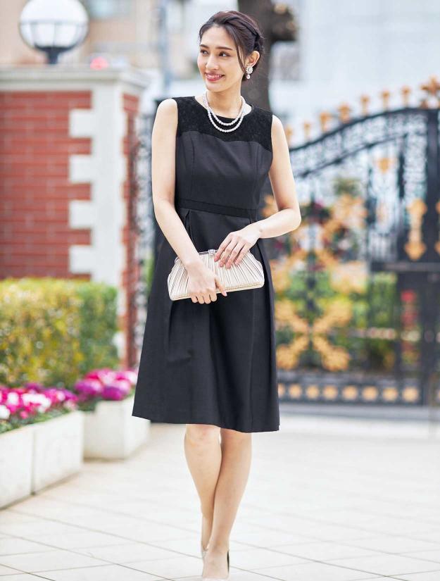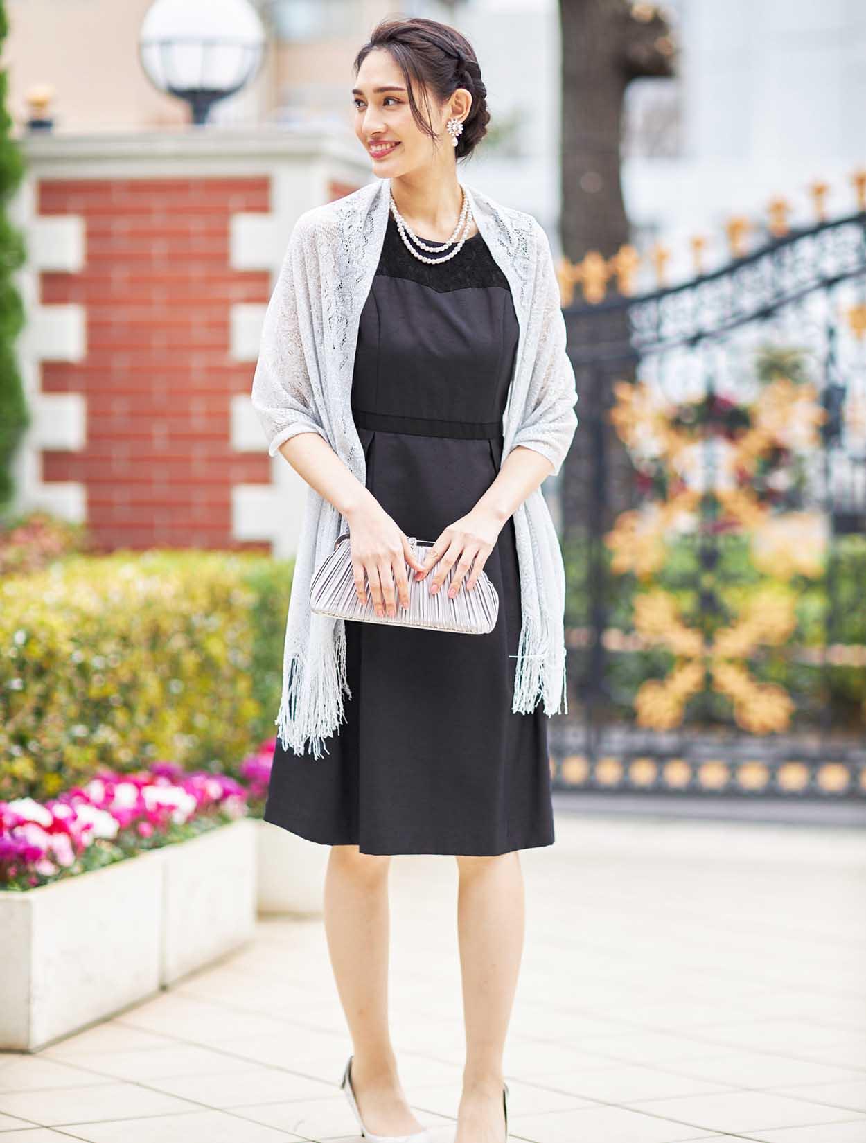 ■シャンタン素材を使用した、きちんと感のあるドレス。フロント部分のレース切替がアクセントになったシンプルデザイン。