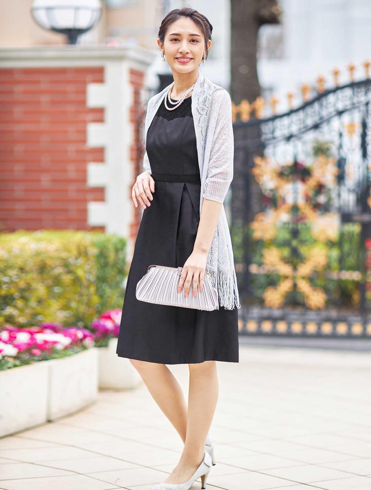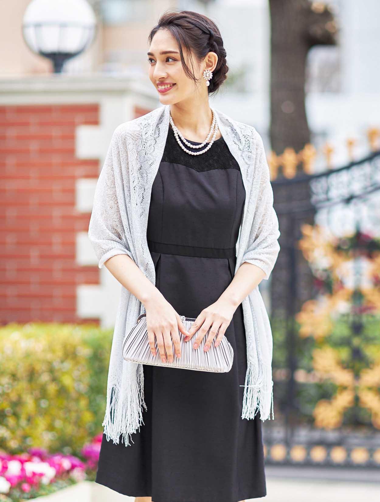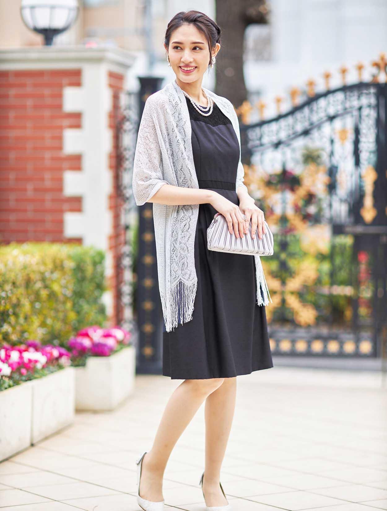 ■きちんと感のある落ち着いたドレスにシルバーのラメストールを合わせて少しパーティー感をプラスしたコーディネート。ネイビーにシルバーの合わせは大人っぽく落ち着いた印象なので、ご親族様にもおすすめです。