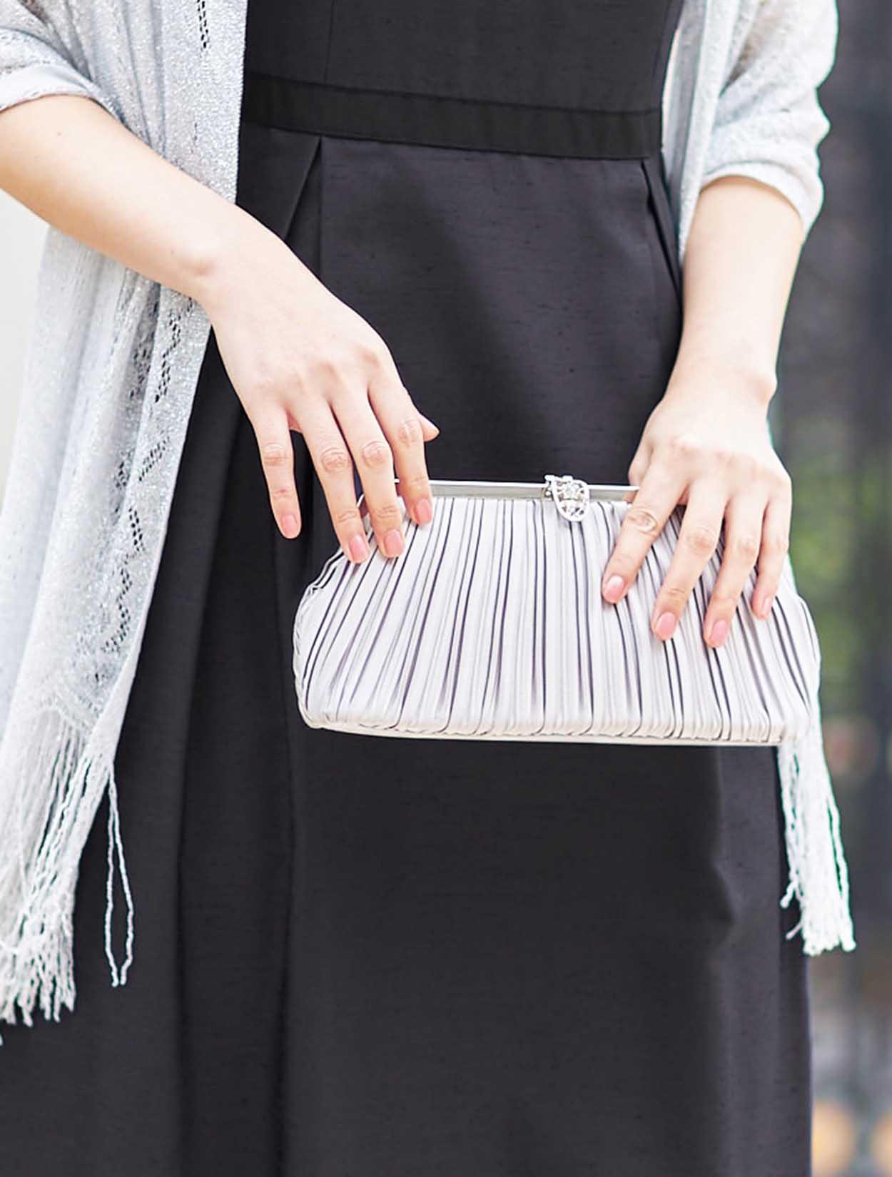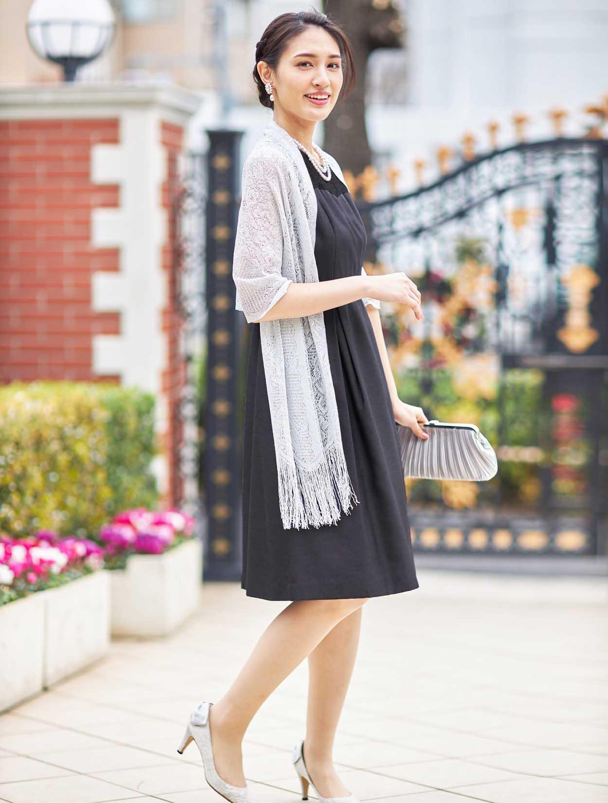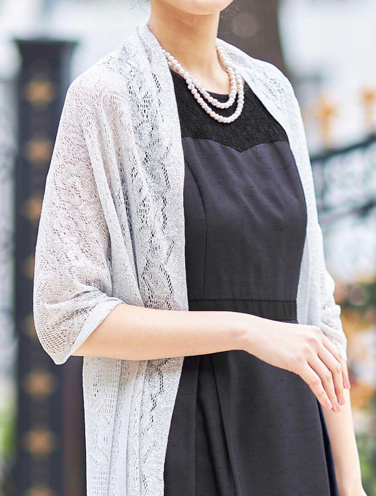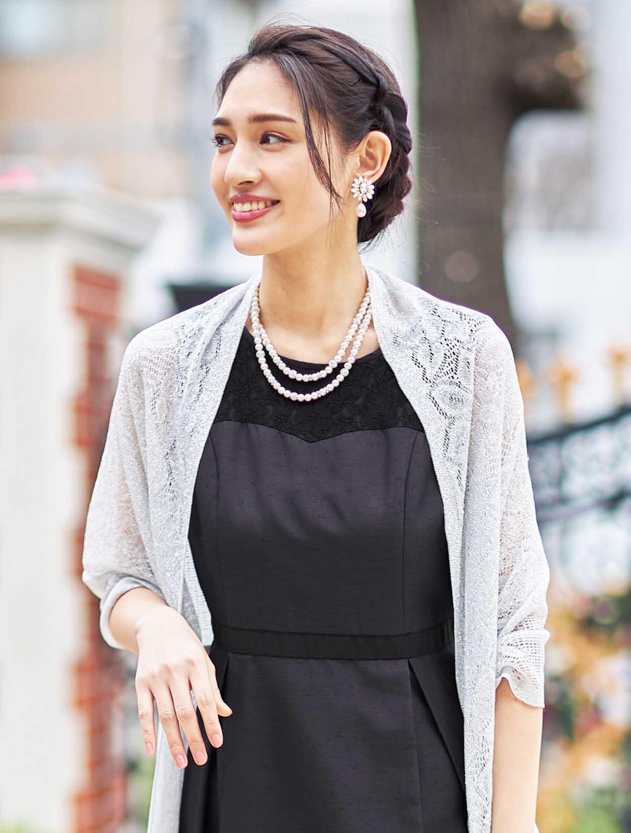 ■きちんと感のある落ち着いたドレスにシルバーのラメストールを合わせて少しパーティー感をプラスしたコーディネート。ネイビーにシルバーの合わせは大人っぽく落ち着いた印象なので、ご親族様にもおすすめです。