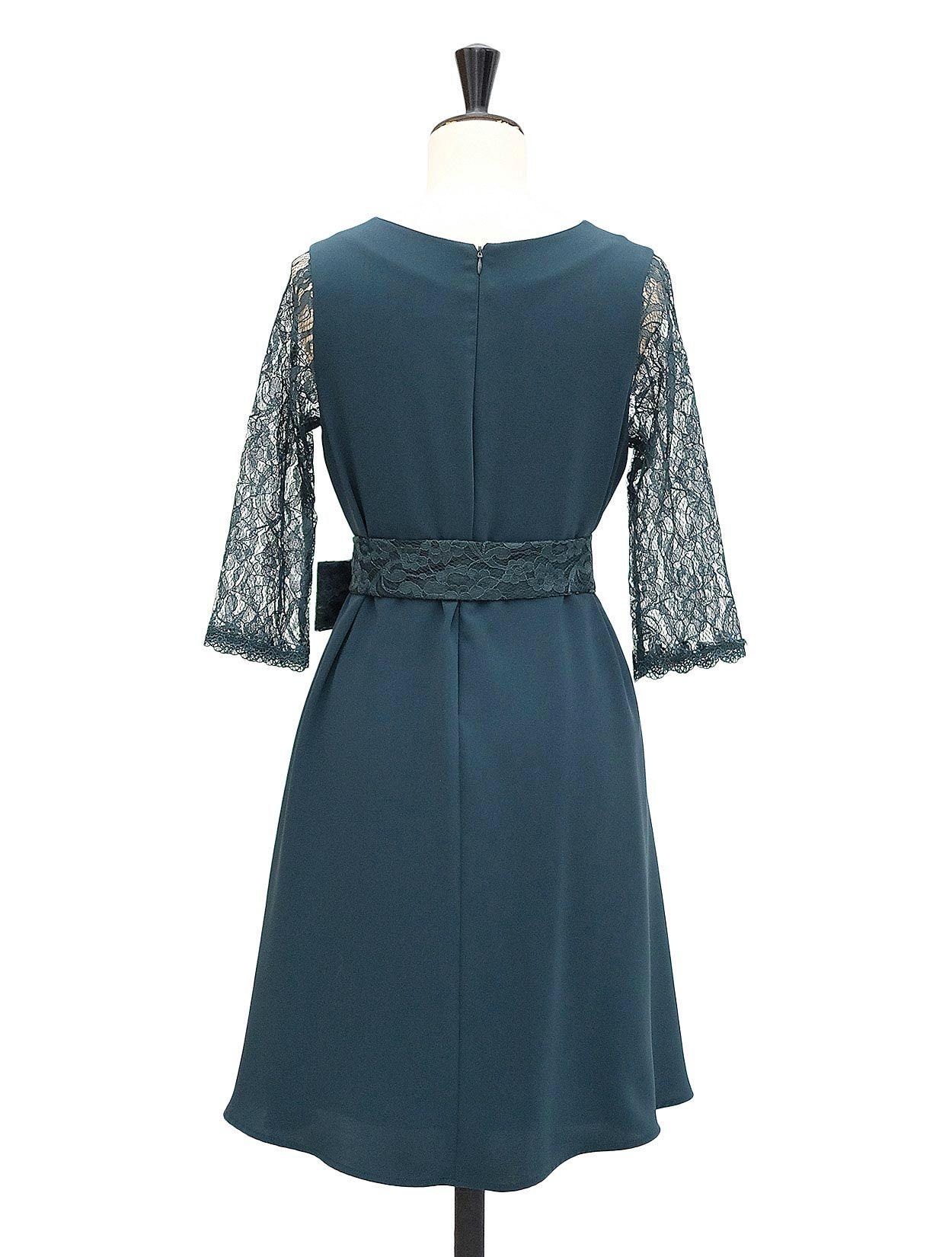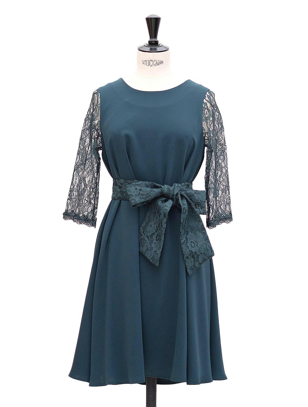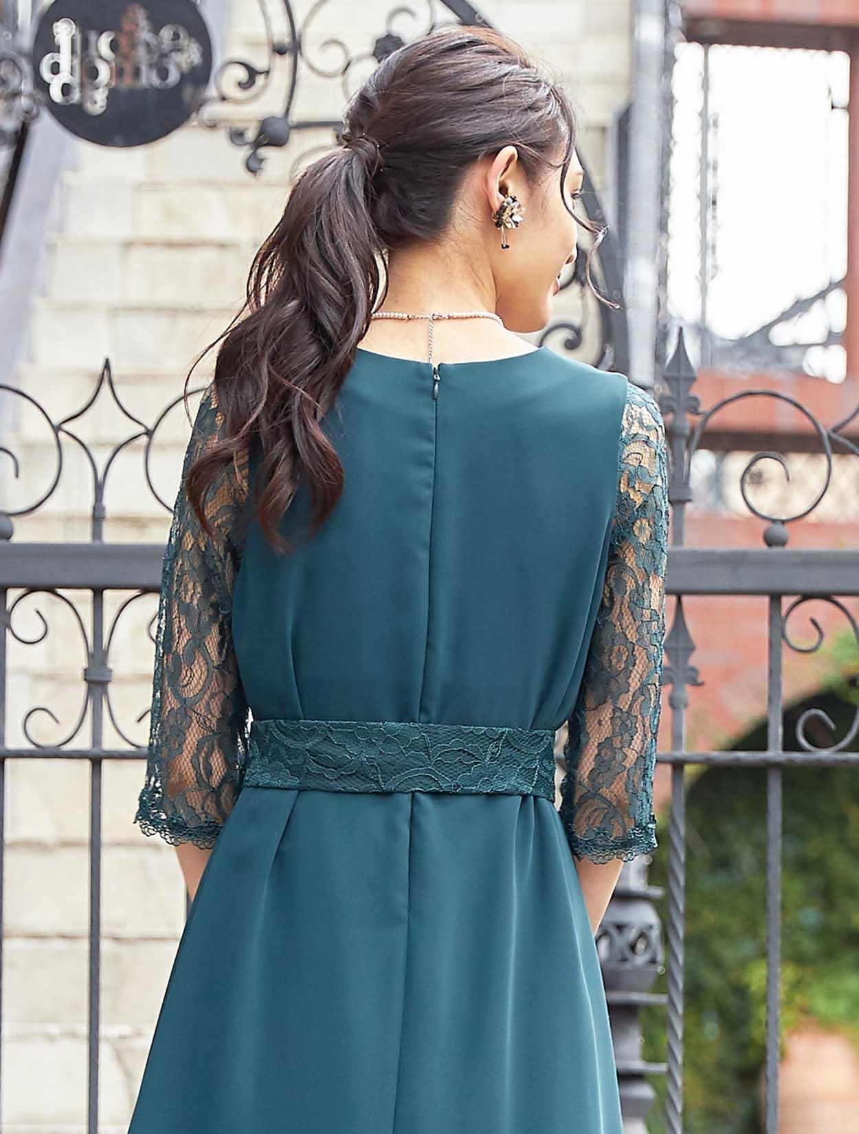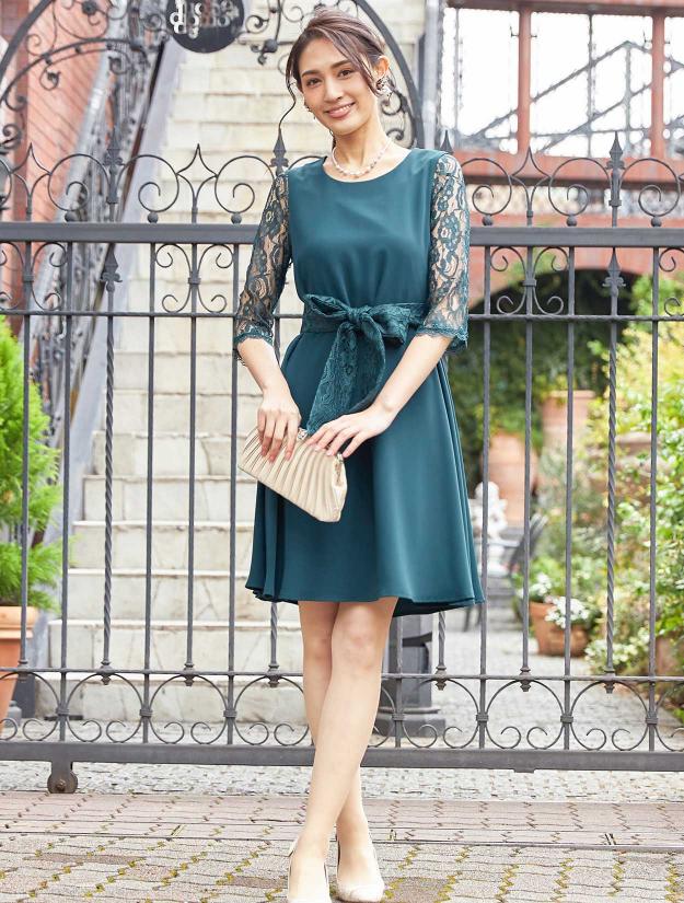 ■キレイなグリーンのドレスに上品なベージュのバッグのコーディネートです。シンプルなネックレスで、お袖のレースが引き立ちます。
