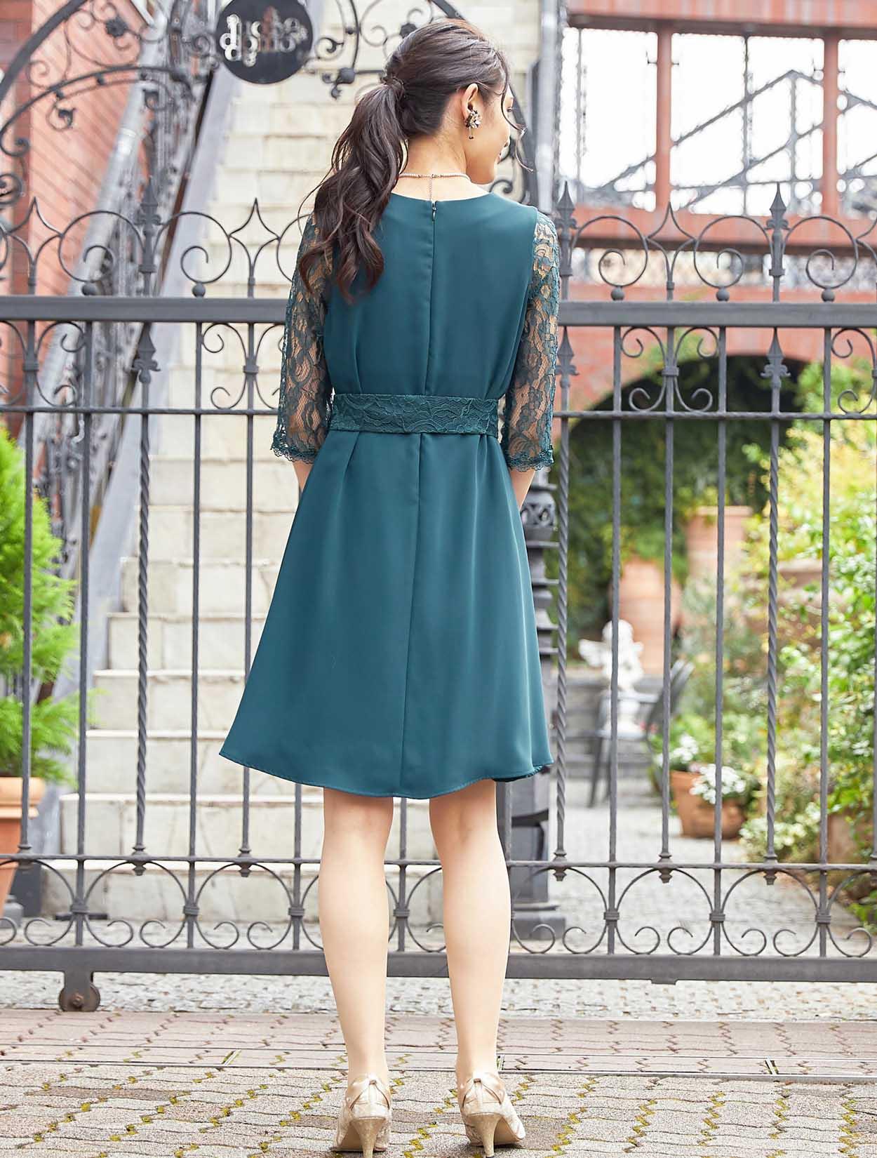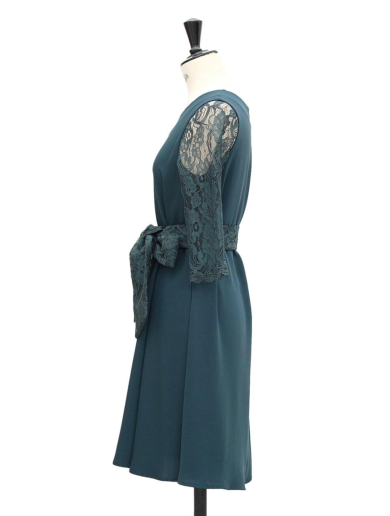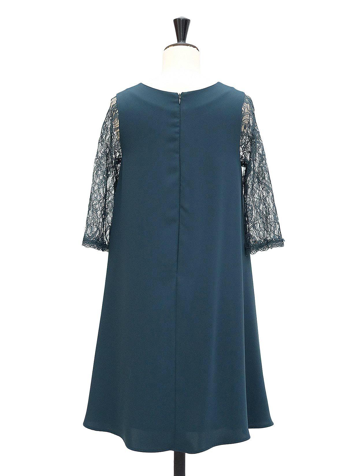 ■キレイなグリーンのドレスに上品なベージュのバッグのコーディネートです。シンプルなネックレスで、お袖のレースが引き立ちます。