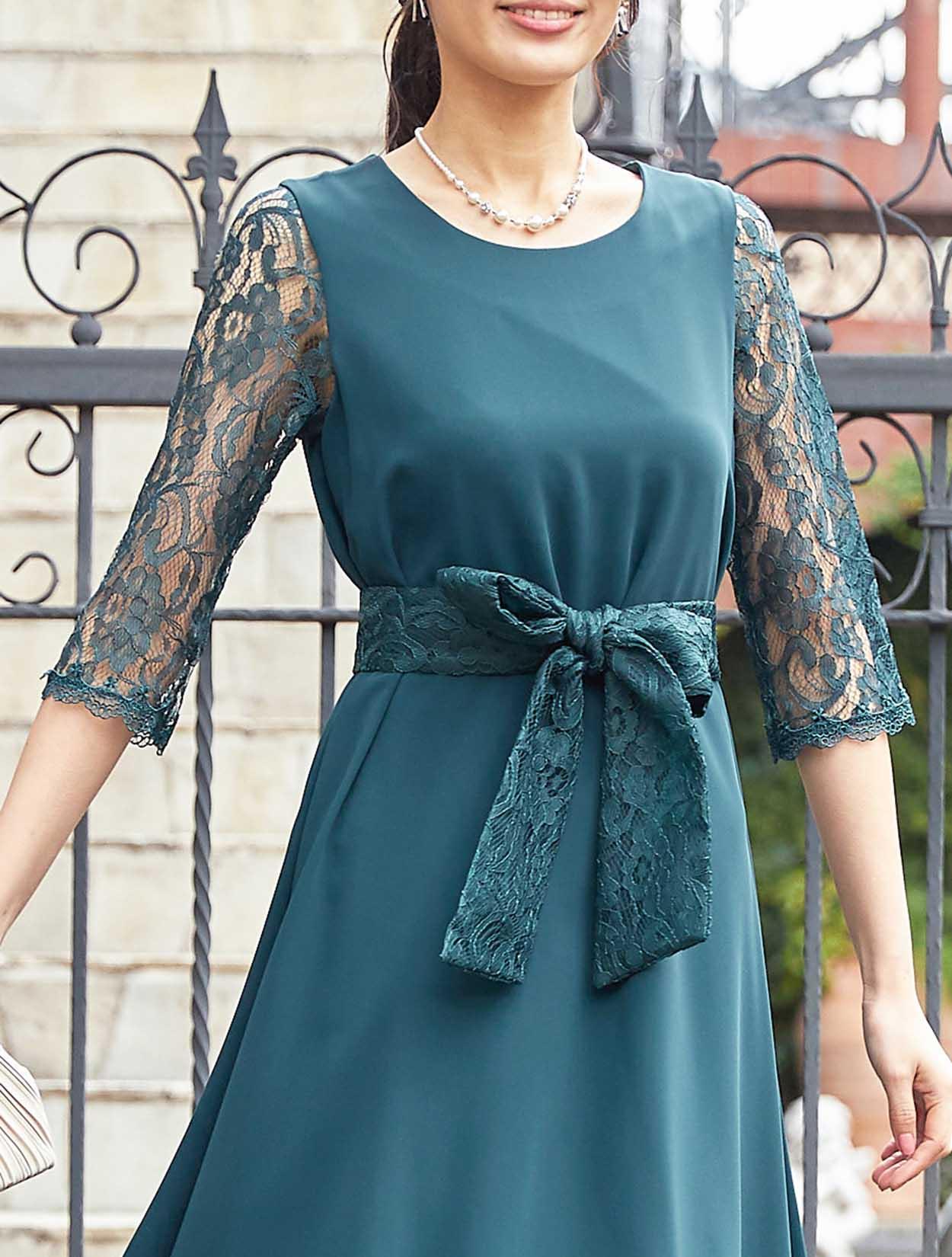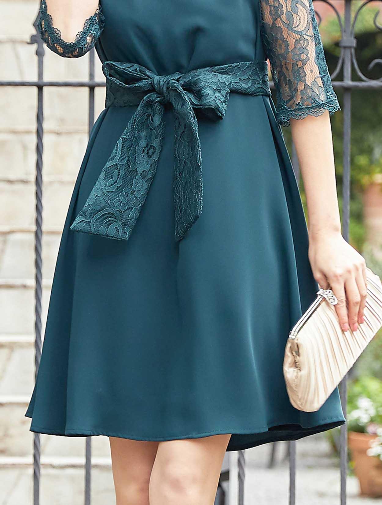 ■Aラインスカートでも華やかですが、アクセントにレースでできたリボンベルトを使えば、ウエストシェイプをしたスッキリとしたスカートラインも楽しめます。