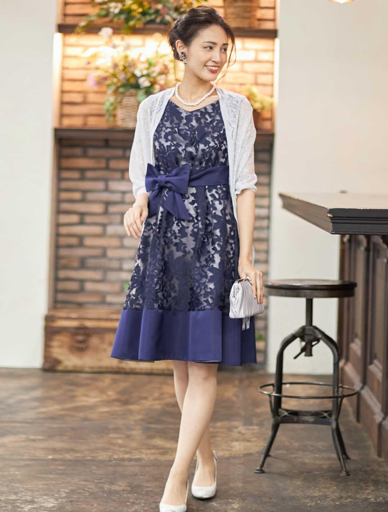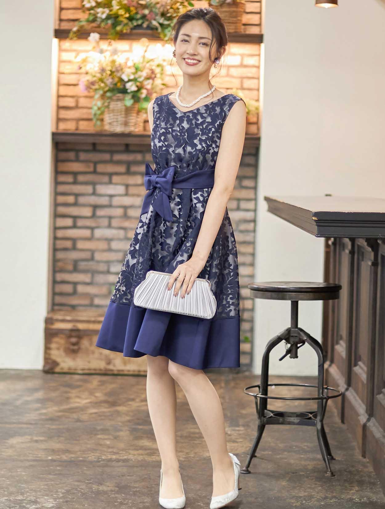 ■透け感のあるオーガンジーに花柄の刺繍が施された高級感漂うドレスです。ネイビーの刺繍で上品シックに決まります。