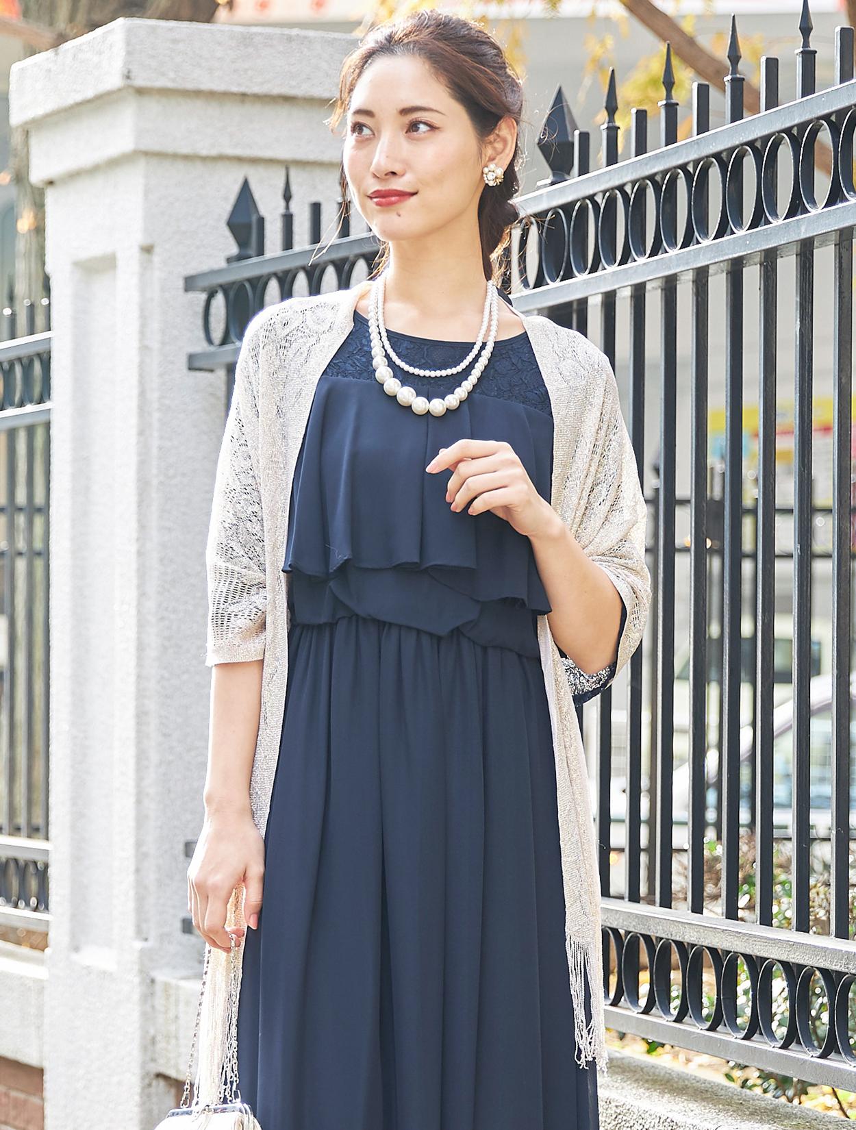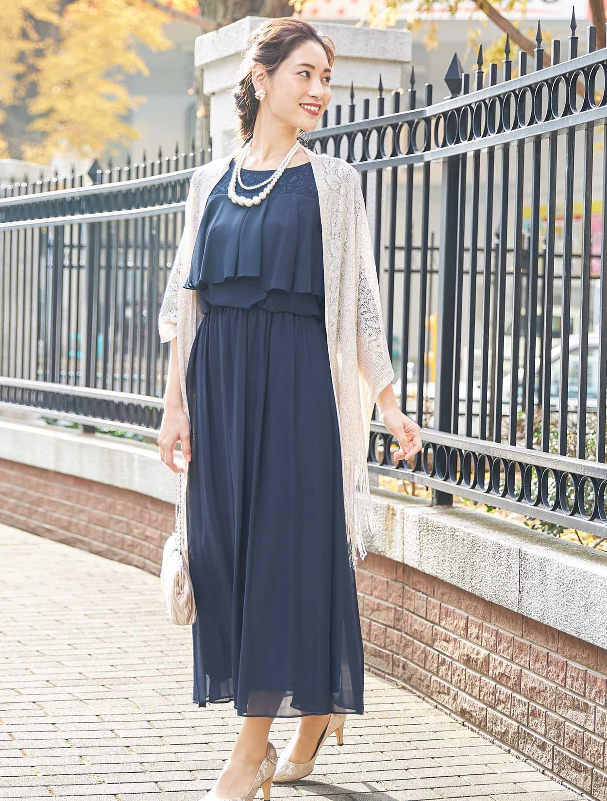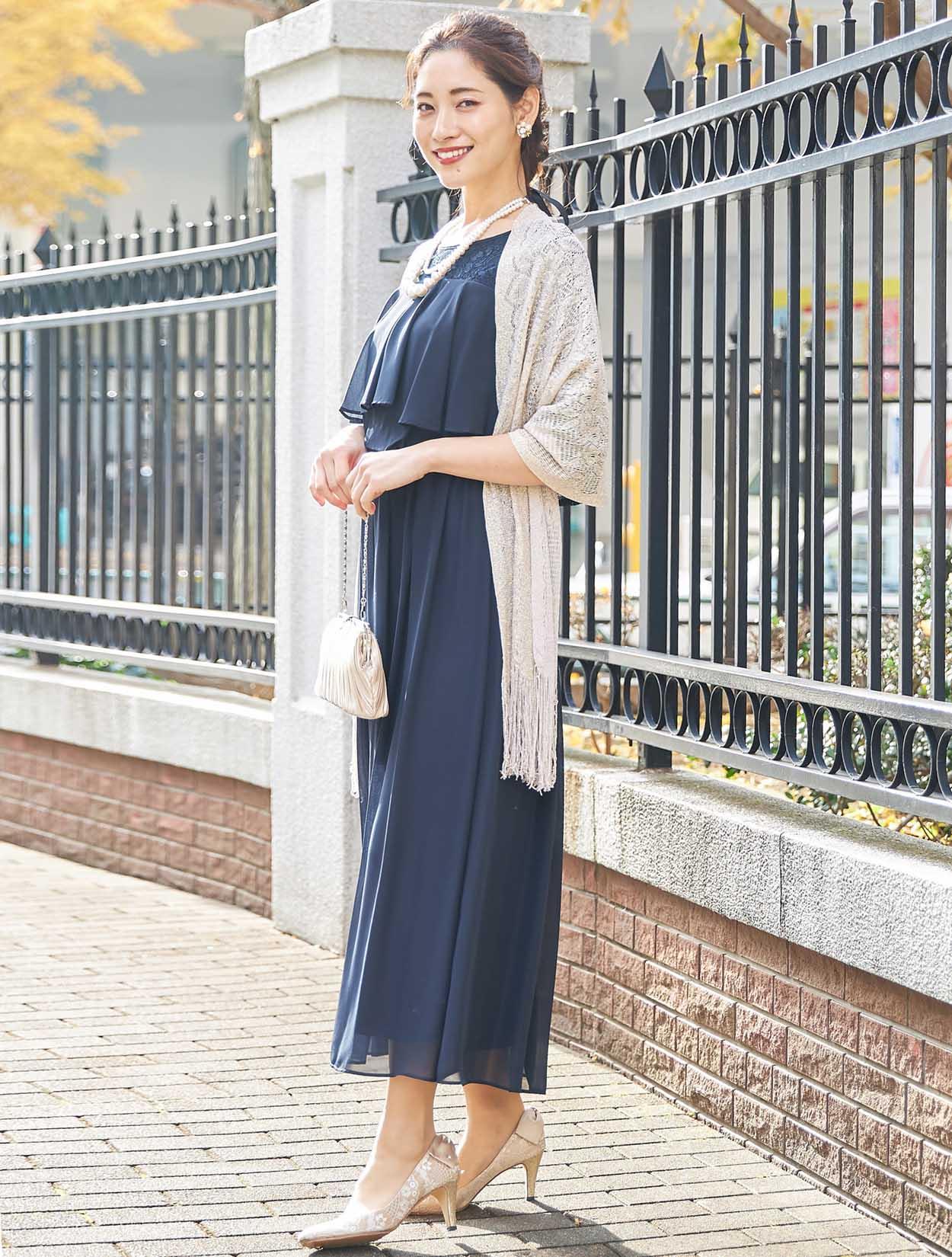 ■濃紺のドレスにゴールドのラメストールが華やかさをプラス。ご親族様にもおすすめです。お袖付きのドレスなので、ストールは必要に応じてお使い頂けます。