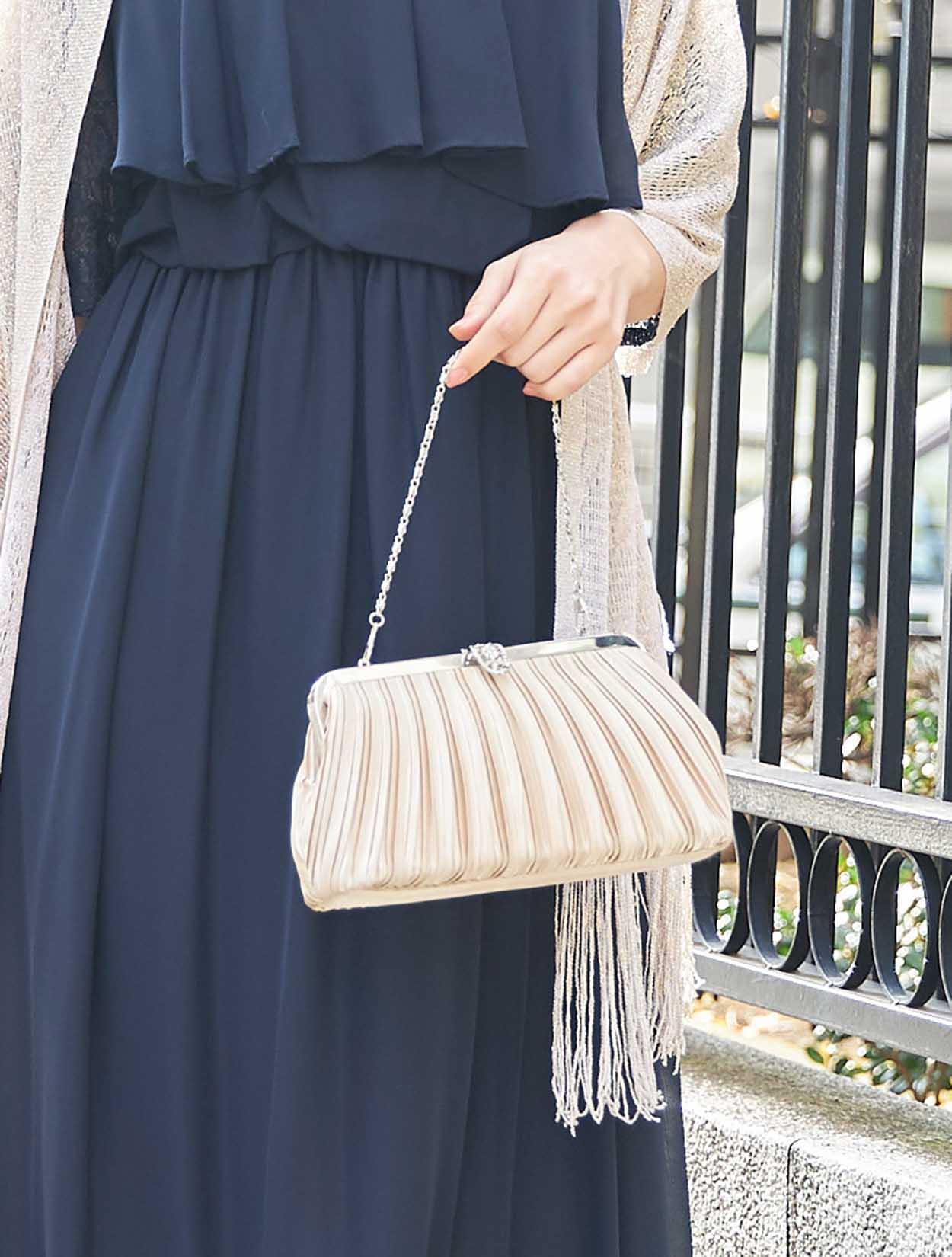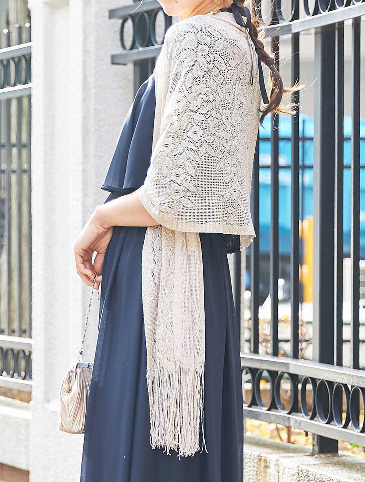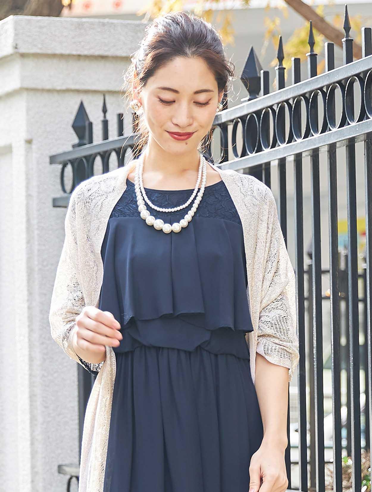 ■濃紺のドレスにゴールドのラメストールが華やかさをプラス。ご親族様にもおすすめです。お袖付きのドレスなので、ストールは必要に応じてお使い頂けます。