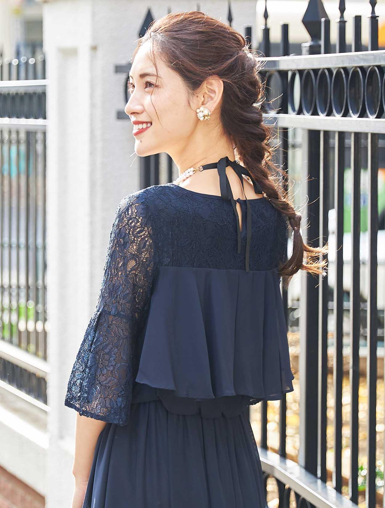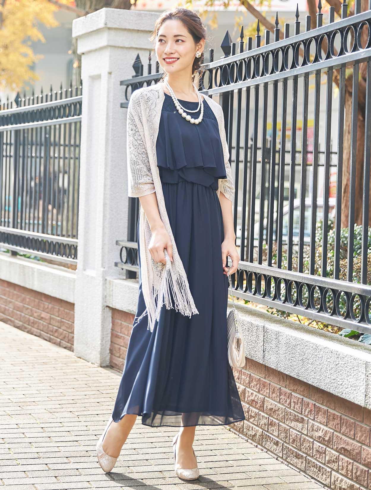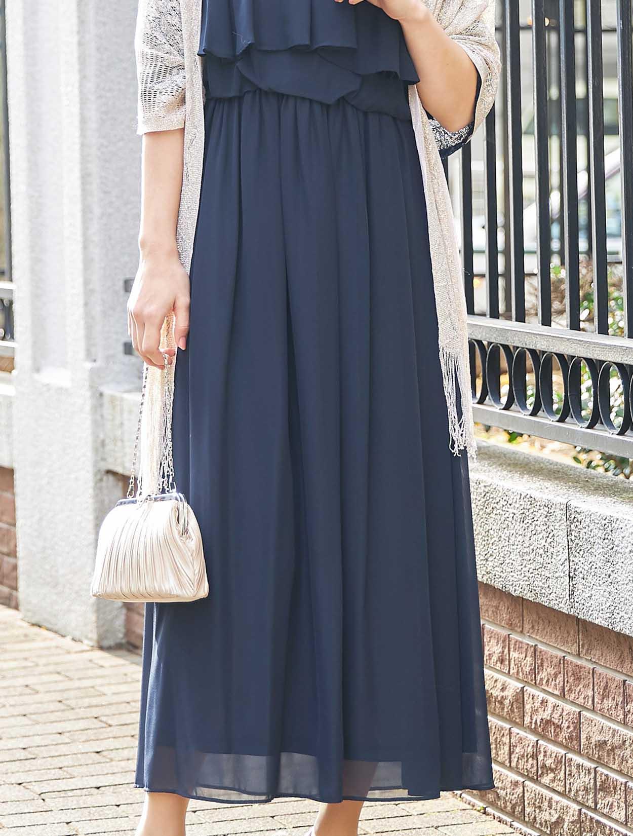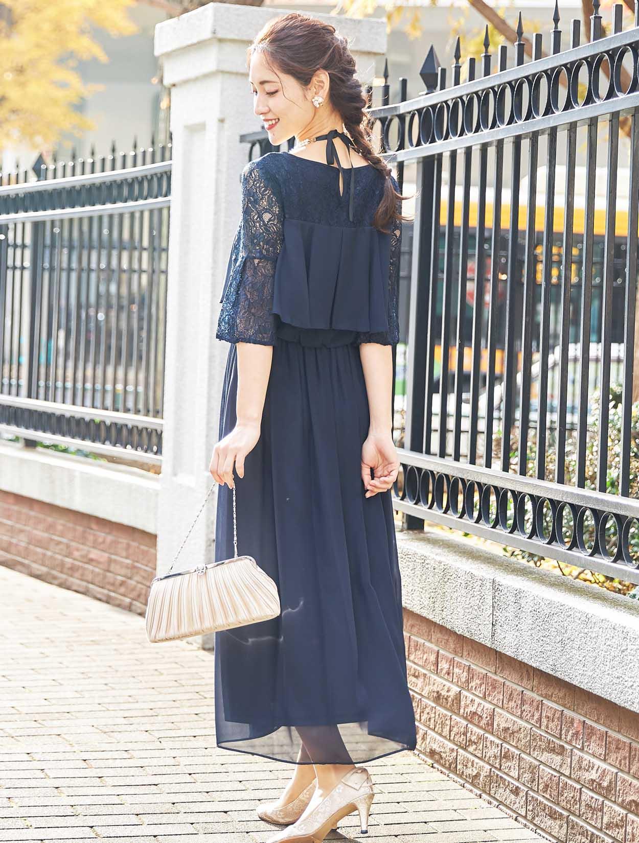 ■20代の方から40代の方まで、幅広く人気のあるネイビーのロングドレスです。