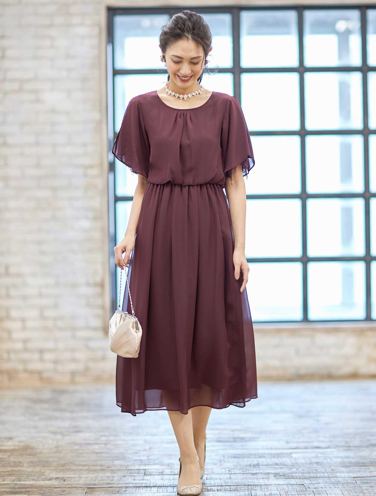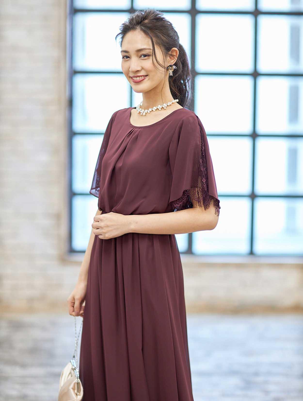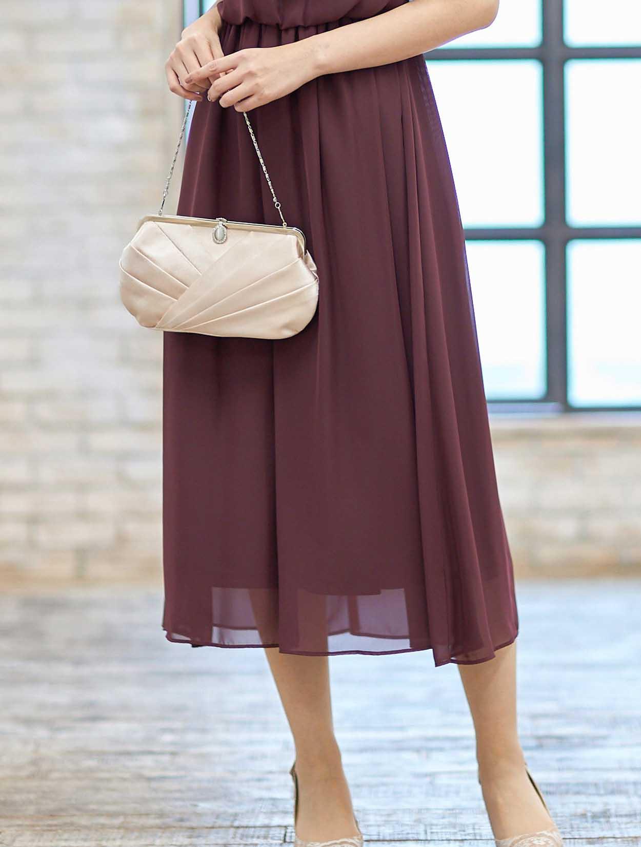 ■落ち着いたボルドーのドレスも、光沢あるベージュのバッグと合わせると華やかで明るい印象に。スカラップ調のネックレスがお顔周りを明るくしてくれます。