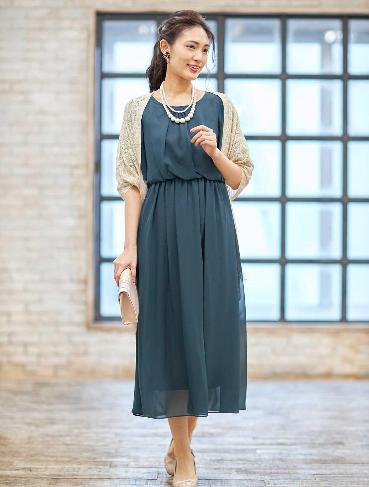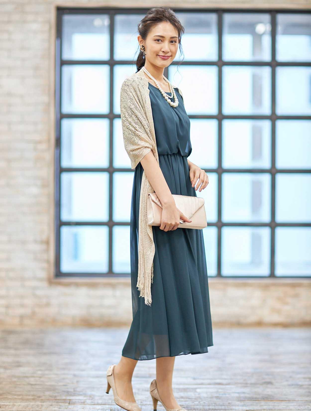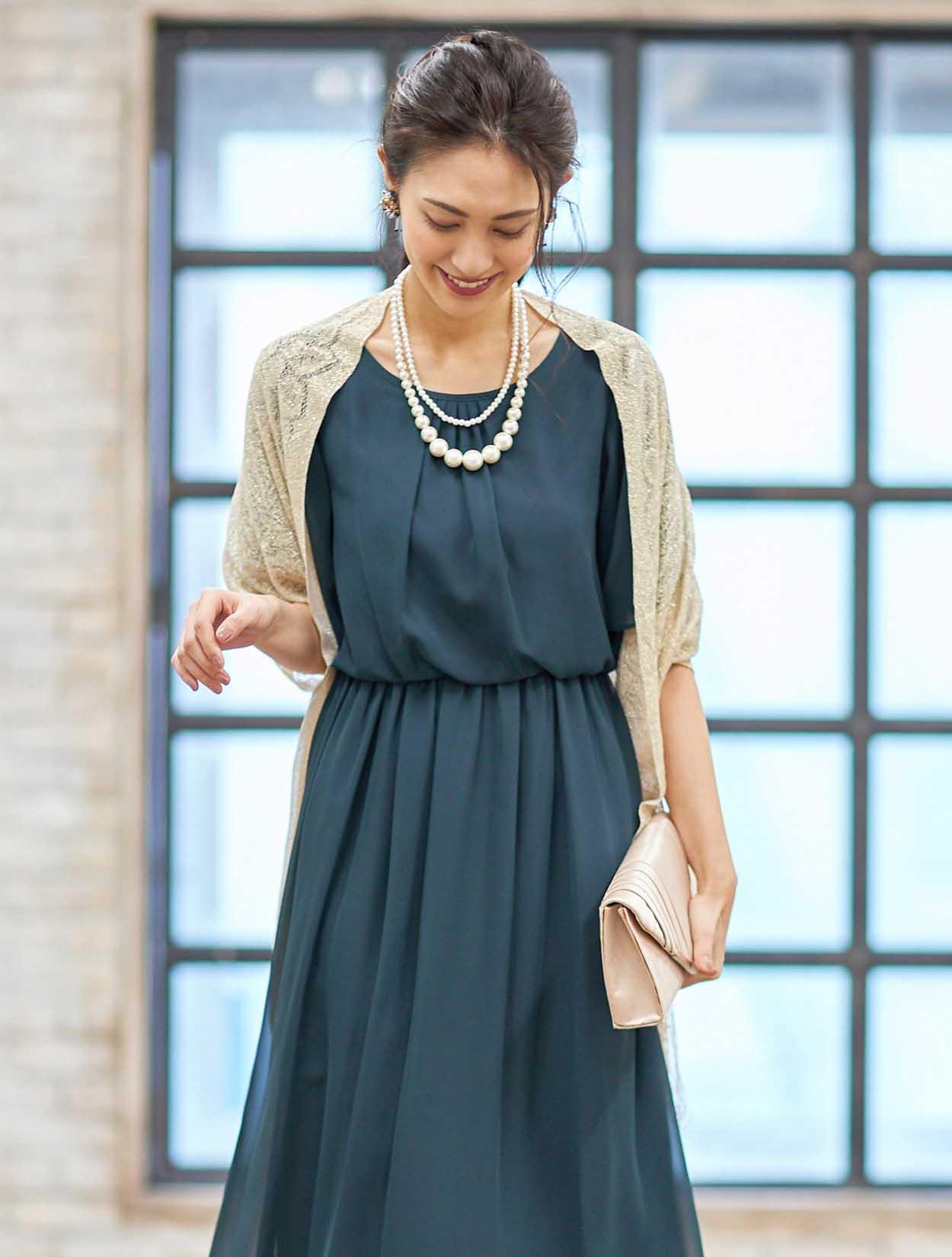 ■落ち着きのあるダークグリーンのドレスに華やかなゴールドのストールを合わせたコーディネートです。