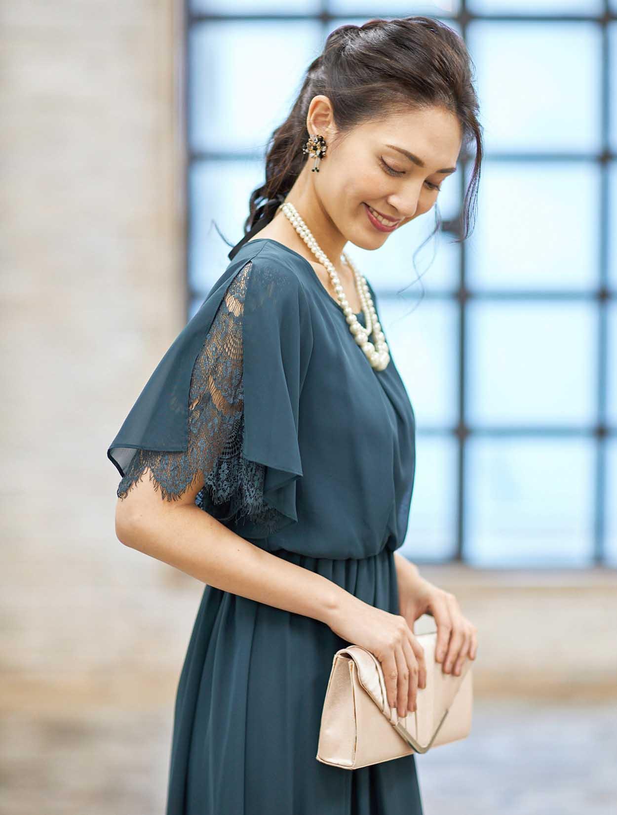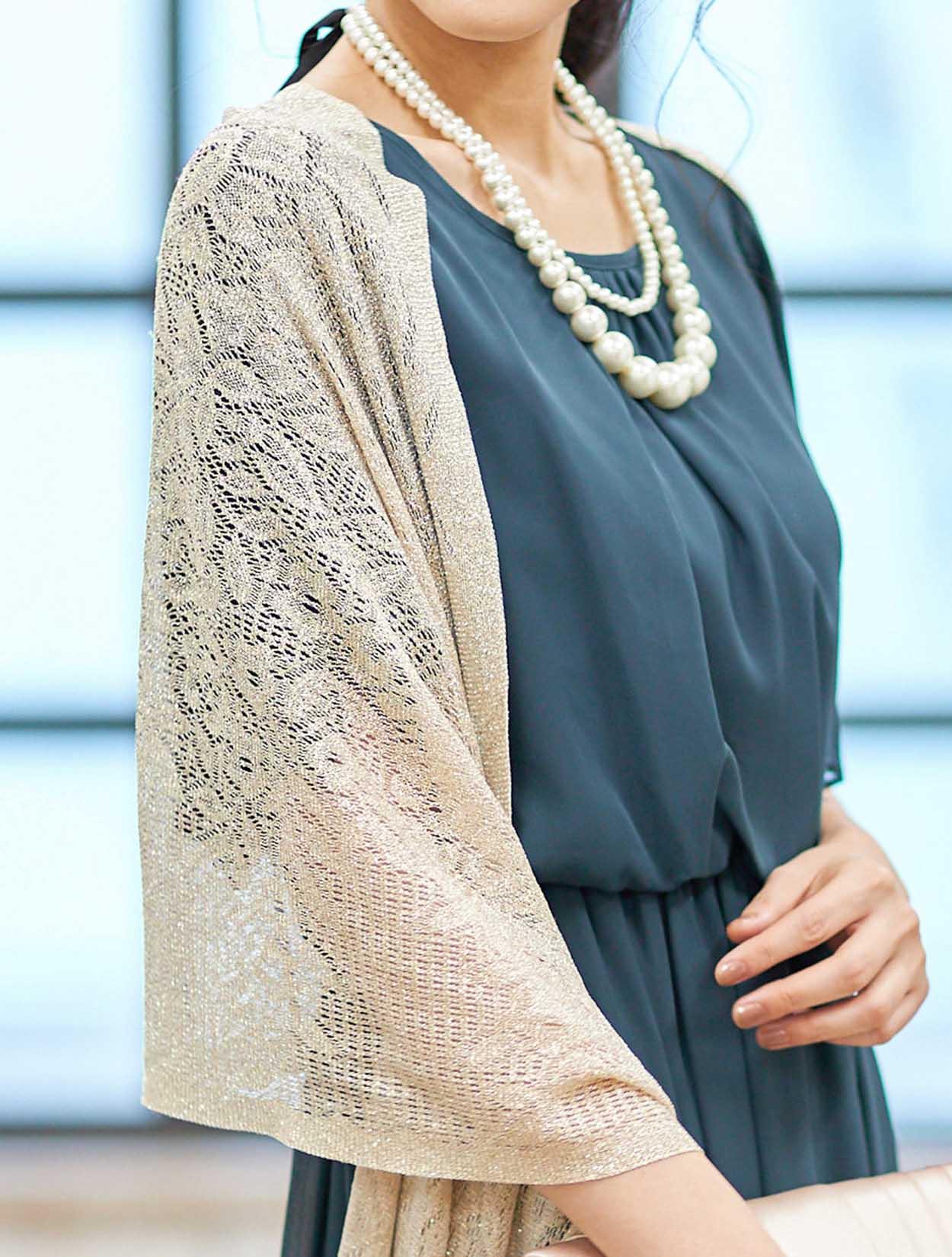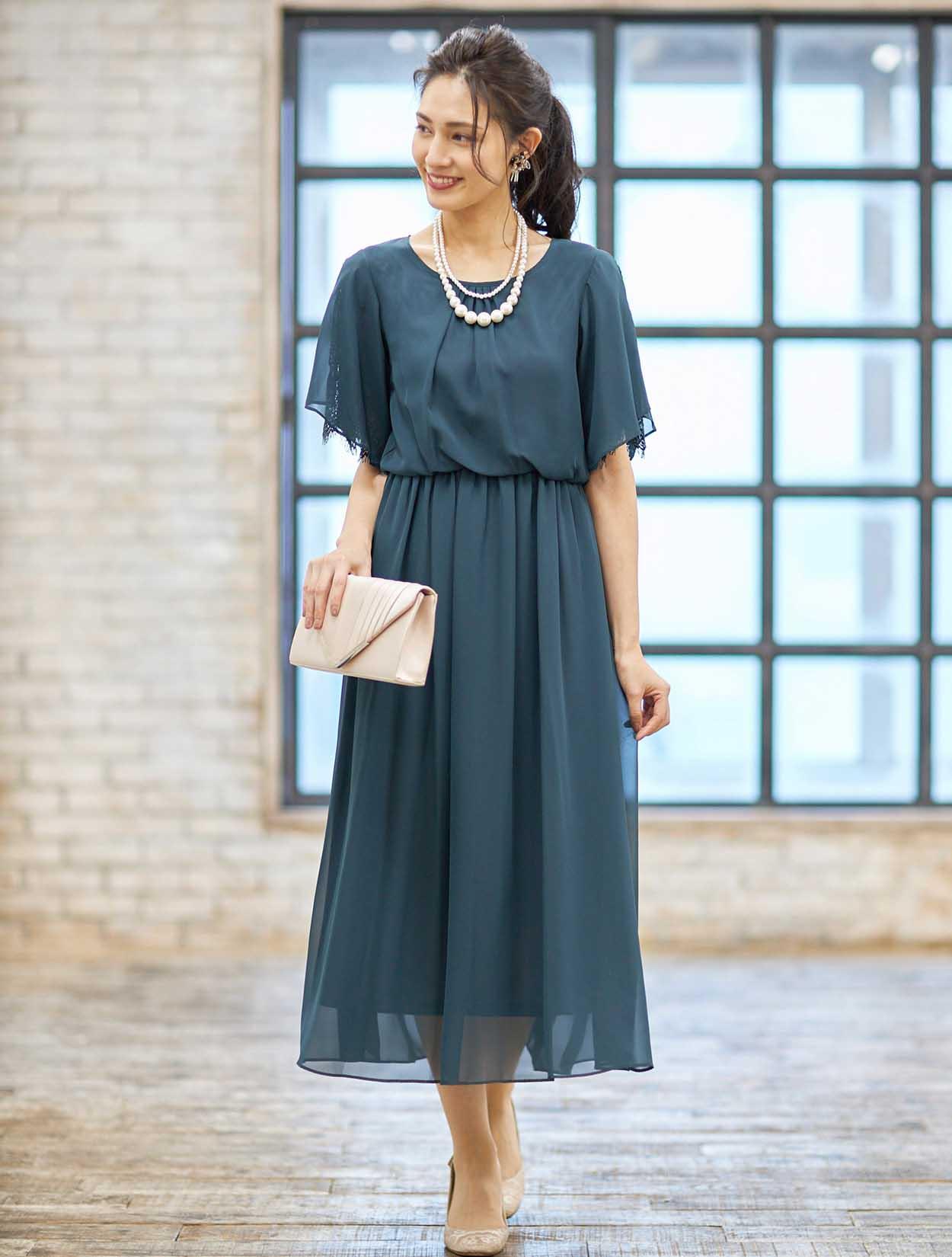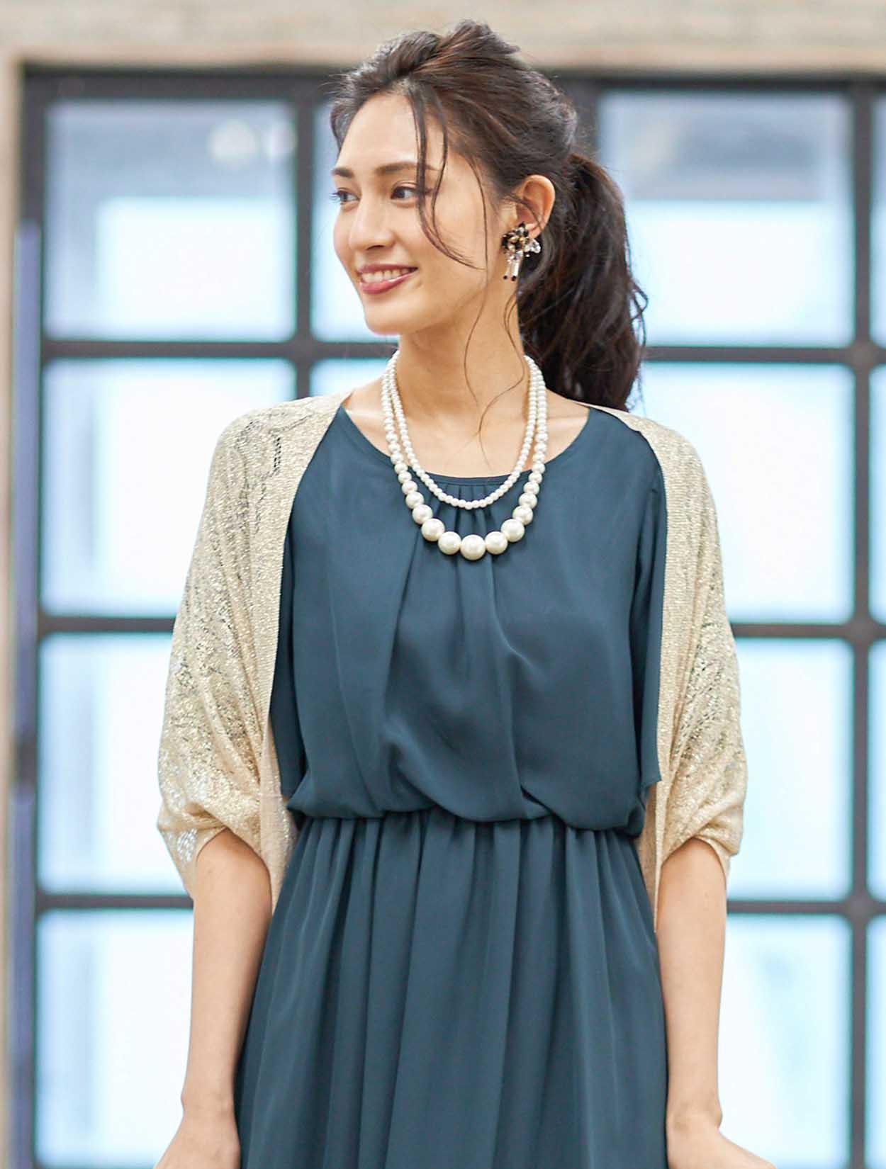 ■落ち着きのあるダークグリーンのドレスに華やかなゴールドのストールを合わせたコーディネートです。