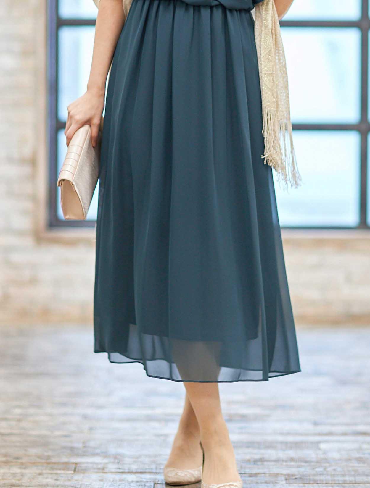 ■軽さのあるシフォン素材で、歩く度に裾がひらひらと揺れ、エレガントな印象です。