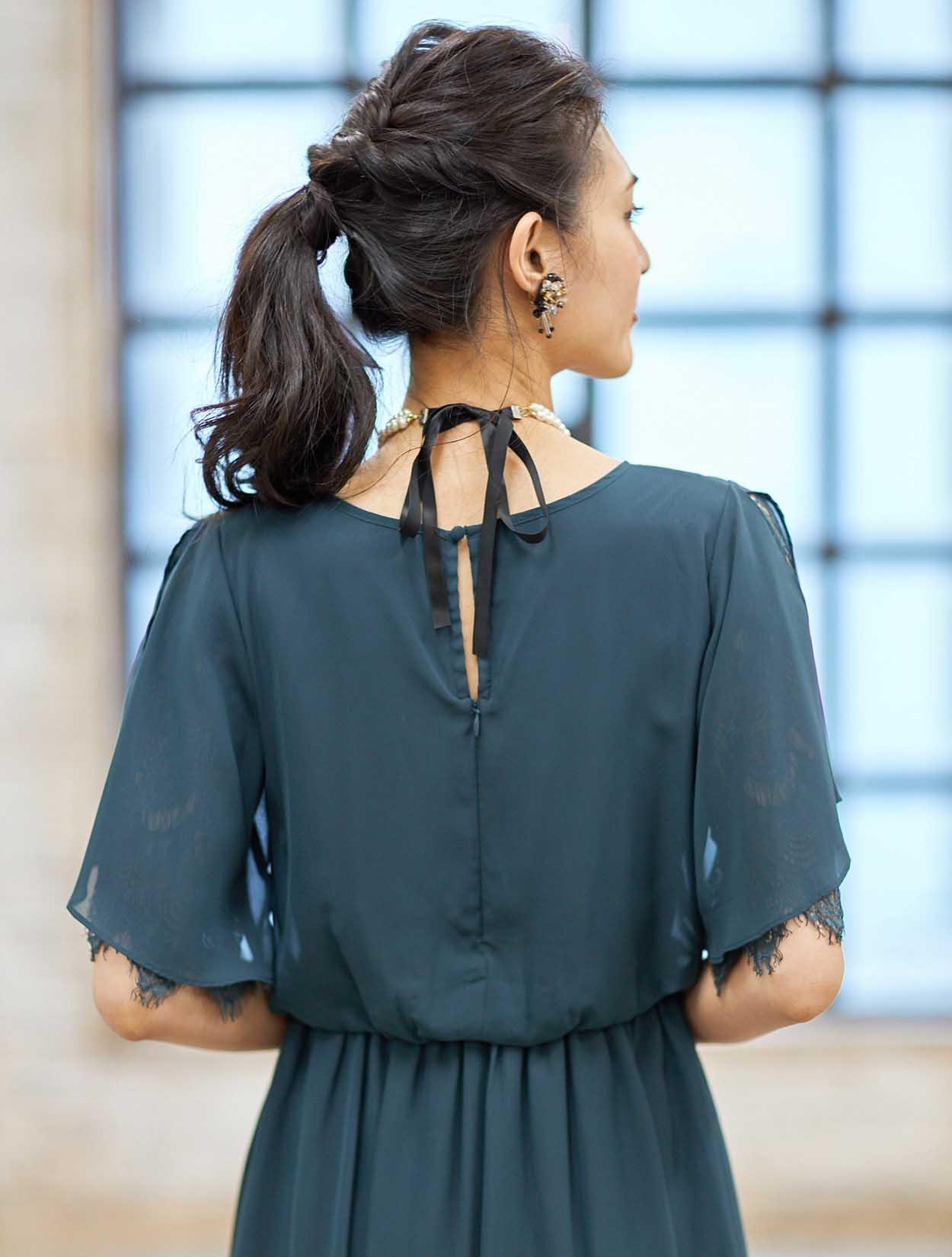 ■袖のスリットの下にはレース生地があり、さりげない透け感で女性らしさを引き立てます。