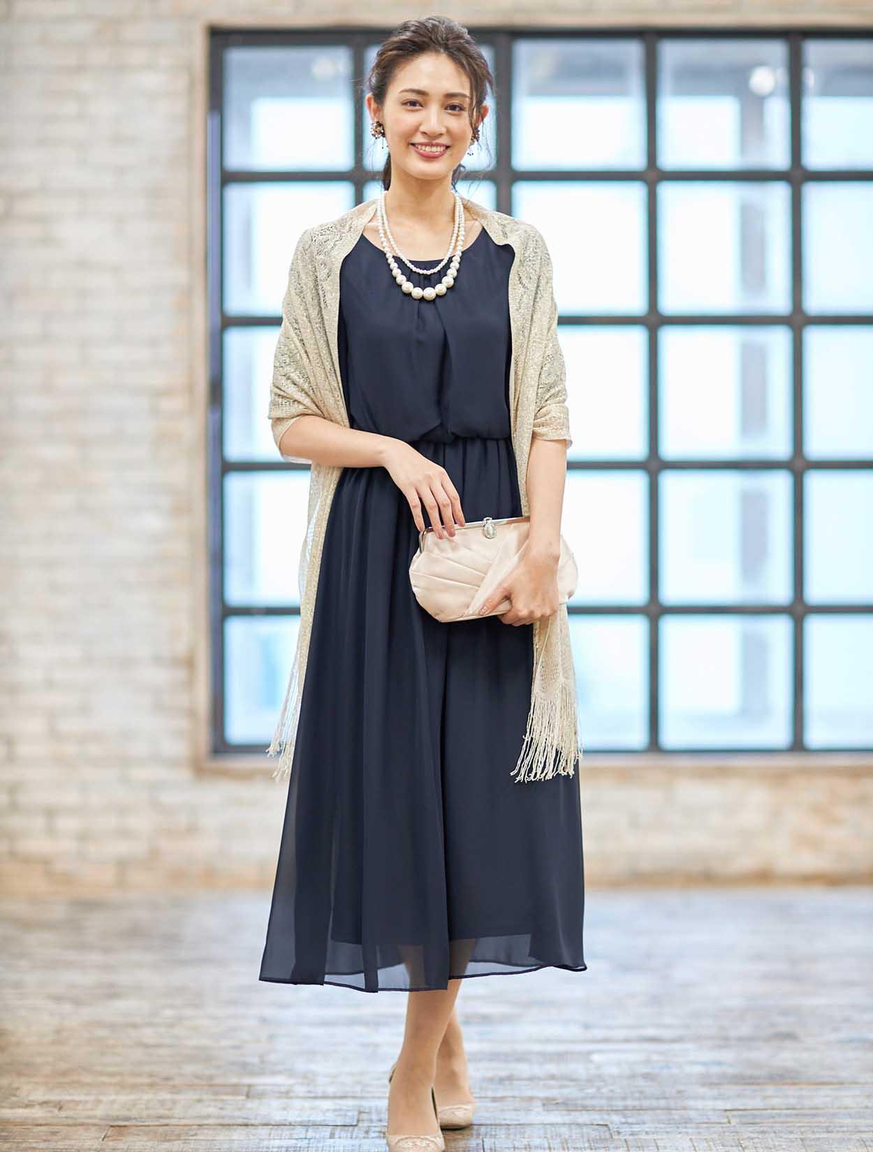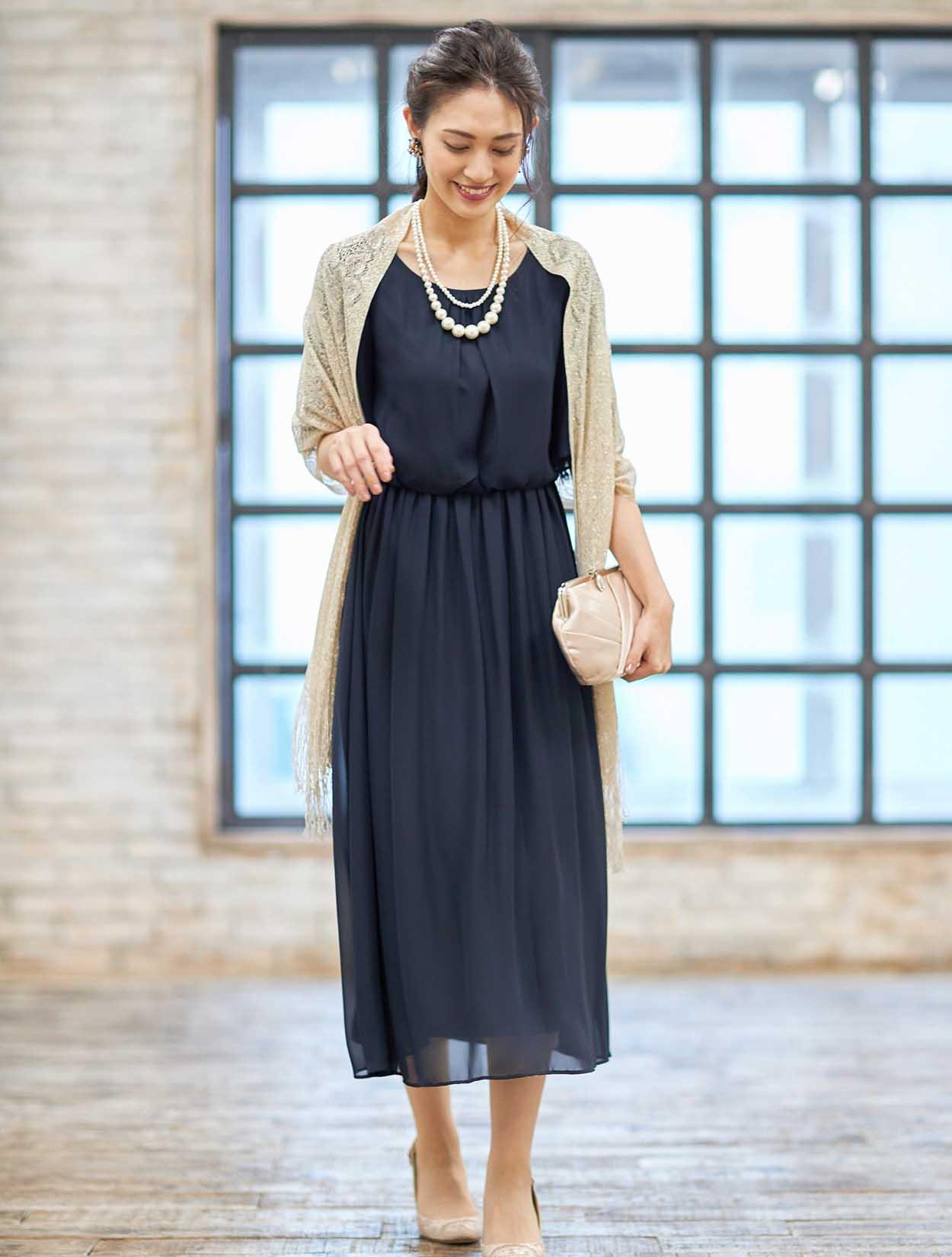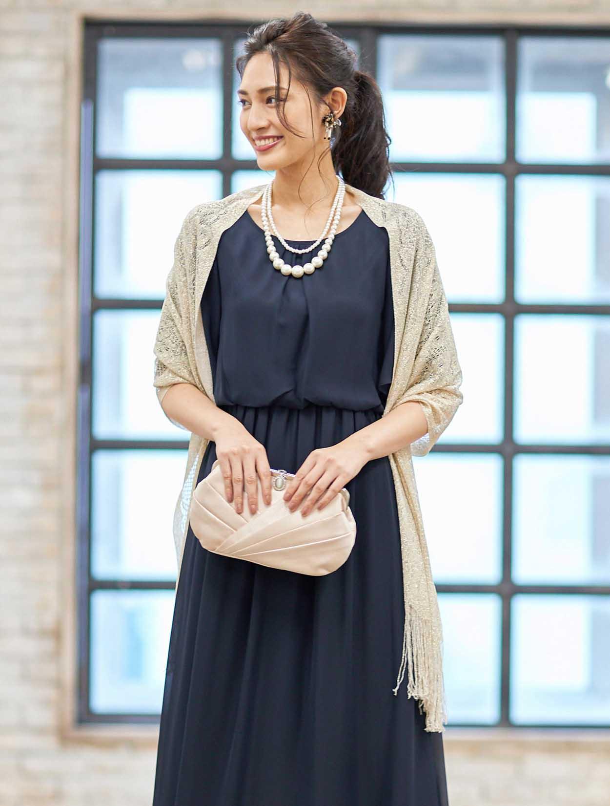 ■定番カラーのネイビーのドレスにゴールドのストールを合わせた安心のコーディネート。