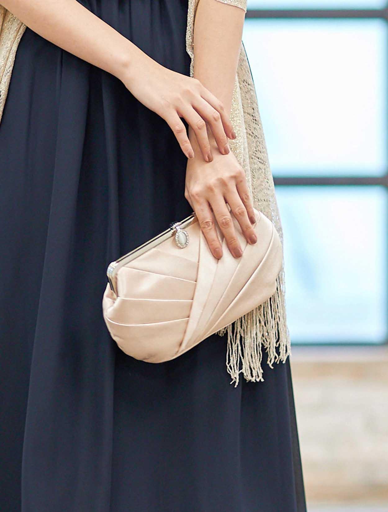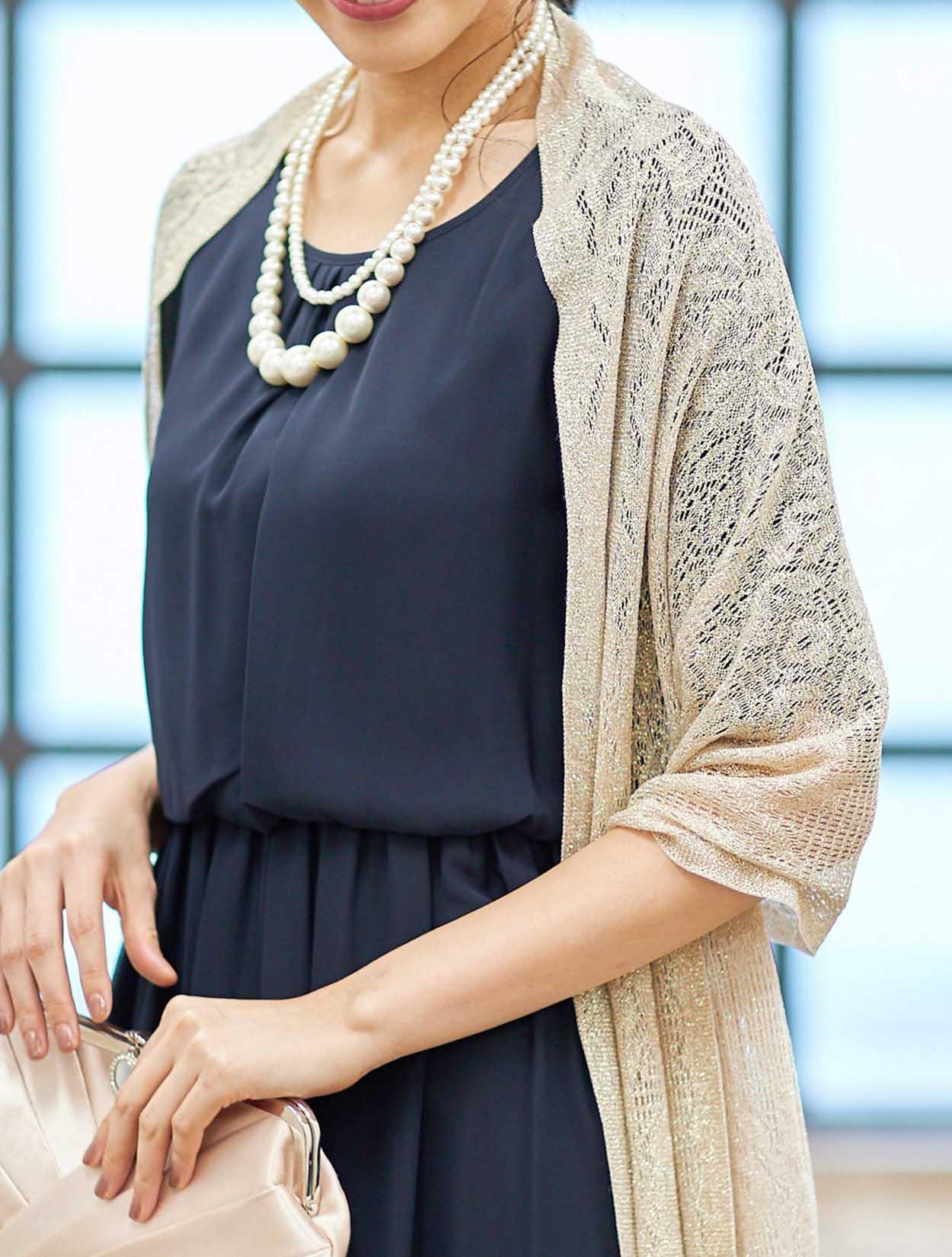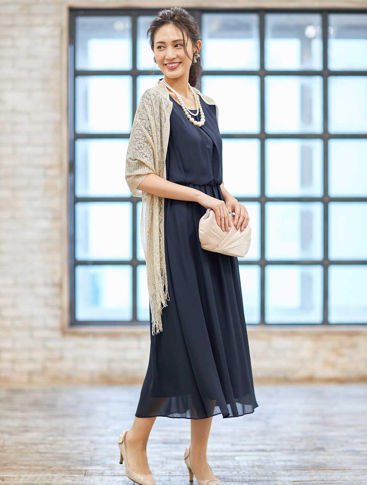 ■定番カラーのネイビーのドレスにゴールドのストールを合わせた安心のコーディネート。