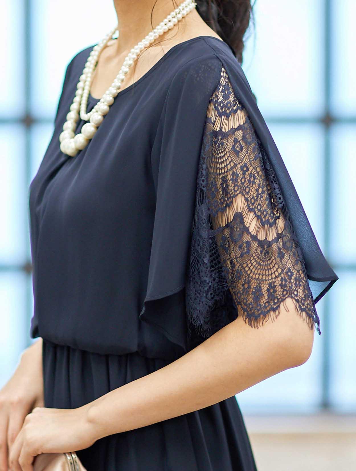 ■袖のスリットの下にはレース生地があり、さりげない透け感で女性らしさを引き立てます。