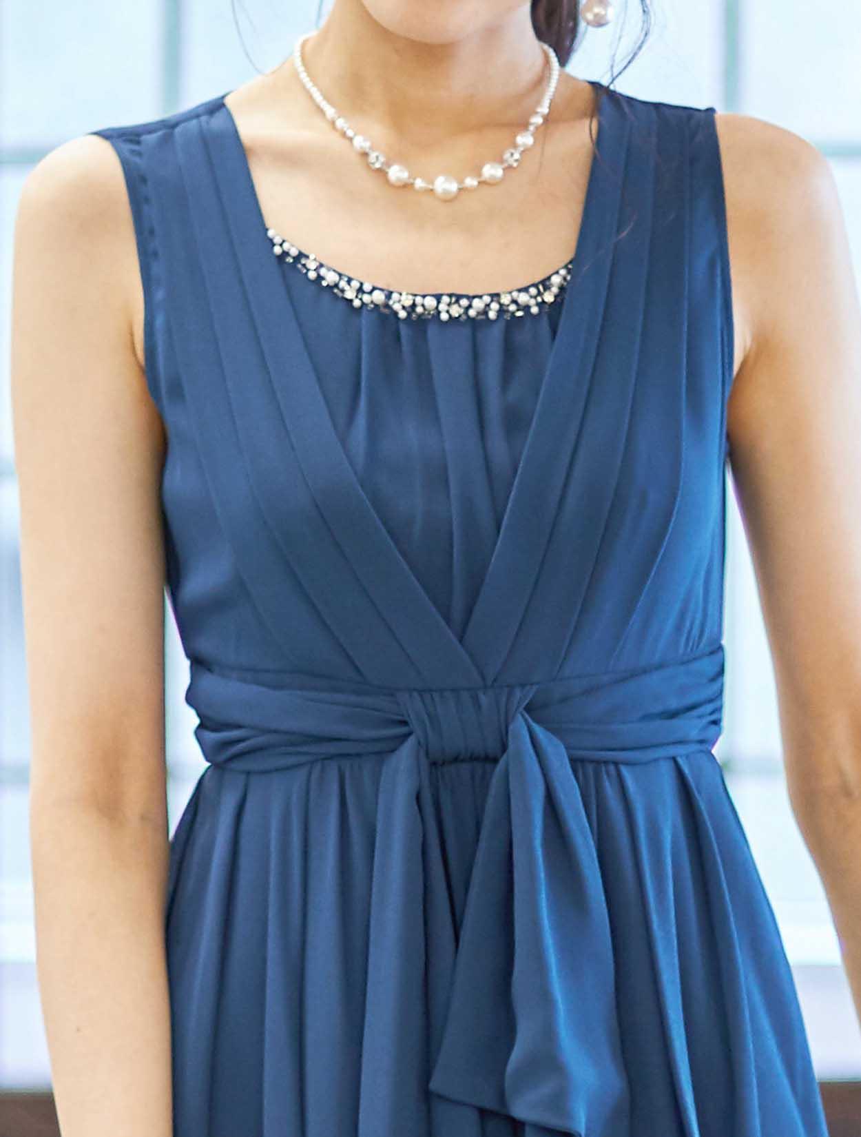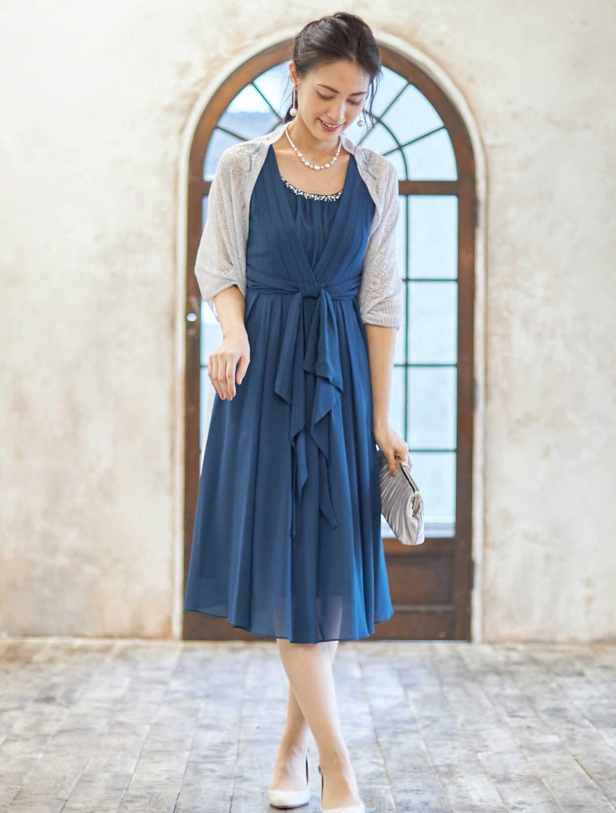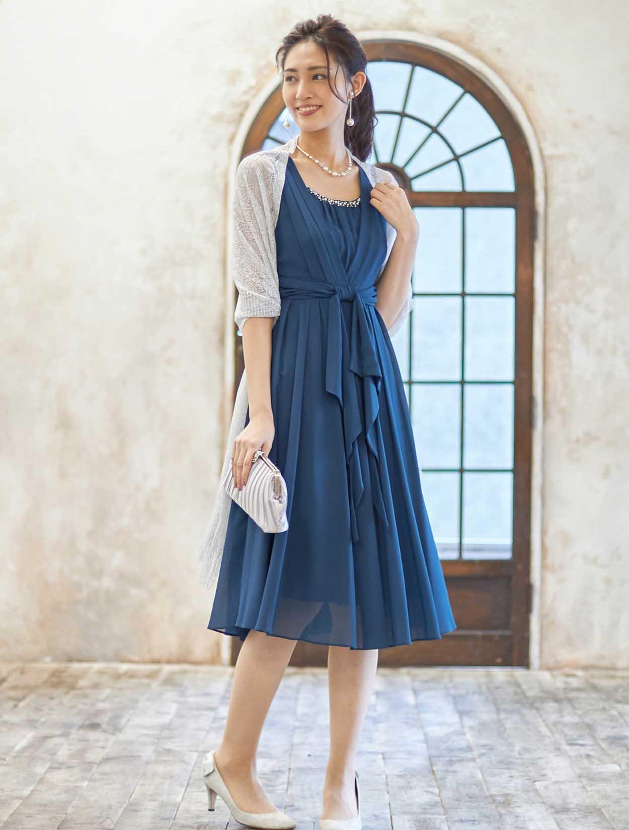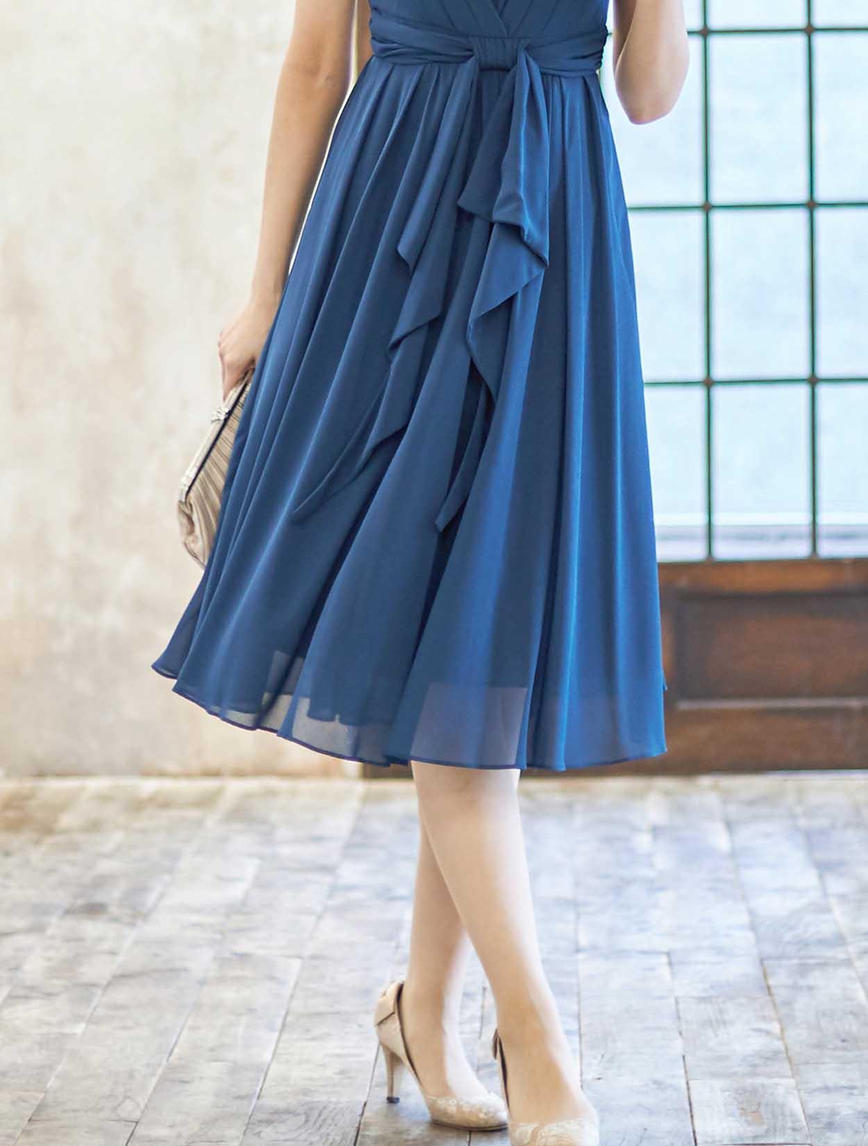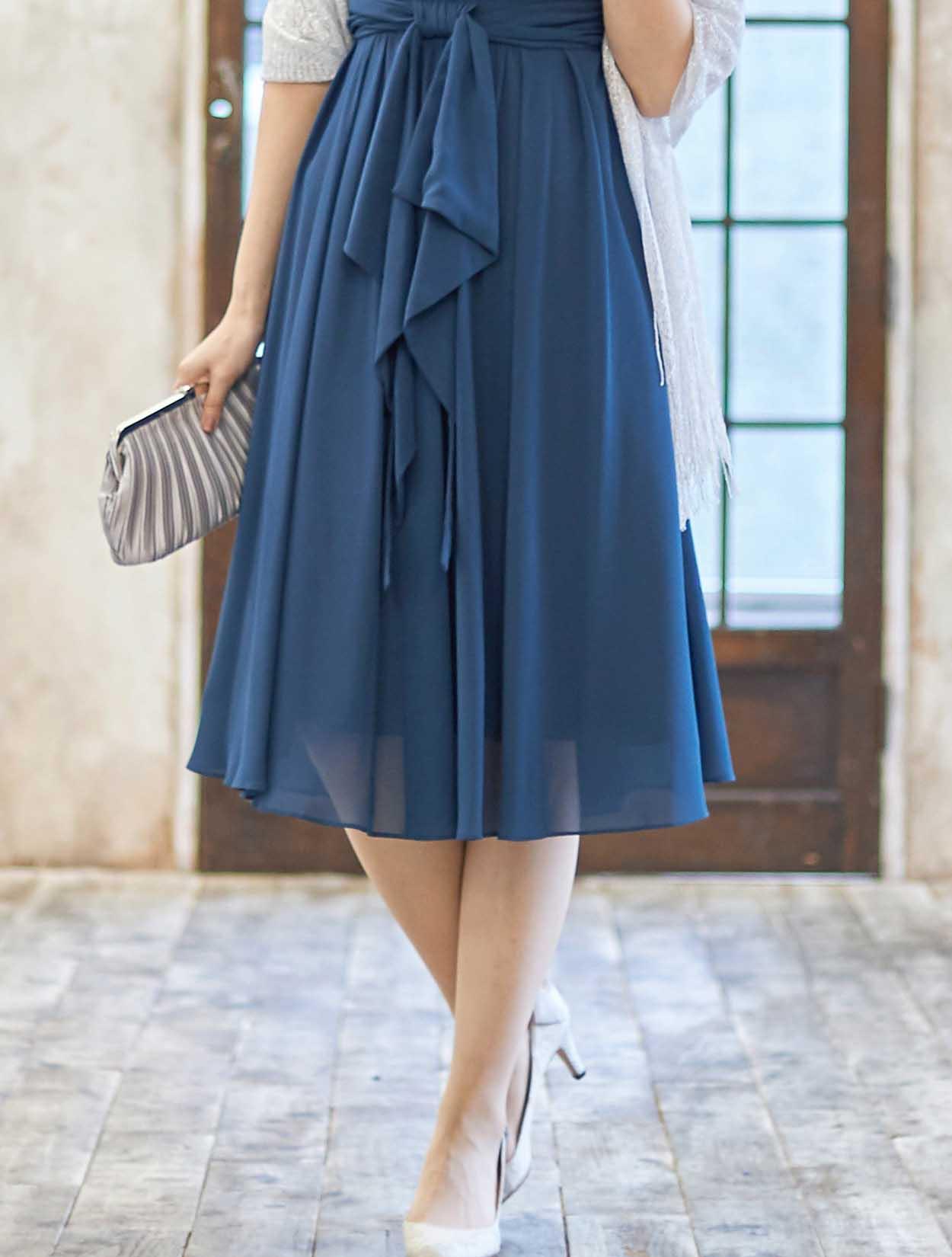■胸下のラッフルリボンがポイントのミディ丈ドレス。気になるウエスト周りをスッキリと見せてくれます。